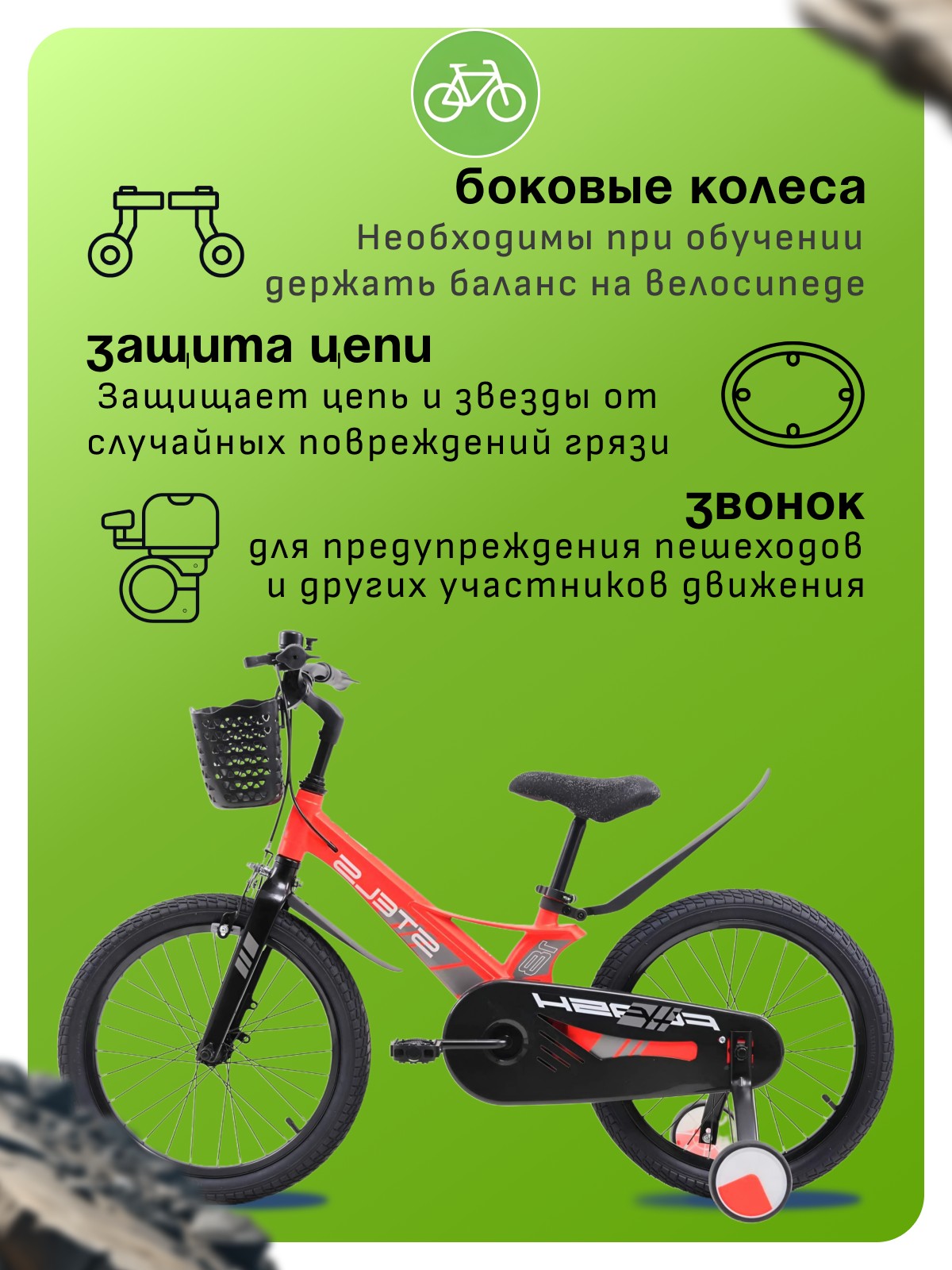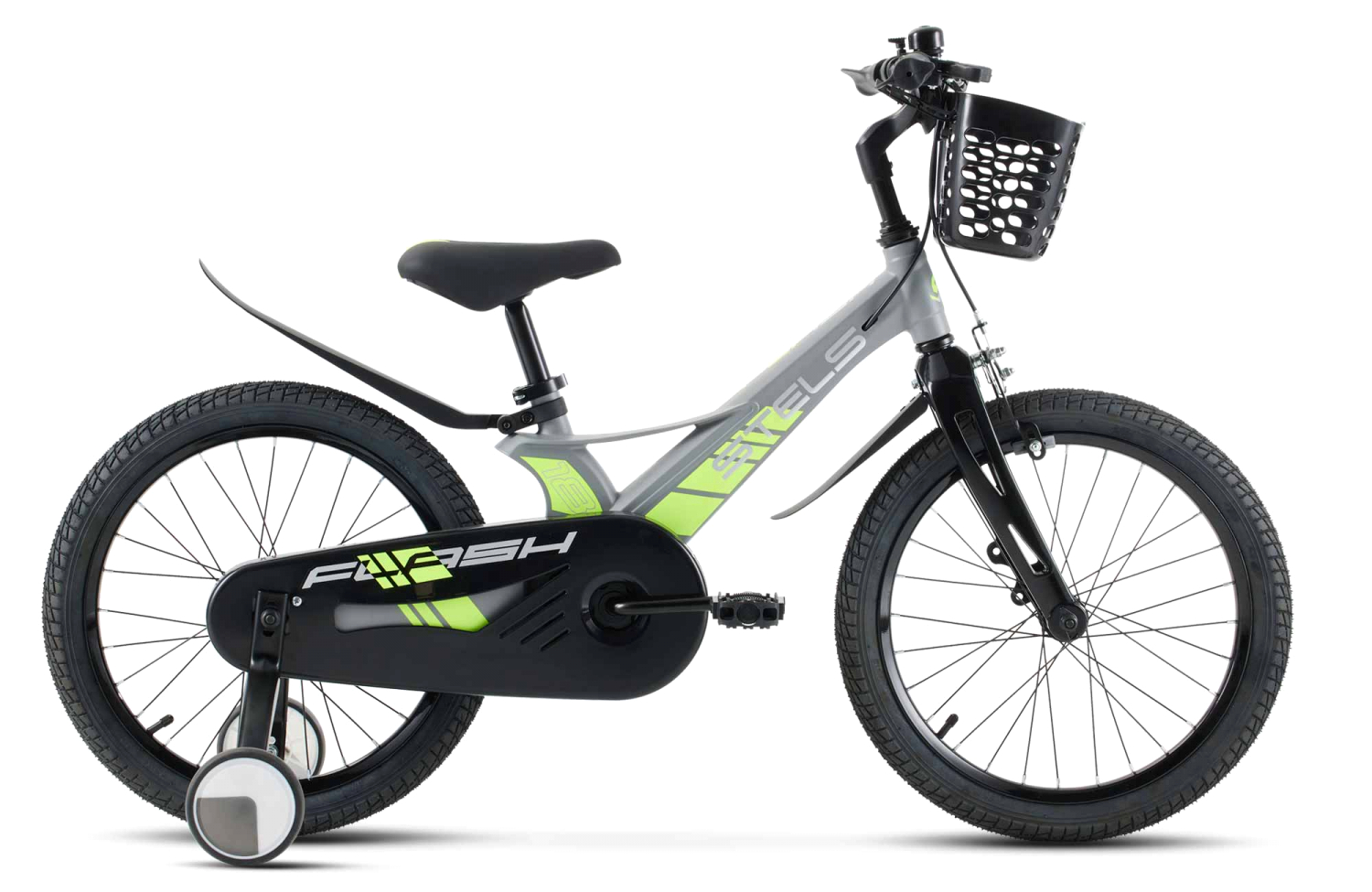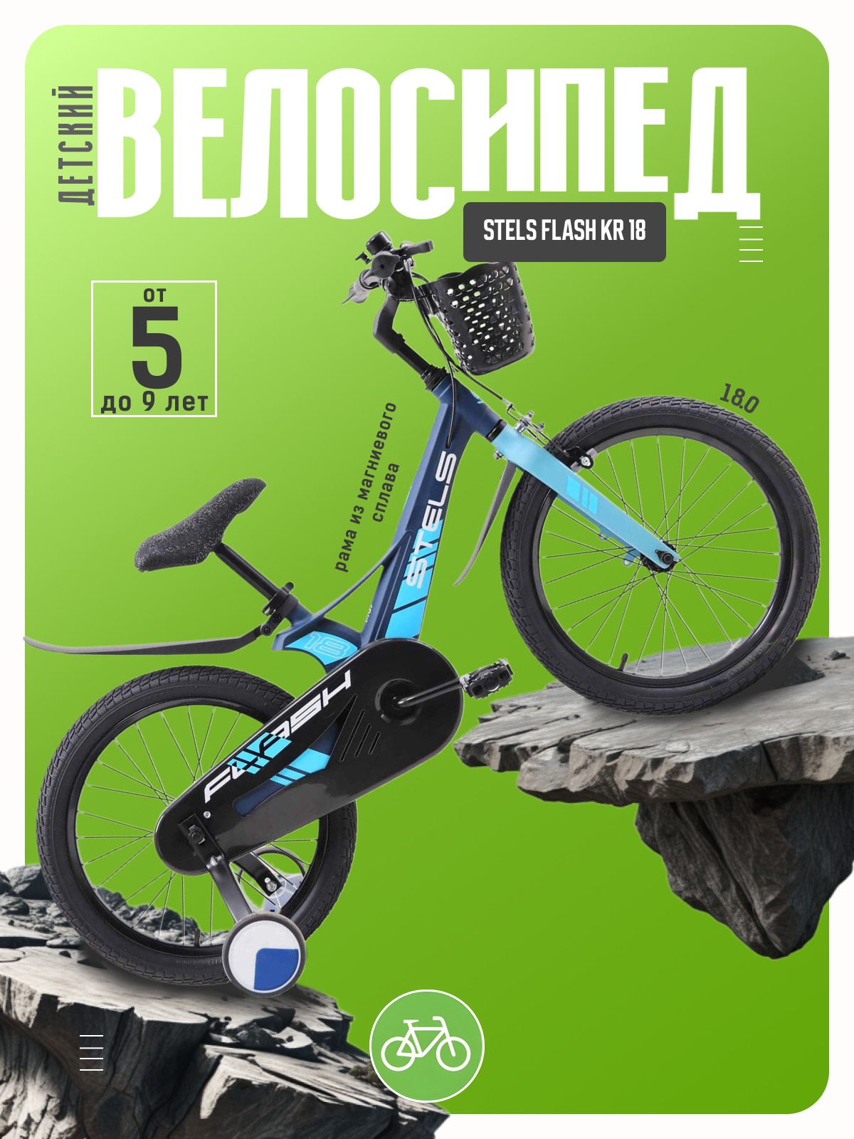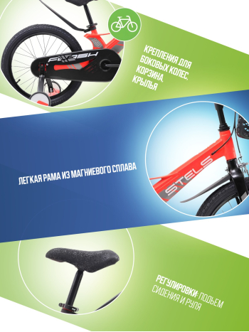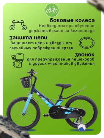 Велосипед, предназначенный для детей в возрасте от четырех до восьми лет, без переключения передач. Технические особенности: легкая рама из магниевого сплава (скрытая проводка), жесткая вилка из магниевого сплава (крепление калипера IS), одинарные стальные обода (под AV ниппель), передний тормоз - ободной клещевой, задний тормоз - барабанный (роллерный), полная защита цепи, пластиковые крылья, съемные боковые колеса, передняя корзинка, звонок. Подходит для обучения и прогулочного катания в городских условиях. Диаметр колес - 18 дюймов. Вес - 9,5 кг.