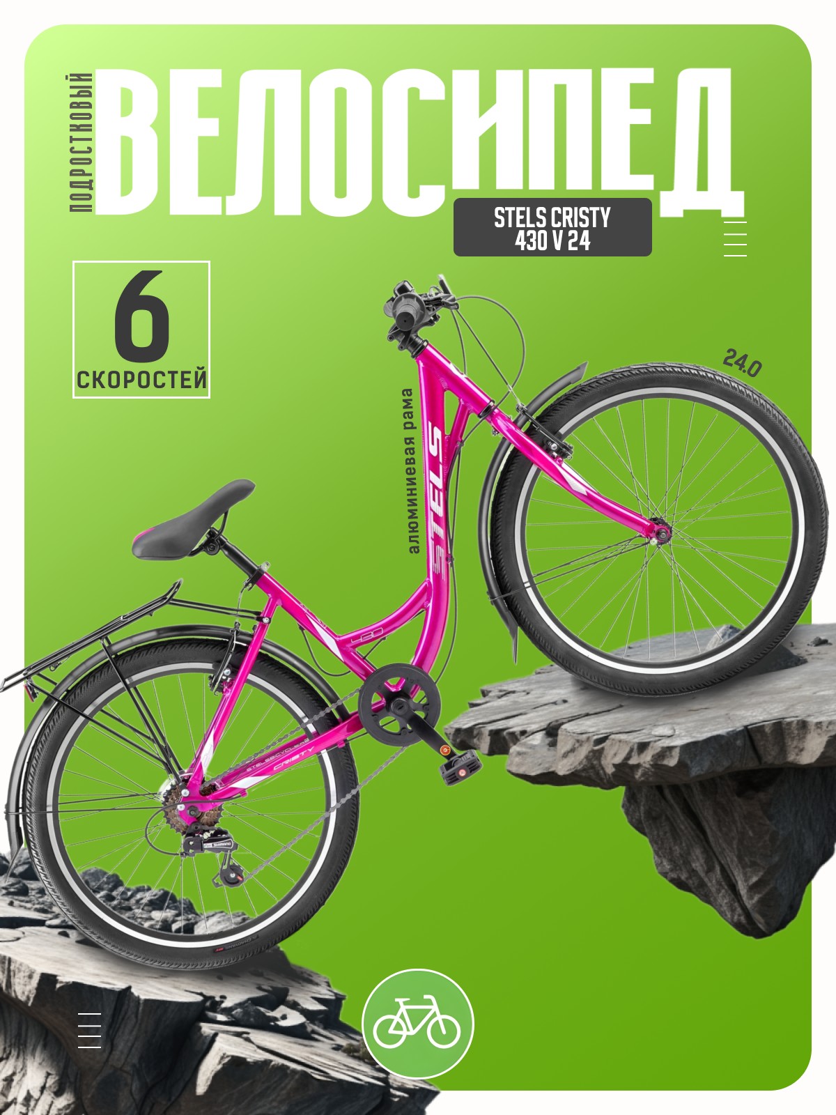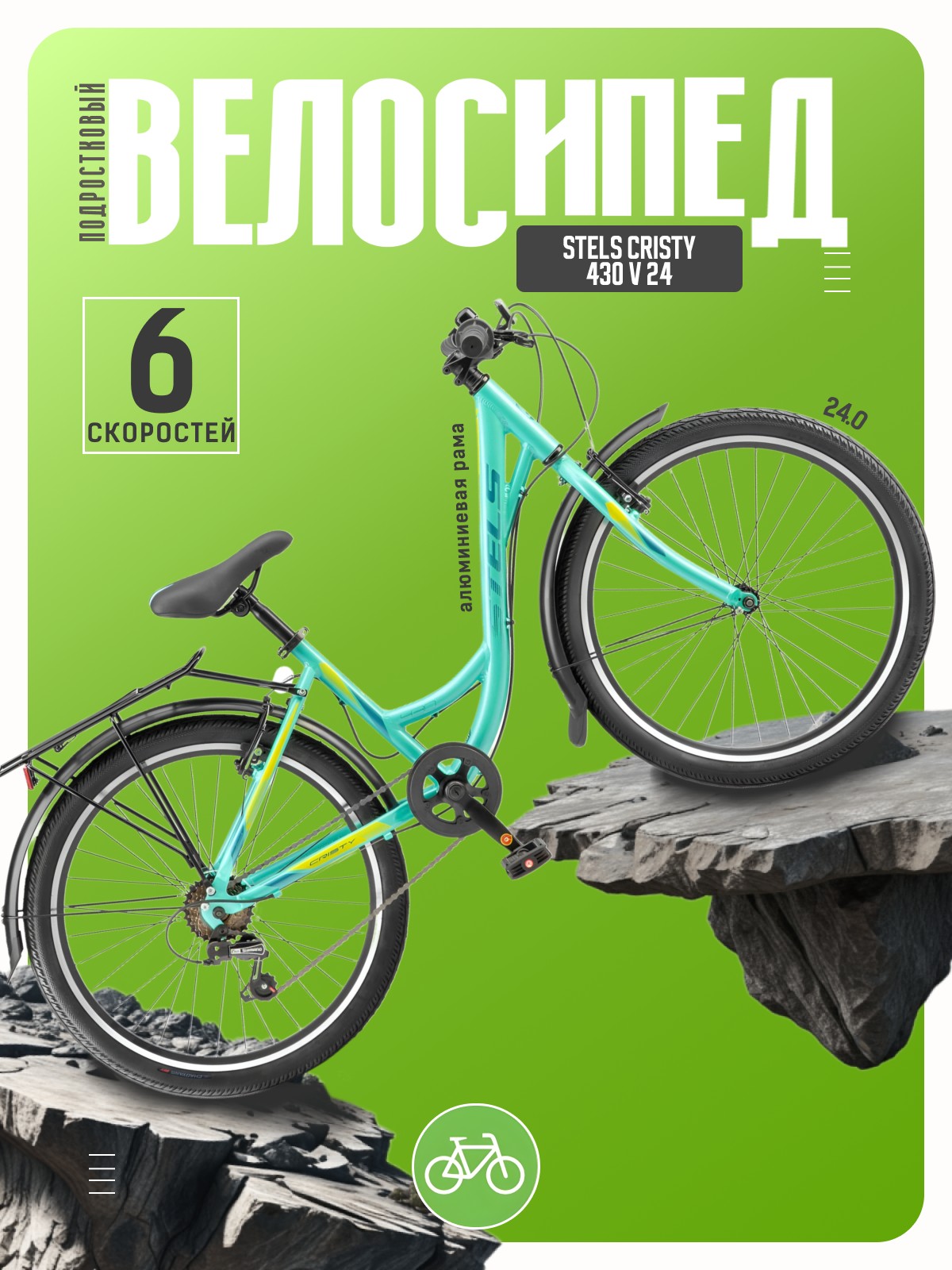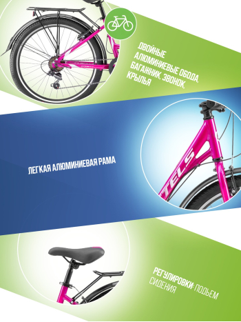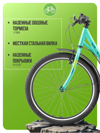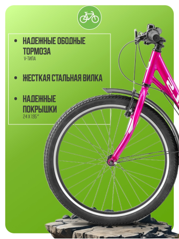 Велосипед, предназначенный для детей в возрасте от восьми до тринадцати лет, с оборудованием начального класса Shimano, 6 скоростей. Технические особенности: легкая алюминиевая рама (заниженная геометрия, открытая проводка, прямой рулевой стакан, кареточный стакан BSA, интегрированный петух), жесткая стальная вилка, двойные алюминиевые обода (под AV ниппель), надежные ободные тормоза V-типа, защита цепи, полноразмерные крылья с брызговиками, задний багажник с зажимом, катафоты, звонок. Подходит для прогулочного катания в городских условиях и по несложным маршрутам в лесу. Диаметр колес - 24 дюйма. Вес - 15,54 кг.