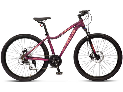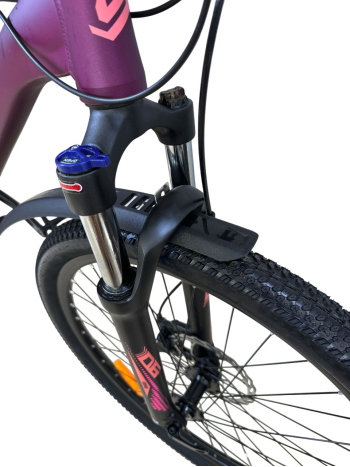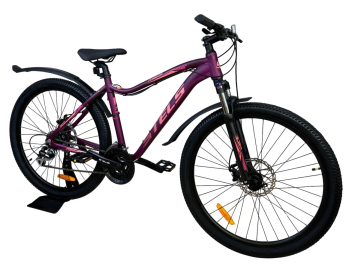 Женский горный велосипед с оборудованием любительского класса Shimano, 21 скорость. Технические особенности: легкая алюминиевая рама женская геометрия, открытая проводка, прямой рулевой стакан, кареточный стакан BSA, съемный петух), амортизационная вилка (пружинно-эластомерная, ход 80 мм, блокировка, регулировка преднагрузки, крепление калипера Post Mount), двойные алюминиевые обода (под AV ниппель), дисковые механические тормоза (роторы 180/160 мм), защита цепи, пластиковые крылья, подножка, катафоты. Подходит для активной езды по различным дорогам и пересеченной местности. Диаметр колес - 27,5 дюймов. Вес - 15,46 кг.