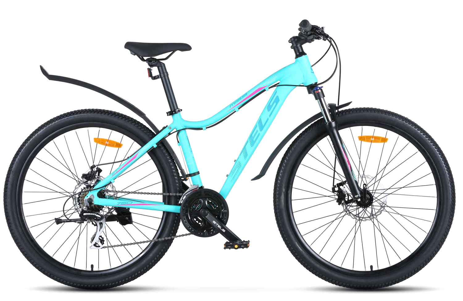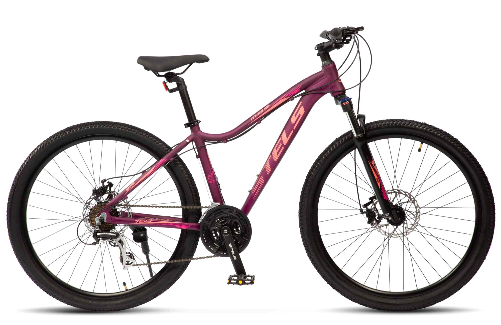 Женский горный велосипед с оборудованием любительского класса Shimano, 21 скорость. Технические особенности: легкая алюминиевая рама женская геометрия, открытая проводка, прямой рулевой стакан, кареточный стакан BSA, съемный петух), амортизационная вилка (пружинно-эластомерная, ход 80 мм, блокировка, регулировка преднагрузки, крепление калипера Post Mount), двойные алюминиевые обода (под AV ниппель), дисковые механические тормоза (роторы 180/160 мм), защита цепи, пластиковые крылья, подножка, катафоты. Подходит для активной езды по различным дорогам и пересеченной местности. Диаметр колес - 27,5 дюймов. Вес - 15,46 кг.