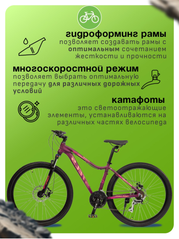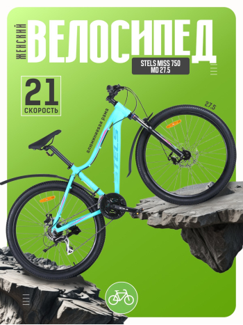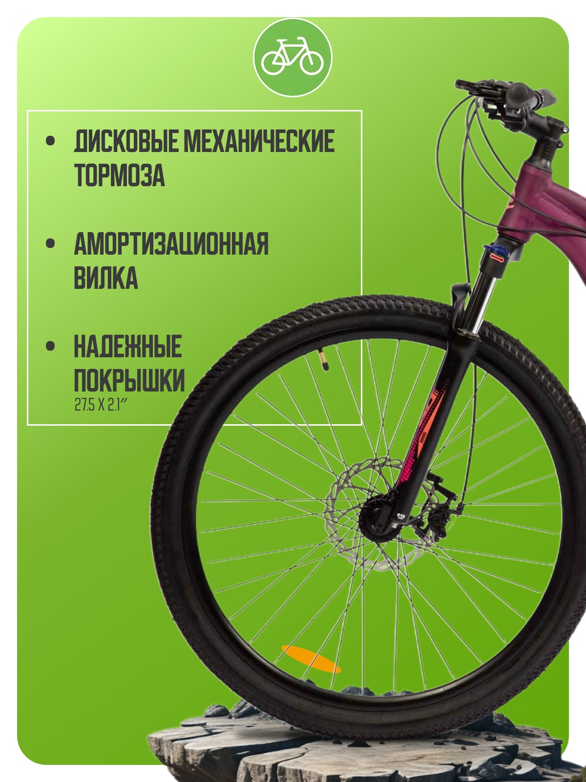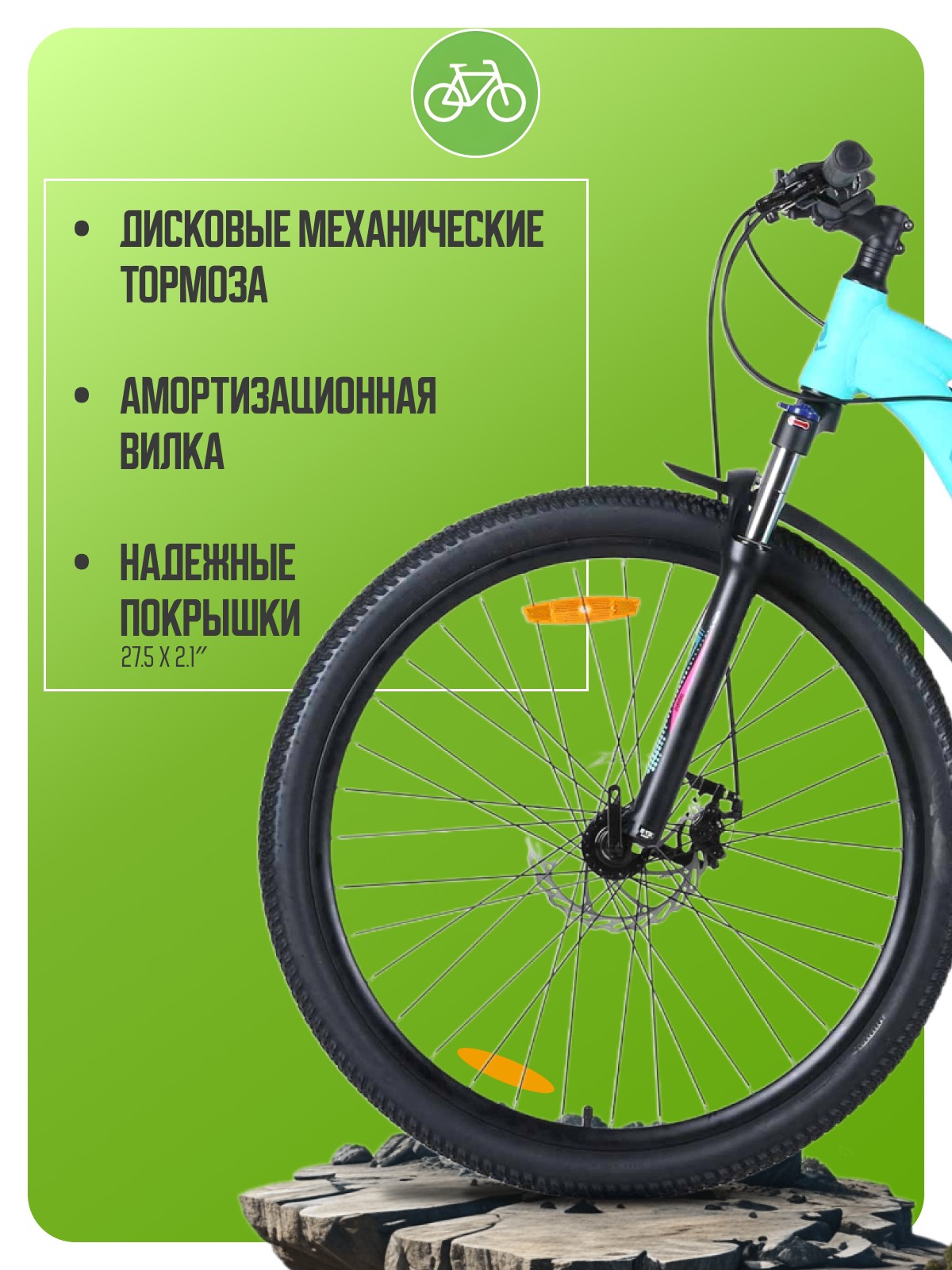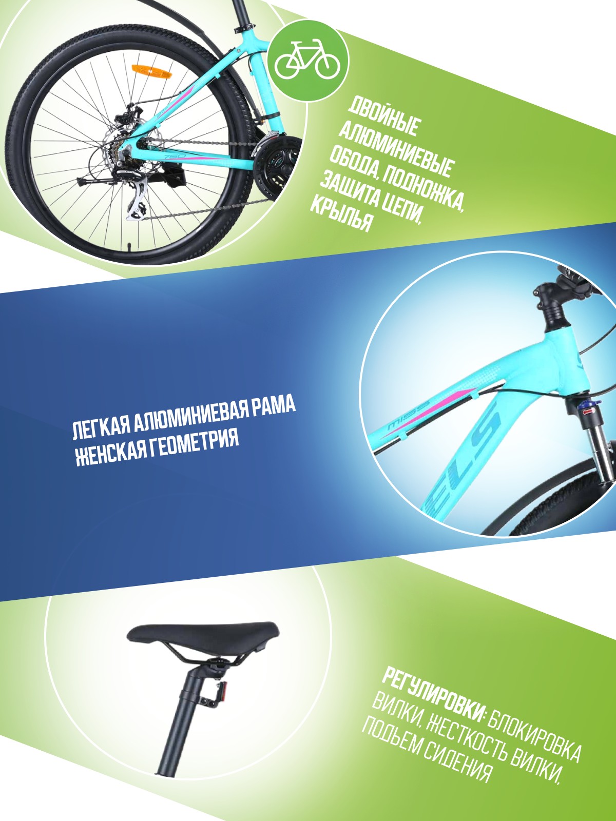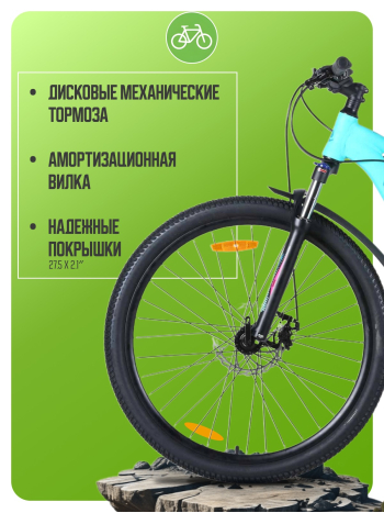 Женский горный велосипед с оборудованием любительского класса Shimano, 21 скорость. Технические особенности: легкая алюминиевая рама женская геометрия, открытая проводка, прямой рулевой стакан, кареточный стакан BSA, съемный петух), амортизационная вилка (пружинно-эластомерная, ход 80 мм, блокировка, регулировка преднагрузки, крепление калипера Post Mount), двойные алюминиевые обода (под AV ниппель), дисковые механические тормоза (роторы 180/160 мм), защита цепи, подножка, катафоты. Подходит для активной езды по различным дорогам и пересеченной местности. Диаметр колес - 27,5 дюймов. Вес - 15,46 кг.