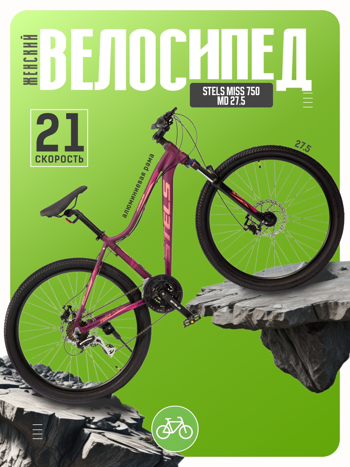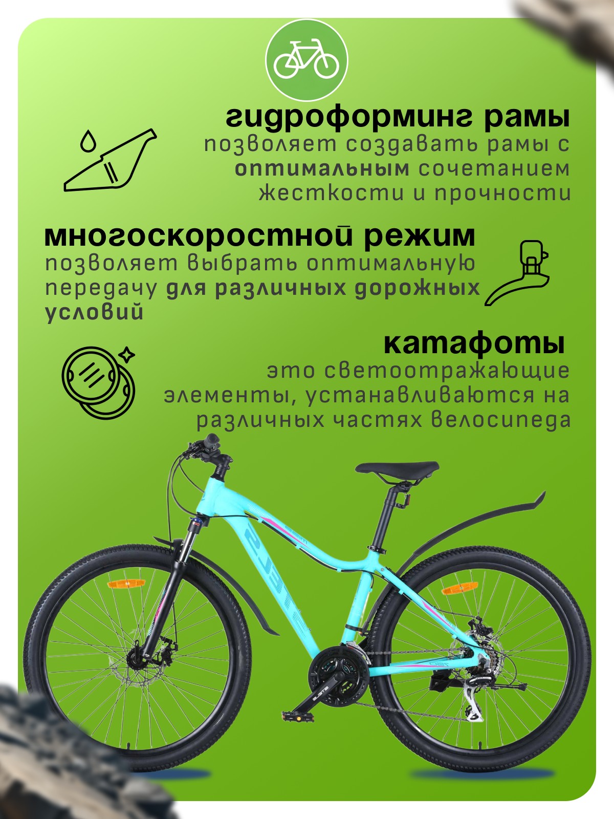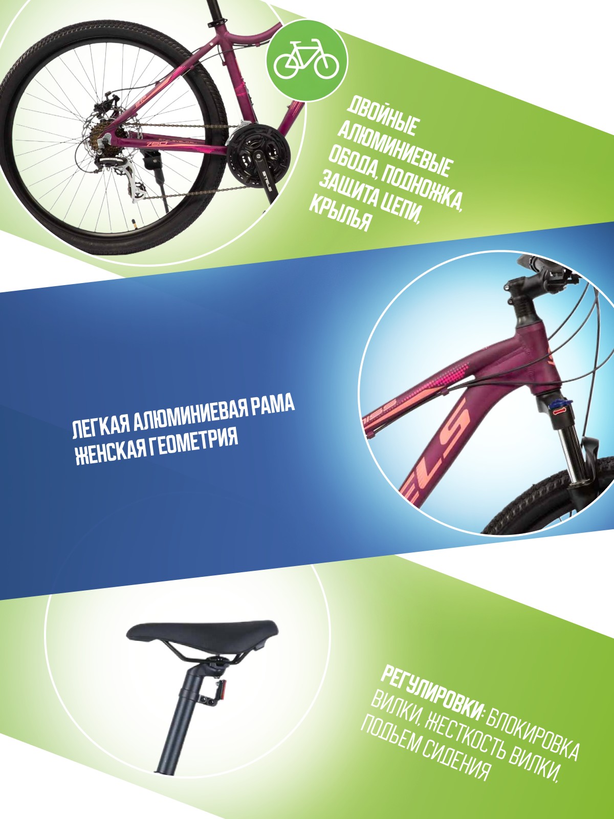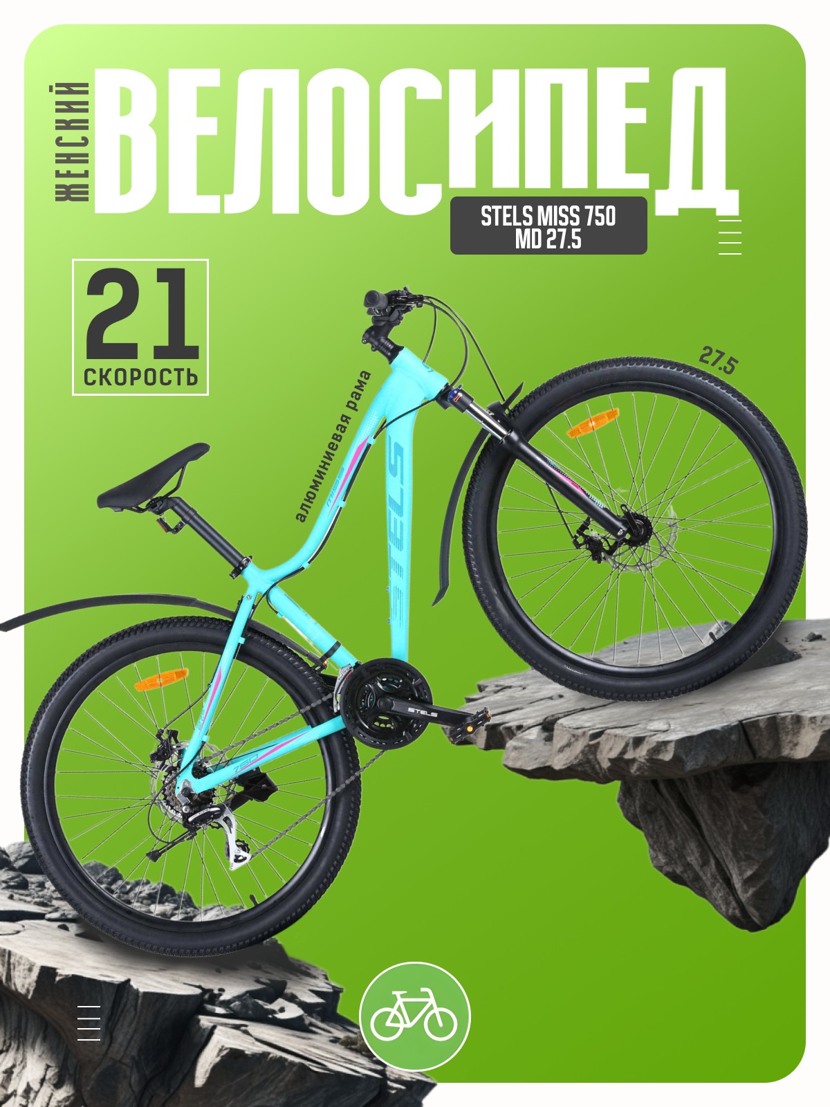 Женский горный велосипед с оборудованием любительского класса Shimano, 21 скорость. Технические особенности: легкая алюминиевая рама женская геометрия, открытая проводка, прямой рулевой стакан, кареточный стакан BSA, съемный петух), амортизационная вилка (пружинно-эластомерная, ход 80 мм, блокировка, регулировка преднагрузки, крепление калипера Post Mount), двойные алюминиевые обода (под AV ниппель), дисковые механические тормоза (роторы 180/160 мм), защита цепи, подножка, катафоты. Подходит для активной езды по различным дорогам и пересеченной местности. Диаметр колес - 27,5 дюймов. Вес - 15,46 кг.