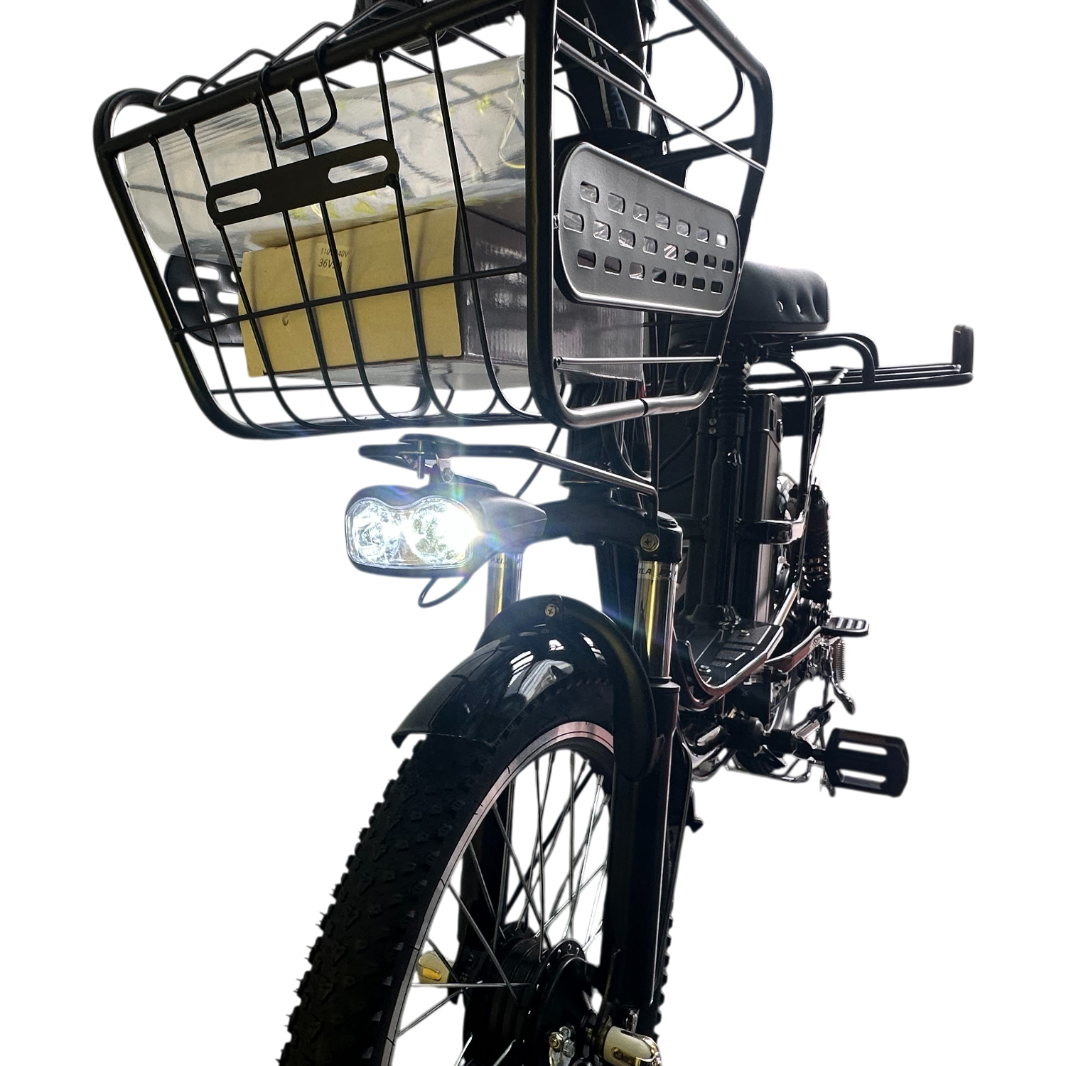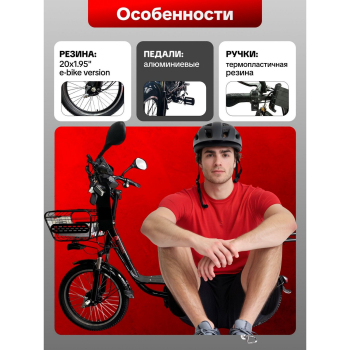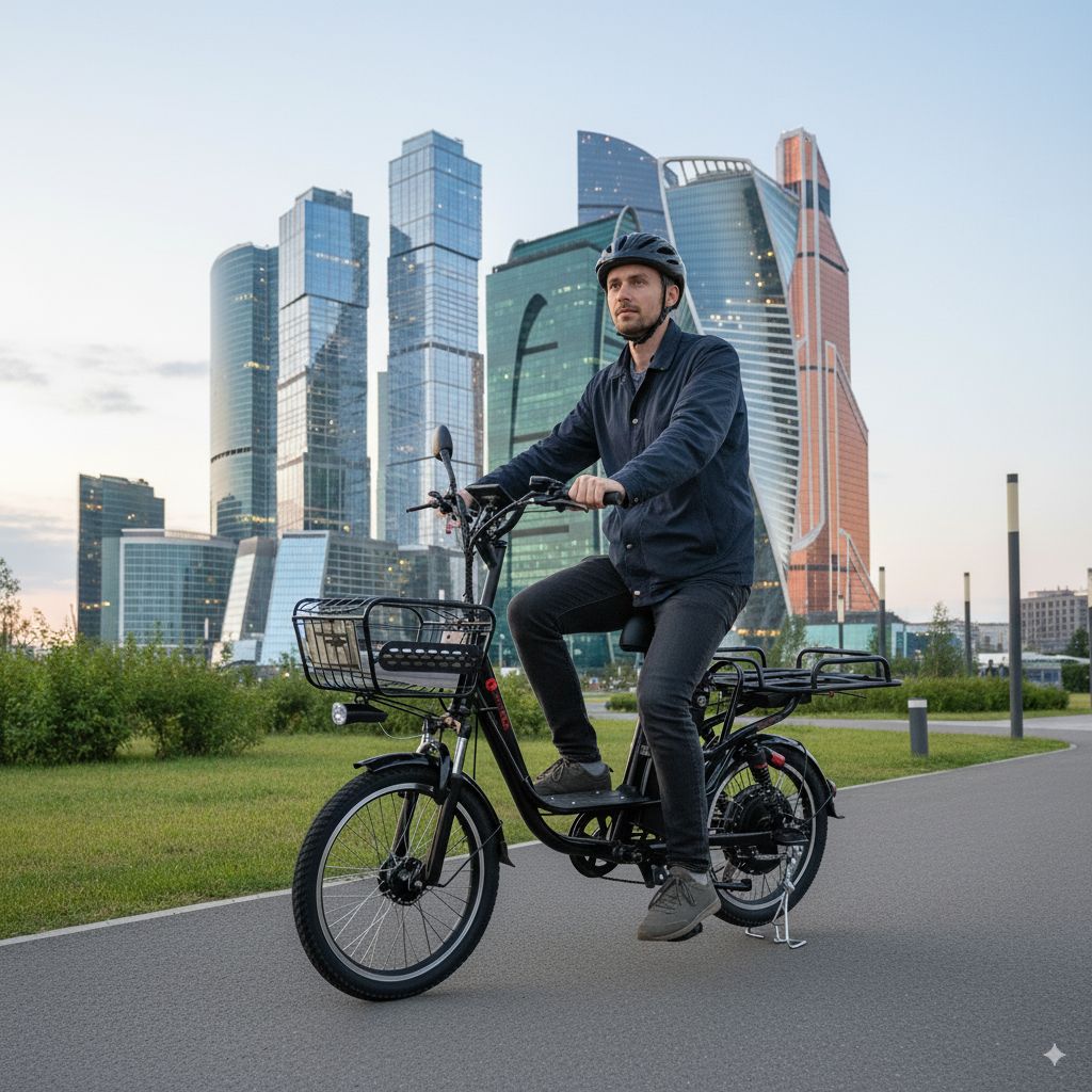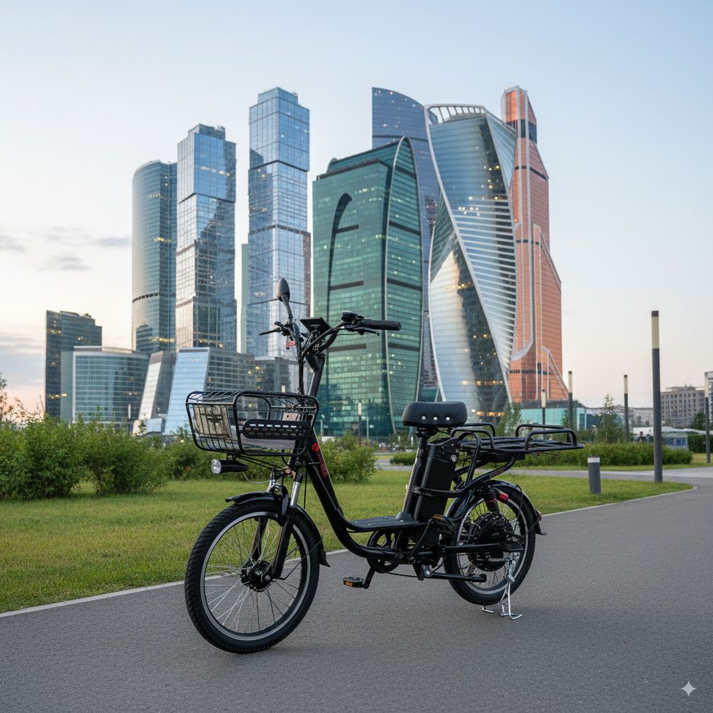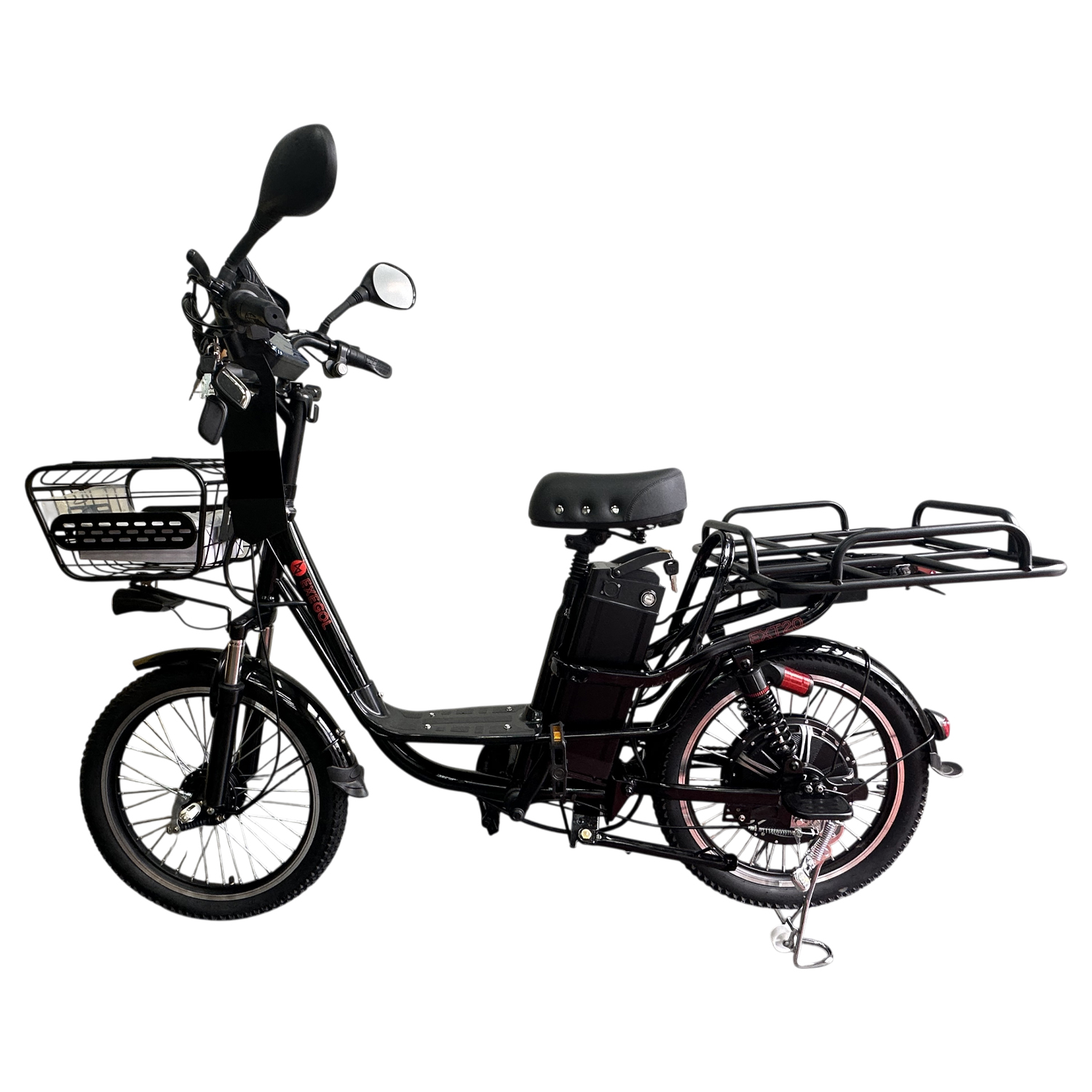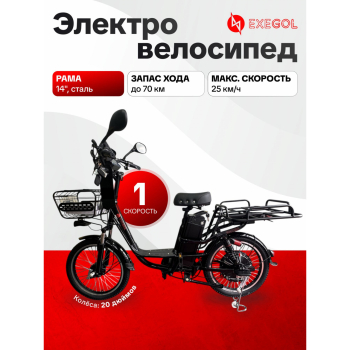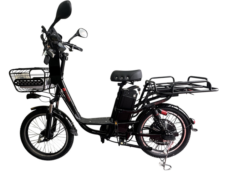 Комфортабельный электровелосипед для курьерских служб с оборудованием без переключения передач. Максимальная нагрузка: до 120 кг. Максимальная скорость: 25 км/ч. Пробег на одной зарядке: до 70 км. Время полной зарядки: 8 часов. Режимы езды: pedal assist, электротяга. Подходит для прогулочного катания в городских условиях и по несложным маршрутам в лесу. Диаметр колес - 20 дюймов (возможна установка колес диаметром 22 и 24 дюйма). Вес - 25 кг.