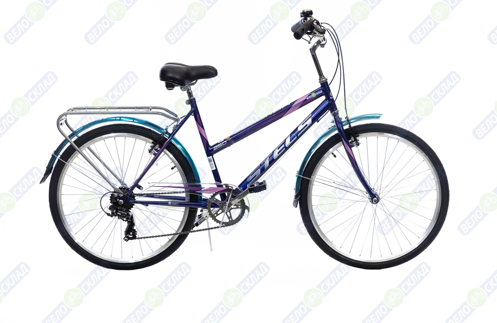 Дорожный велосипед с оборудованием начального класса Shimano, 7 скоростей. Технические особенности: прочная стальная рама (открытая проводка, прямой рулевой стакан), жесткая стальная вилка (крепление для V-brake), двойные алюминиевые обода (под AV ниппель), надежные ободные тормоза V-типа, пластиковая защита цепи, полноразмерные крылья, задний багажник с зажимом, катафоты, подножка, звонок. Подходит для прогулочного катания в городских условиях и по ровным проселочным дорогам. Диаметр колес - 26 дюймов. Вес - 17,5 кг.