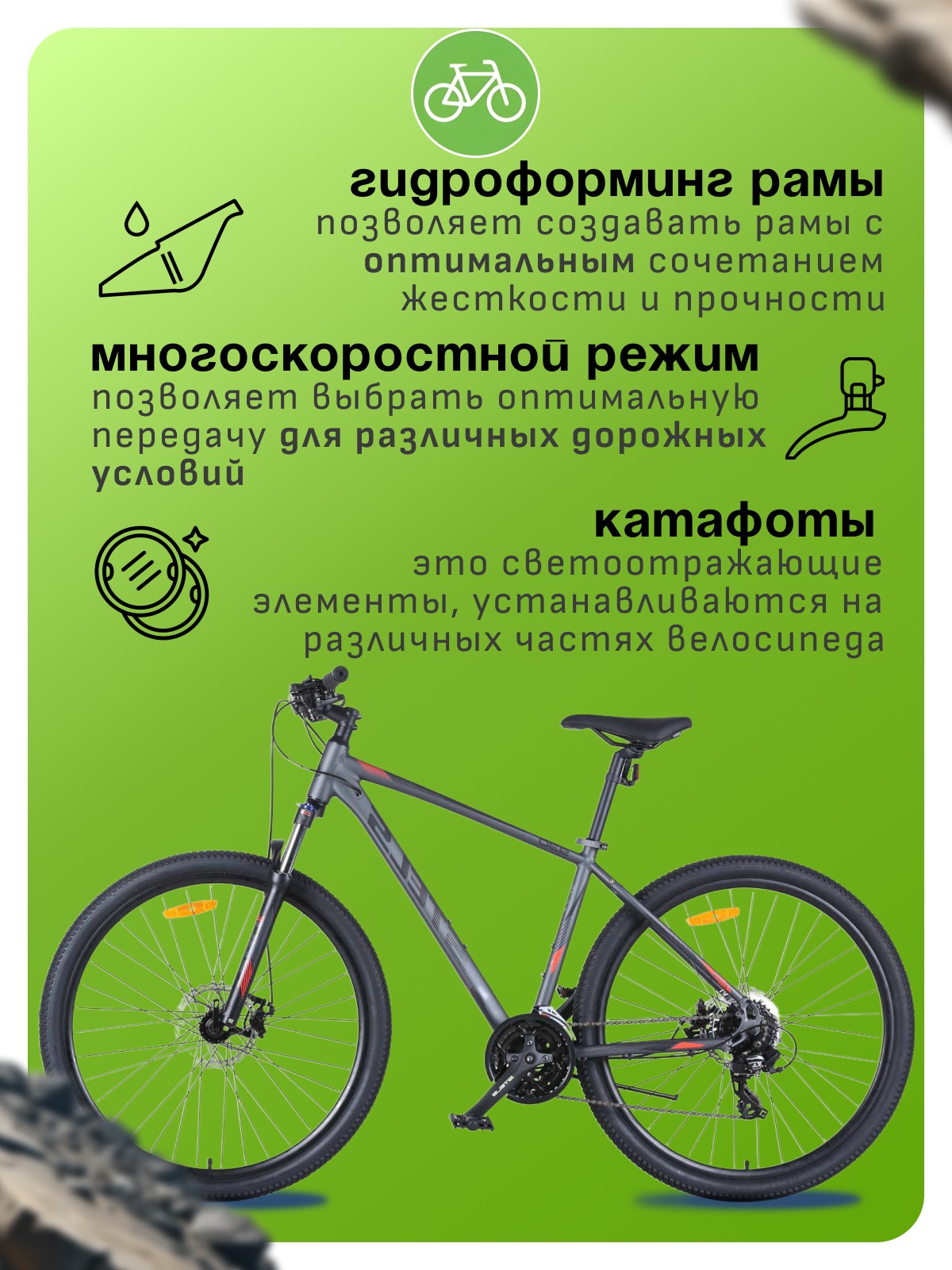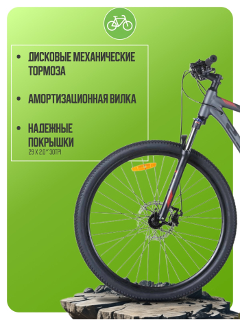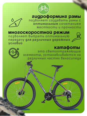 Горный велосипед с навесным оборудованием Shimano, 24 скорости. Технические особенности: легкая алюминиевая рама (частично скрытая проводка, прямой рулевой стакан, кареточный стакан BSA, съемный петух, крепление калипера Post Mount), амортизационная вилка (пружинно-эластомерная, магниевые штаны, с алюминиевой короной, ход 100 мм, блокировка, регулировка преднагрузки, крепление калипера Post Mount), двойные алюминиевые обода (под AV ниппель), дисковые механические тормоза (роторы 180/160 мм), защита цепи, катафоты, подножка. Подходит для активной езды по различным дорогам и пересеченной местности. Диаметр колес - 29 дюймов. Вес - 15,6 кг.