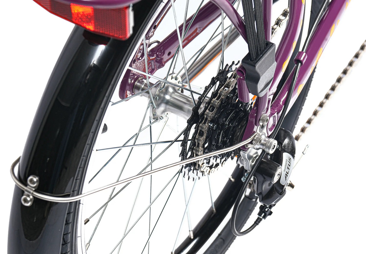 Переключает (перебрасывает) цепь на задних звездах. Принцип действия у всех одинаков — приводится в движение тросиком. Отличаются классом и производителем. Если рассматривать их взаимозаменяемость, то нужно учитывать следующие: параметры и диаметр крепежного хомута, его расположение (верхний или нижний), как подведен тросик (сверху или снизу переключателя, так называемая, тяга переключателя), а также количество зубьев на звездах. Регулировка заднего переключателя производится по тому же принципу что и регулировка переднего, однако здесь есть свои особенности. Так как данный тип оборудования достаточно обособлен от общей конструкции, некоторые велосипедисты устанавливают на ось специальную защитную скобу.