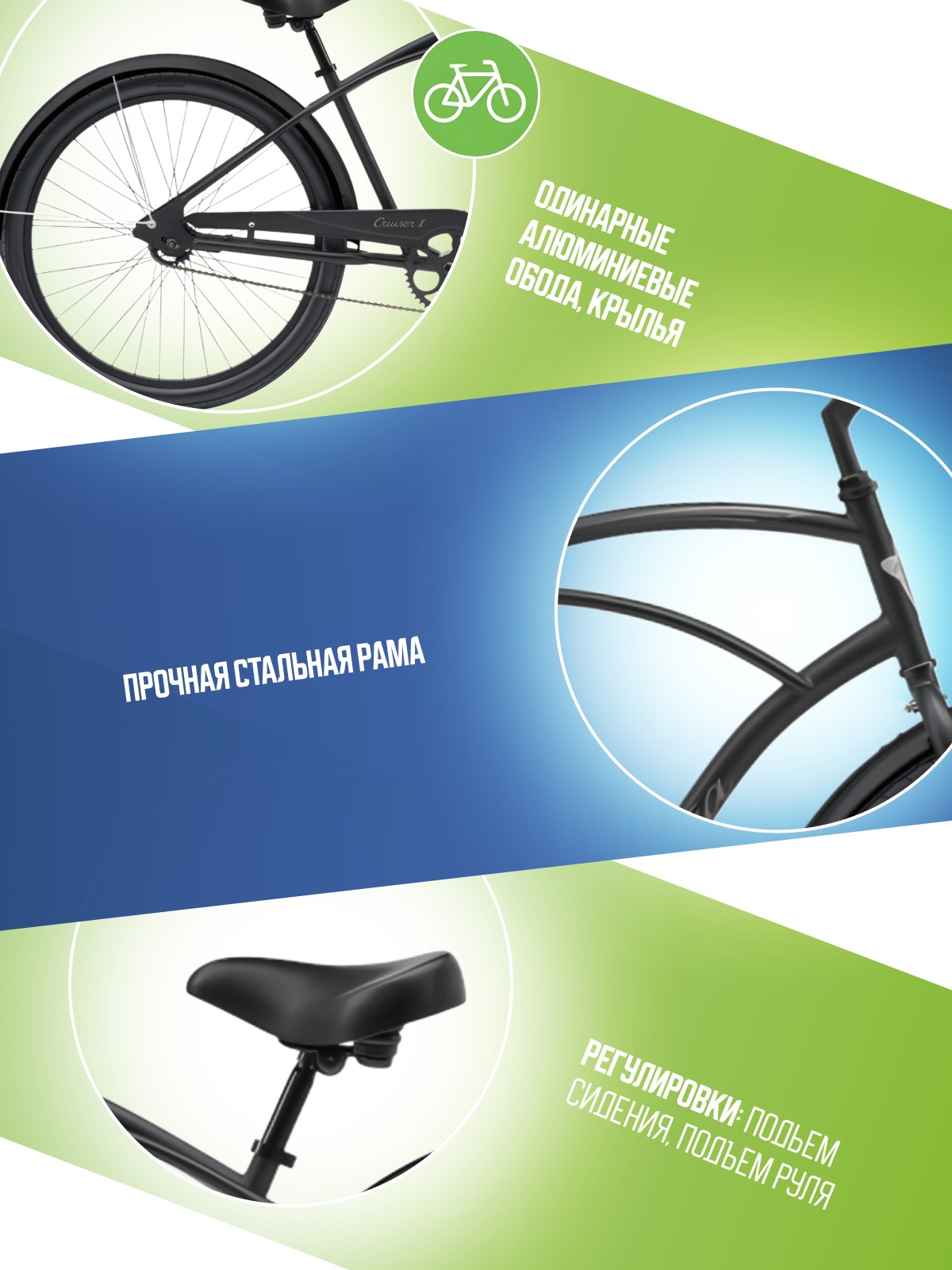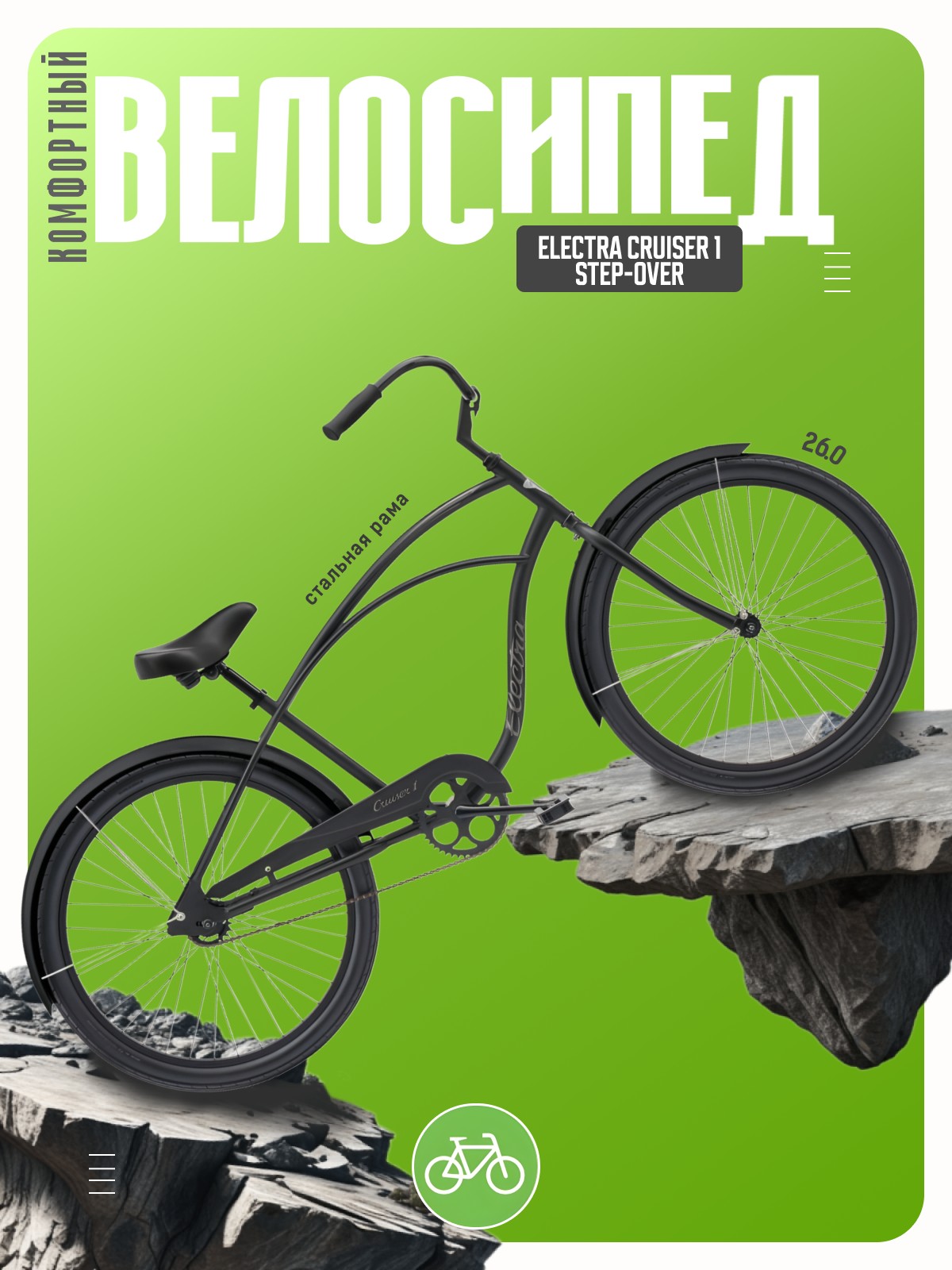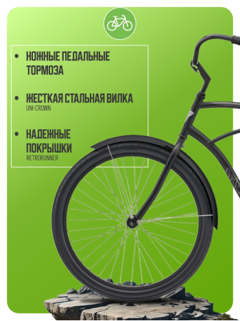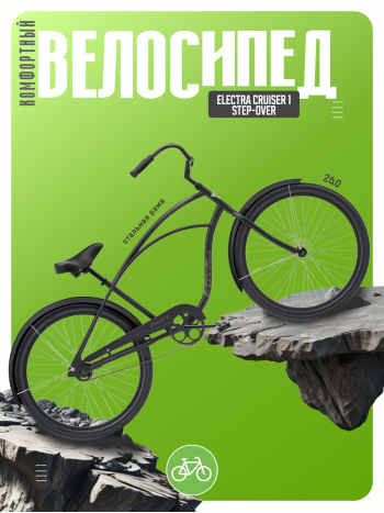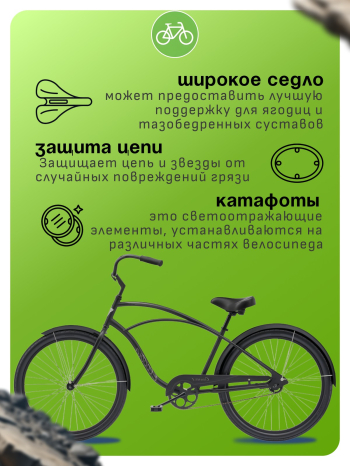 Комфортабельный круизер без переключения передач. Технические особенности: прочная стальная рама (Hi-Ten, прямой рулевой стакан, запатентованная технология Flat-Foot), жесткая стальная вилка Uni-crown, одинарные алюминиевые обода (под ниппель AV), ножные педальные тормоза, полноразмерные крылья, защита цепи, комфортное седло с эластомерами. Подходит для прогулочного катания в городских условиях. Диаметр колес - 26 дюймов. Вес - 15,9 кг.