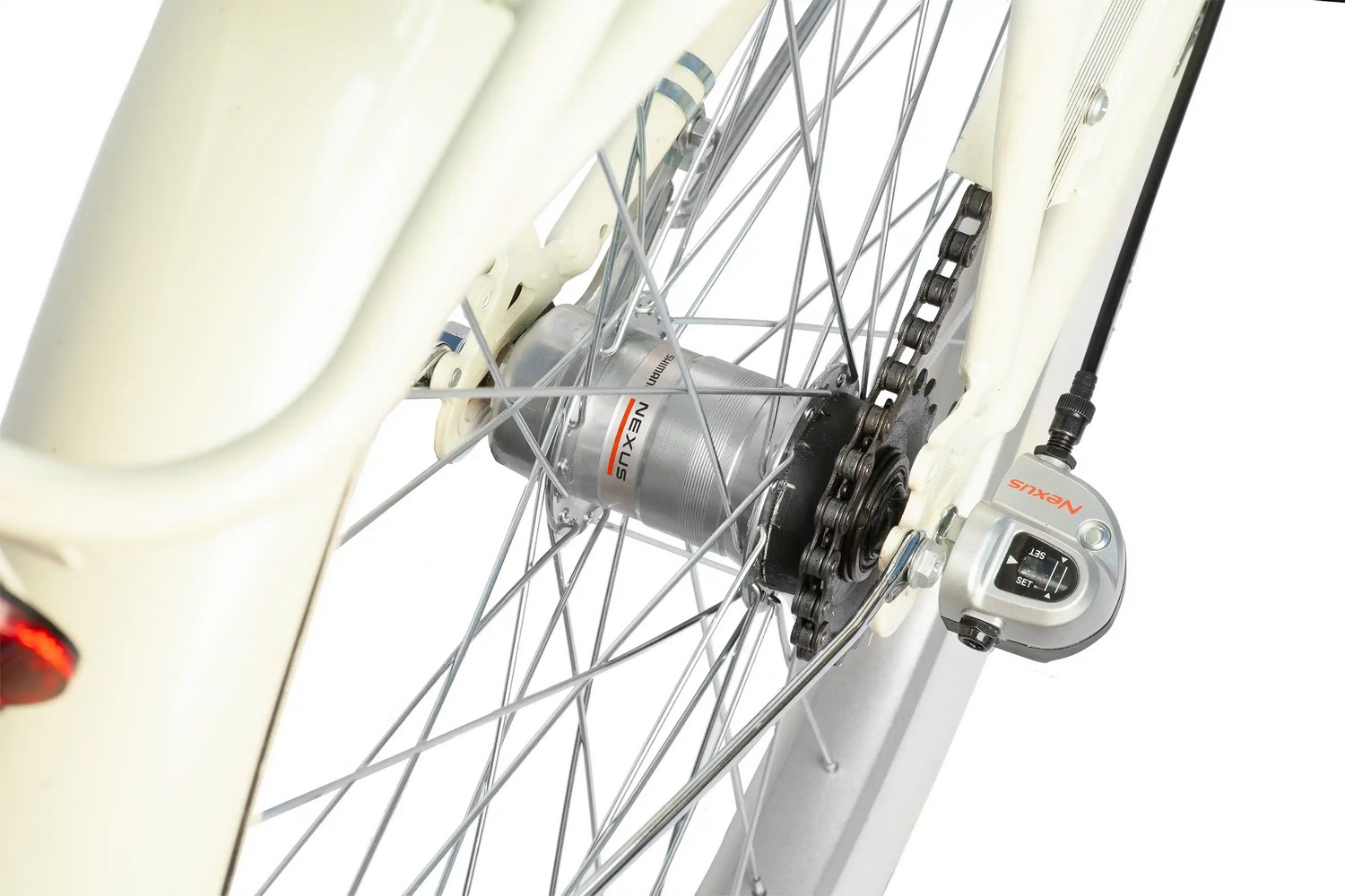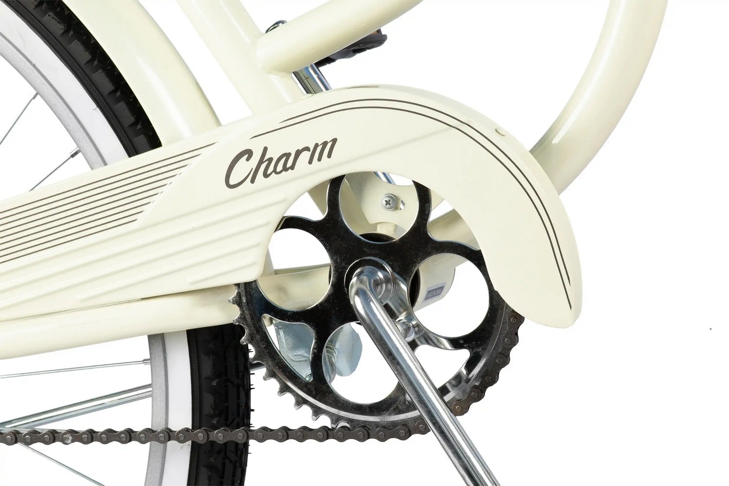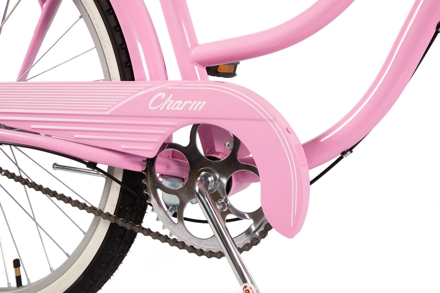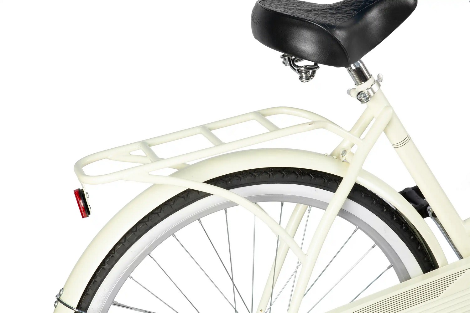 Женский комфортабельный круизер с оборудованием планетарного типа Shimano, 3 скорости. Технические особенности: прочная стальная рама (Hi-Ten, прямой рулевой стакан, интегрированный багажник), жесткая стальная вилка, одинарные стальные обода (под ниппель AV), ножные педальные тормоза, полноразмерные крылья, защита цепи, задний багажник, комфортное седло с пружинами, передняя корзина, подножка. Подходит для прогулочного катания в городских условиях. Диаметр колес - 26 дюймов. Вес - 17,2 кг.