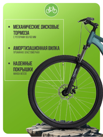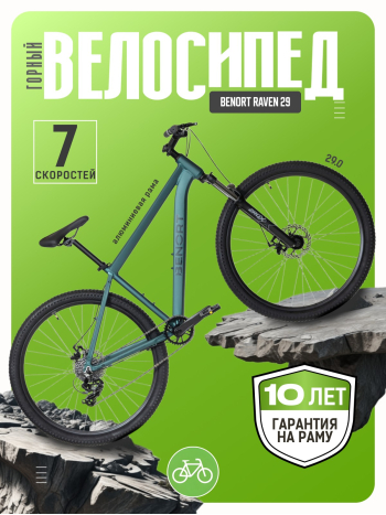 Горный велосипед Benort Raven 29 — идеальный выбор для начинающих райдеров, ценящих надёжность, комфорт и универсальность. Модель спроектирована для прогулок по паркам, лёгкому бездорожью и городским маршрутам. Велосипед собран на прочной алюминиевой раме из сплава 6061 с продуманной геометрией и современными технологиями. Амортизационная вилка с ходом 100 мм, оснащенная блокировкой и регулировкой преднагрузки, эффективно отрабатывает неровности, а при необходимости превращается в жёсткую для экономии энергии на ровных участках. 7-скоростная трансмиссия Shimano Tourney с кассетой обеспечивает простое и надёжное переключение, а раздельные манетка и тормозная ручка упрощают будущие апгрейды. Механические дисковые тормоза, двойные обода и втулки на промышленных подшипниках гарантируют безопасность, плавный накат и долгий срок службы. Широкие покрышки 29 × 2.25 и руль 720 мм повышают устойчивость и контроль. Вес велосипеда — около 14,2 кг.