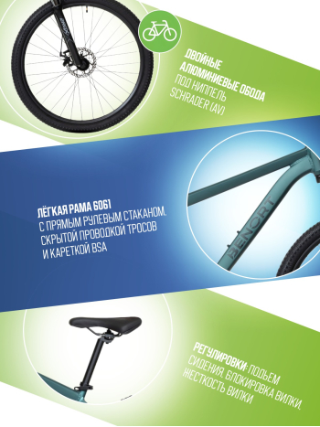 - Лёгкая алюминиевая рама 6061 с прямым рулевым стаканом, скрытой проводкой тросов и кареткой BSA