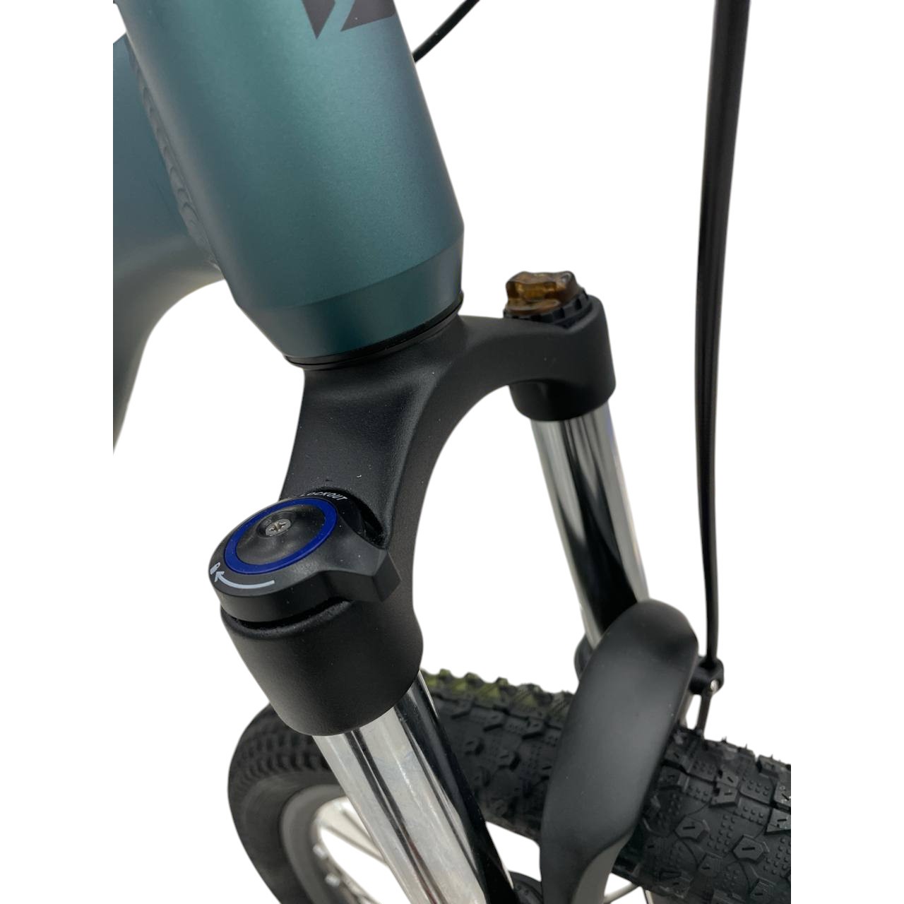 - Пружинно-эластомерная амортизационная вилка с ходом 100 мм, блокировкой, регулировкой преднагрузки и алюминиевыми штанами