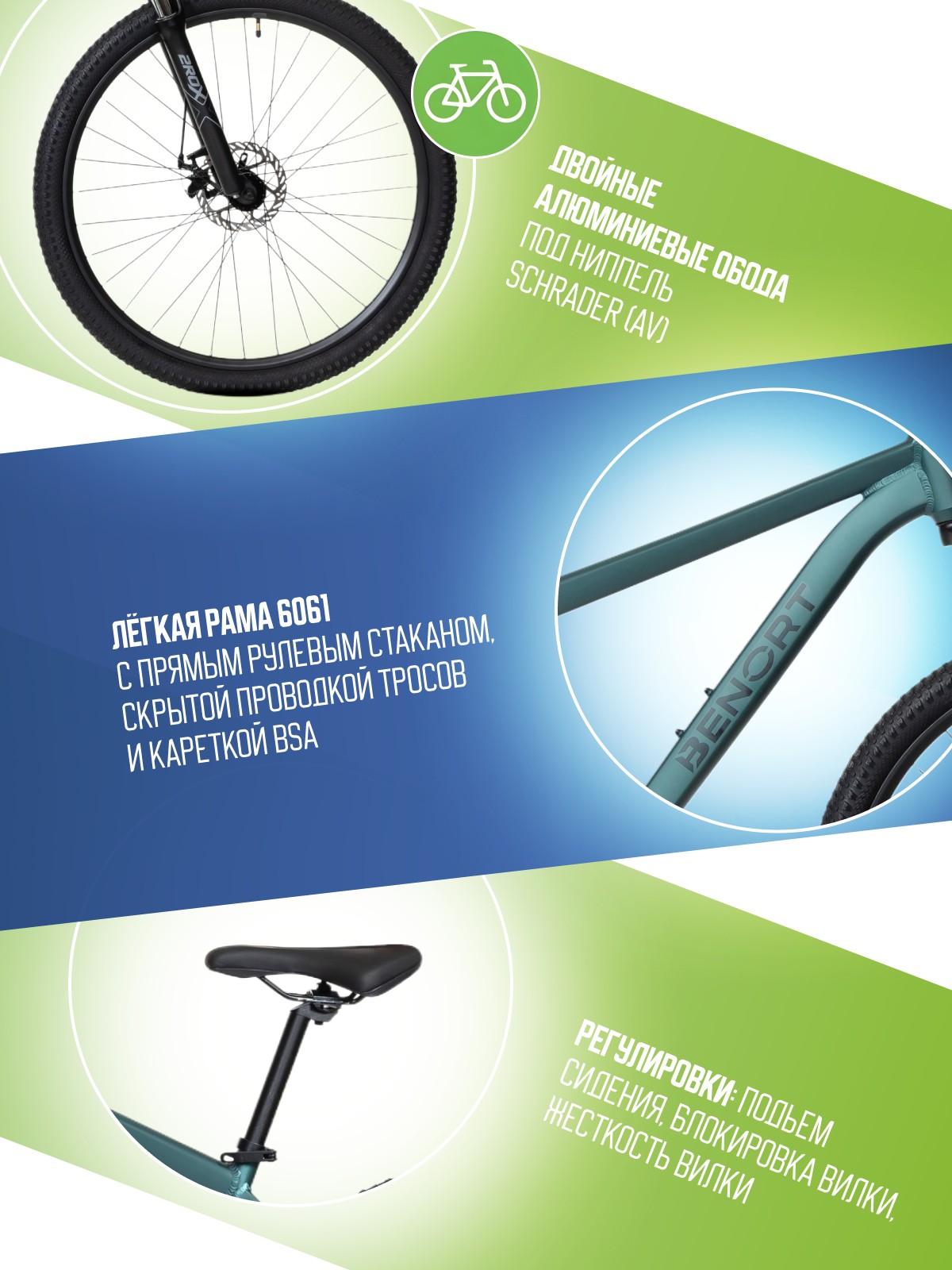 - Лёгкая алюминиевая рама 6061 с прямым рулевым стаканом, скрытой проводкой тросов и кареткой BSA