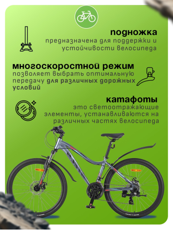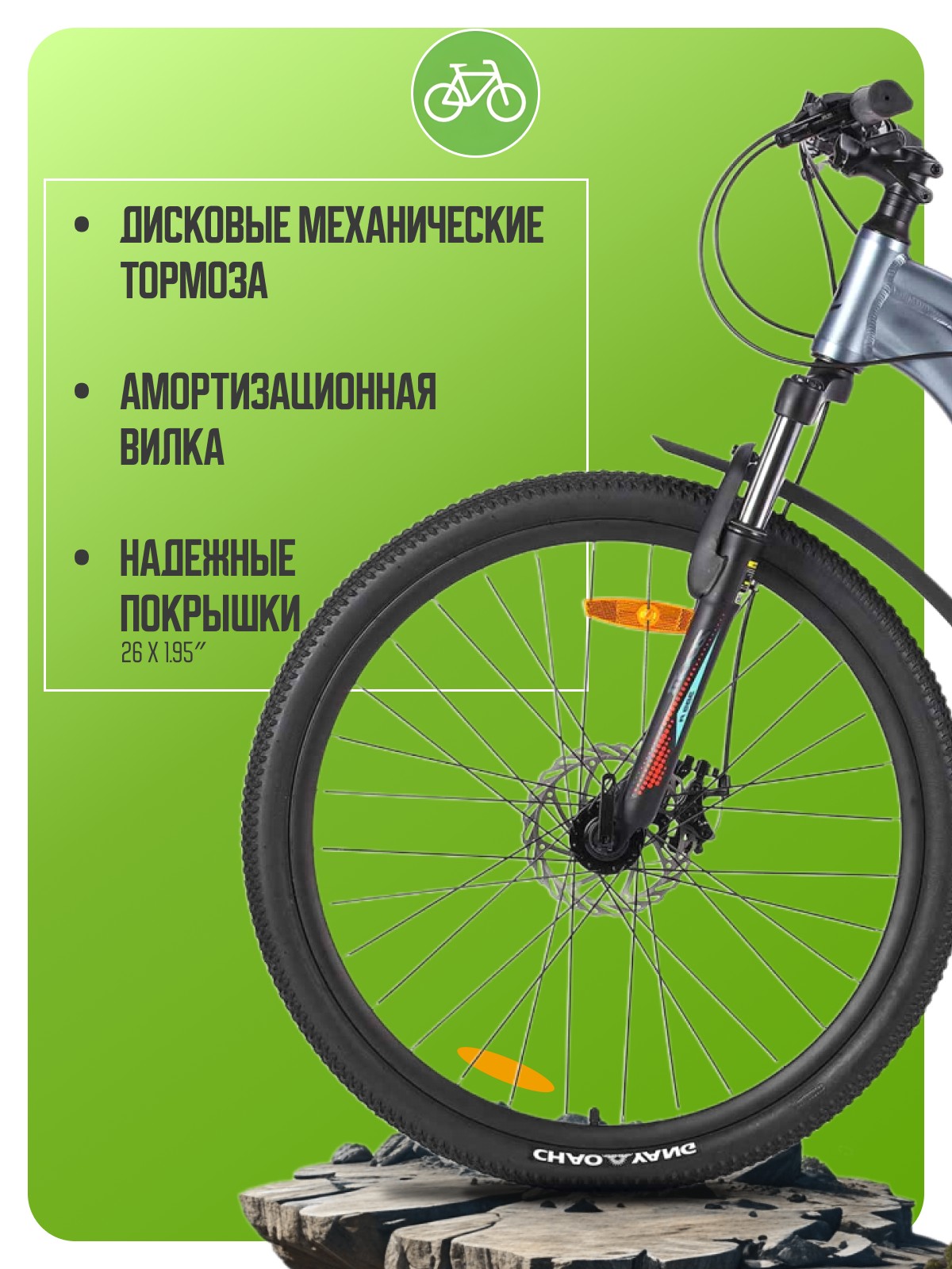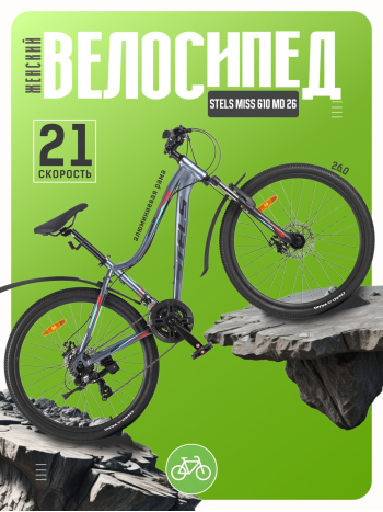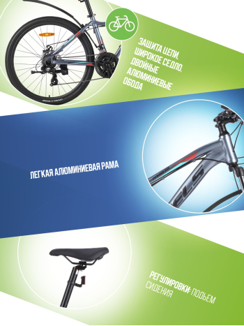 Женский горный велосипед с навесным оборудованием Shimano, 21 скорость. Технические особенности: легкая алюминиевая рама (открытая проводка, кареточный стакан BSA, прямой рулевой стакан, съемный петух), амортизационная вилка (пружинно-эластомерная, ход 60 мм, крепление калипера IS), двойные алюминиевые обода (под AV ниппель), дисковые механические тормоза (роторы 160/160 мм), защита цепи, катафоты, подножка. Подходит для прогулочного катания в городских условиях и по несложным маршрутам в лесу. Диаметр колес - 26 дюймов. Вес - 15 кг.