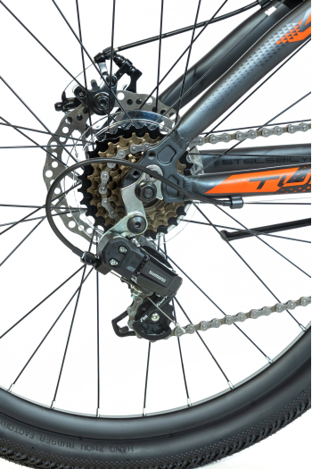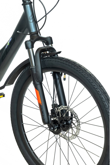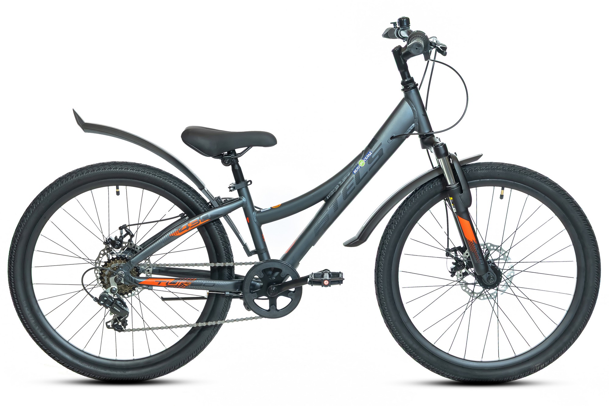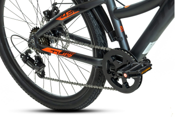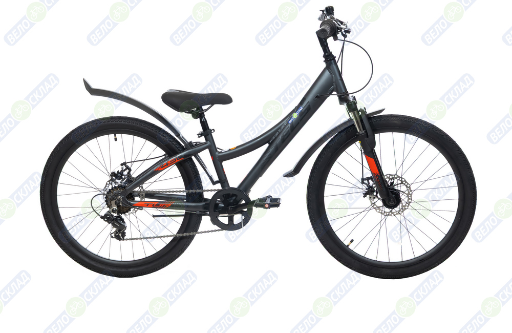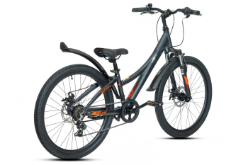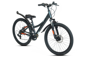 Подростковый велосипед с навесным оборудованием Shimano, 6 скоростей. Технические особенности: легкая алюминиевая рама (скрытая проводка, кареточный стакан BSA, прямой рулевой стакан, съемный петух), амортизационная вилка (пружинно-эластомерная, ход 50 мм, крепление калипера IS), двойные алюминиевые обода (под AV ниппель), дисковые механические тормоза (роторы 160/160 мм), защита цепи, защита заднего переключения, катафоты, подножка. Подходит для прогулочного катания в городских условиях и по несложным маршрутам в лесу. Диаметр колес - 24 дюйма. Вес - 14,18 кг.