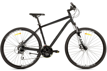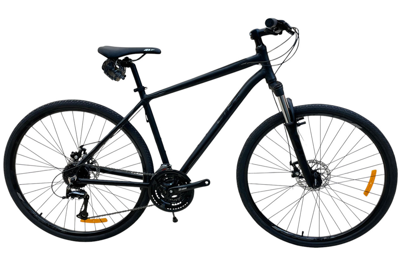 Дорожный велосипед гибридного типа с оборудованием любительского класса Shimano, 24 скорости. Технические особенности: легкая алюминиевая рама (частично скрытая проводка, прямой рулевой стакан, кареточный стакан BSA, съемный петух), амортизационная вилка A1 MD 689ST MLO (ход 60 мм, пружинно-эластомерная, блокировка, регулировка преднагрузки), двойные алюминиевые обода (под AV ниппель), дисковые механические тормоза (роторы 160/160 мм), защита цепи, катафоты, подножка. Подходит для прогулочного катания в городских условиях и по несложным маршрутам в лесу. Диаметр колес - 28 дюймов. Вес - 15,5 кг.