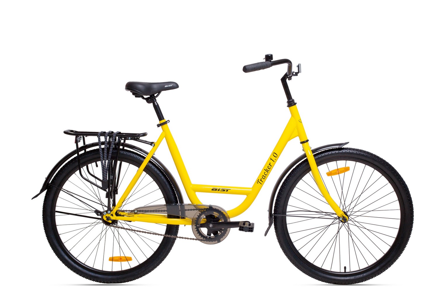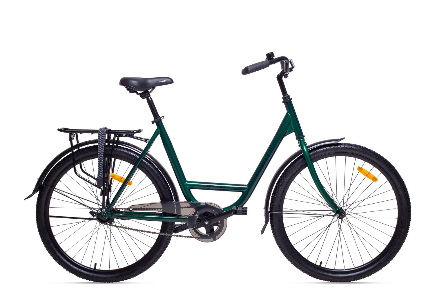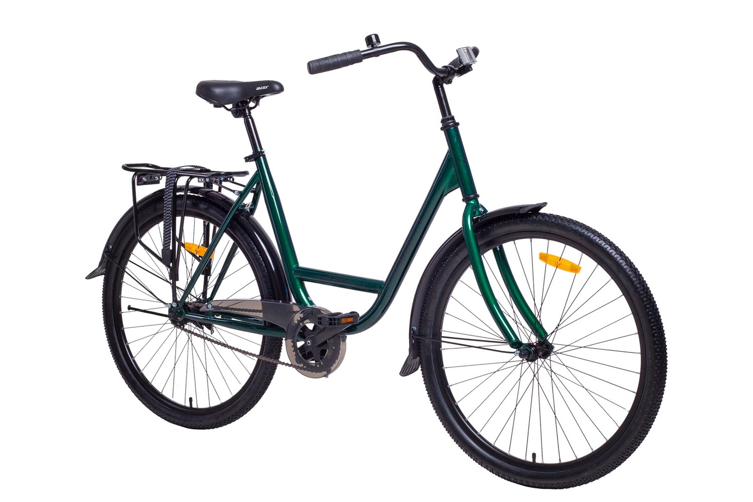 Дорожный велосипед для катания в городской среде без переключения передач. Технические особенности: прочная стальная рама (заниженная геометрия, прямой рулевой стакан, кареточный стакан BSA), жесткая стальная вилка, двойные алюминиевые обода (под AV ниппель), ножные педальные тормоза, защита цепи, полноразмерные крылья, задний багажник, катафоты, звонок, подножка. Подходит для прогулочной езды по шоссе и ровным проселочным дорогам. Диаметр колес - 26 дюймов. Вес - 16,5 кг.