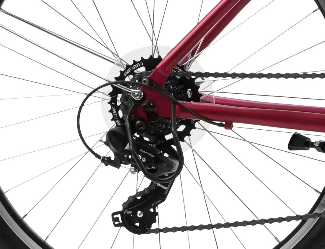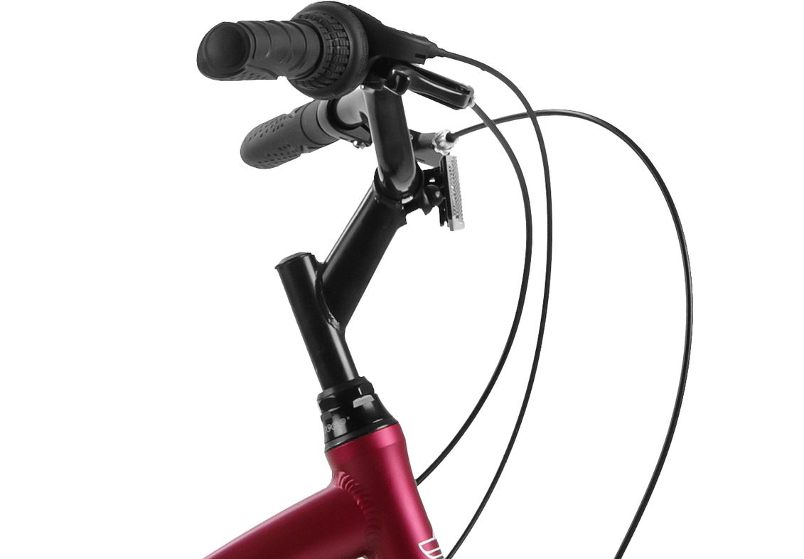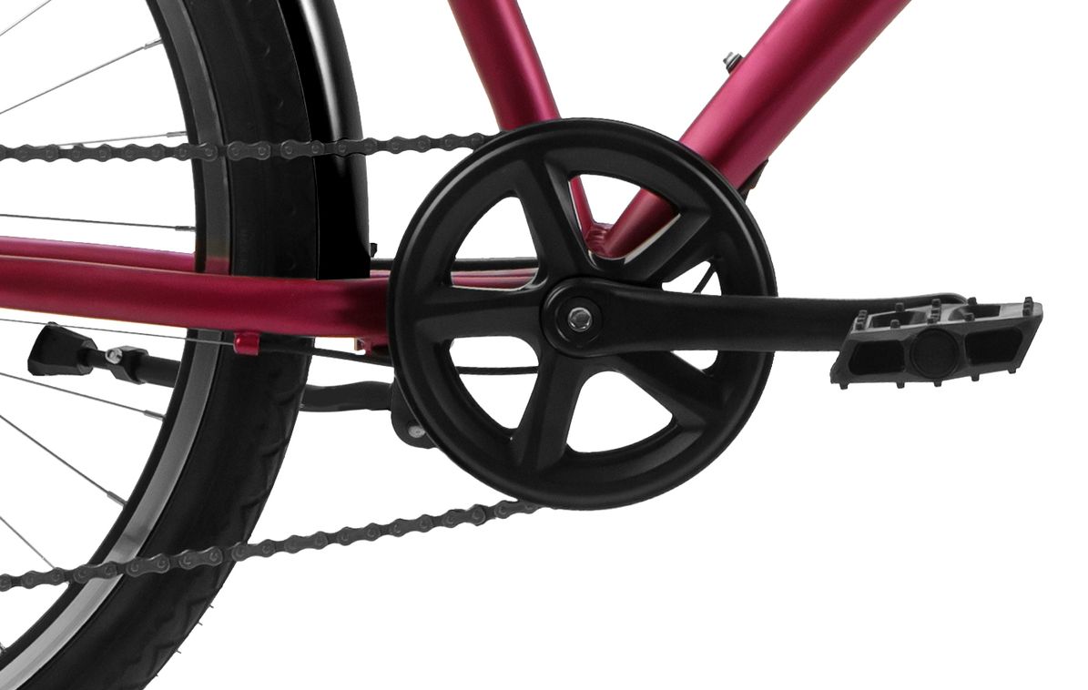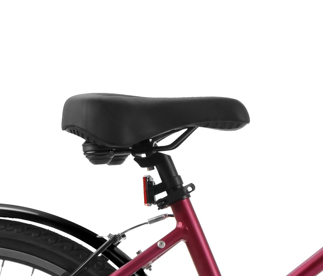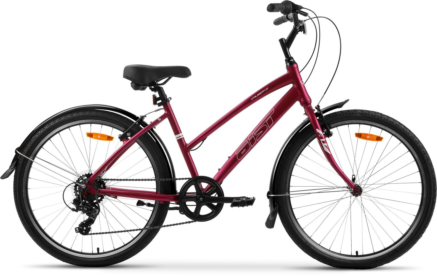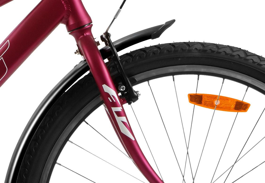Женский городской велосипед с оборудованием начального класса Shimano, 7 скоростей. Технические особенности: алюминиевая рама (частично скрытая проводка, прямой рулевой стакан, кареточный стакан BSA), жесткая стальная вилка, двойные алюминиевые обода (под AV ниппель), надежные ободные тормоза Tektro V-brake, защита цепи, полноразмерные крылья с бызговиками, катафоты, подножка. Подходит для прогулочной езды по шоссе и ровным проселочным дорогам. Диаметр колес - 26 дюймов. Вес - 16 кг.