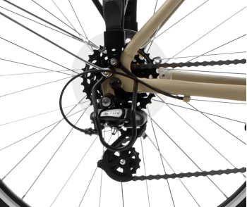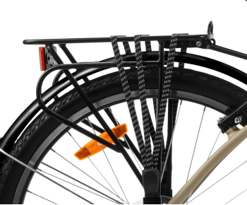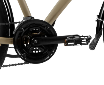 Городской велосипед с оборудованием начального класса Shimano, 21 скорость. Технические особенности: алюминиевая рама (частично скрытая проводка, прямой рулевой стакан, кареточный стакан BSA), амортизационная вилка SR Suntour M3010 (пружинно-эластомерная, ход 60 мм), двойные алюминиевые обода (под AV ниппель), надежные ободные тормоза Tektro V-brake, защита цепи, полноразмерные крылья с бызговиками, задний багажник, регулируемый вынос, катафоты, подножка. Подходит для прогулочной езды по шоссе и ровным проселочным дорогам. Диаметр колес - 26 дюймов. Вес - 17,1 кг.