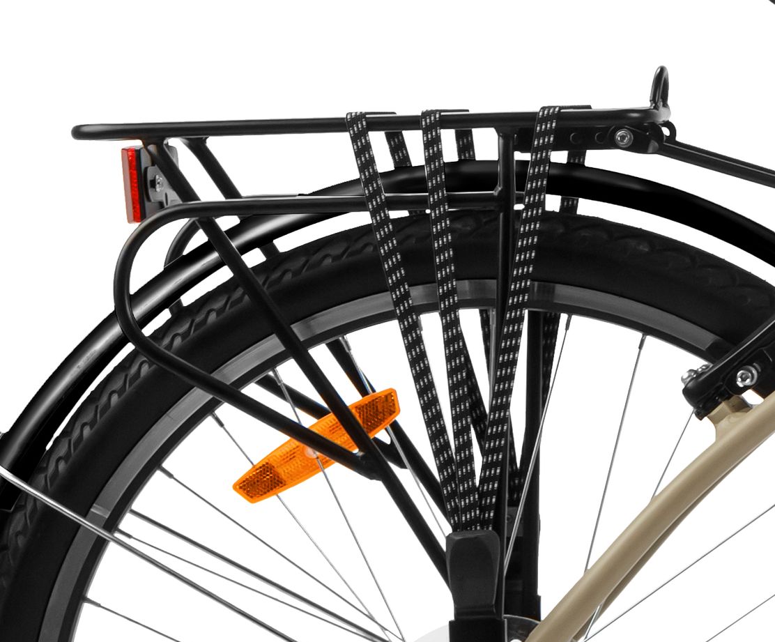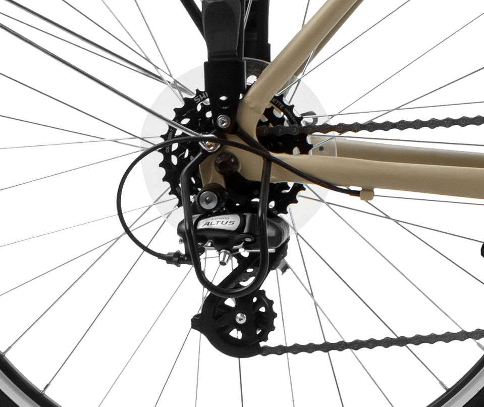 Городской велосипед с оборудованием начального класса Shimano, 21 скорость. Технические особенности: алюминиевая рама (частично скрытая проводка, прямой рулевой стакан, кареточный стакан BSA), амортизационная вилка SR Suntour M3010 (пружинно-эластомерная, ход 60 мм), двойные алюминиевые обода (под AV ниппель), надежные ободные тормоза Tektro V-brake, защита цепи, полноразмерные крылья с бызговиками, задний багажник, регулируемый вынос, катафоты, подножка. Подходит для прогулочной езды по шоссе и ровным проселочным дорогам. Диаметр колес - 26 дюймов. Вес - 17,1 кг.