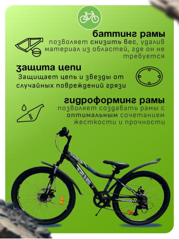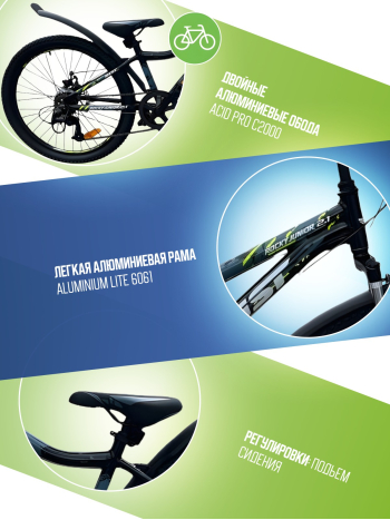 Велосипед, предназначенный для детей в возрасте от восьми до тринадцати лет, с оборудованием начального класса Shimano, 7 скоростей. Технические особенности: легкая алюминиевая рама (открытая проводка, прямой рулевой стакан, кареточный стакан BSA), амортизационная вилка LG-YA (пружинно-эластомерная, ход 60 мм), двойные алюминиевые обода (под AV ниппель), дисковые механические тормоза Yinxing (роторы 160/160 мм), подножка, катафоты, защита заднего переключателя, пластиковые крылья. Подходит для обучения и прогулочного катания в городских условиях. Диаметр колес - 24 дюйма. Вес - 14,1 кг.