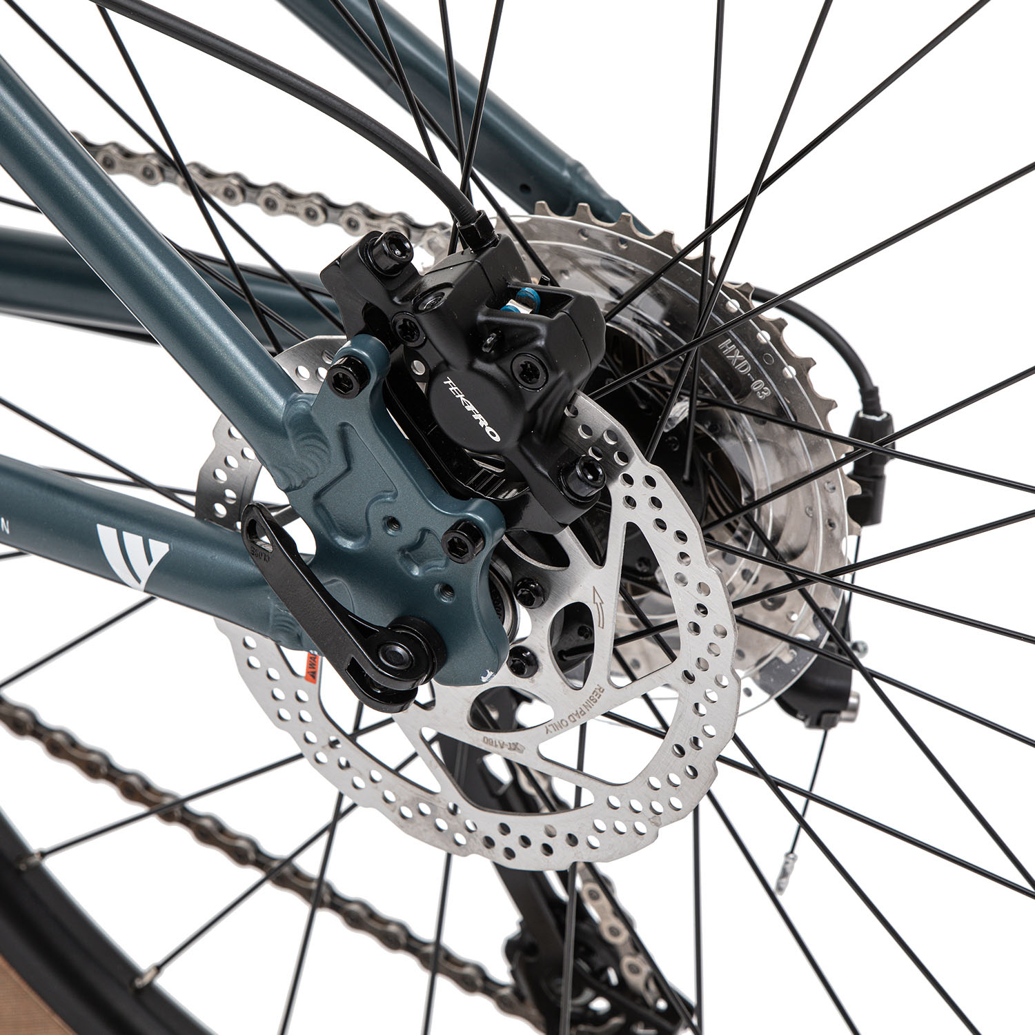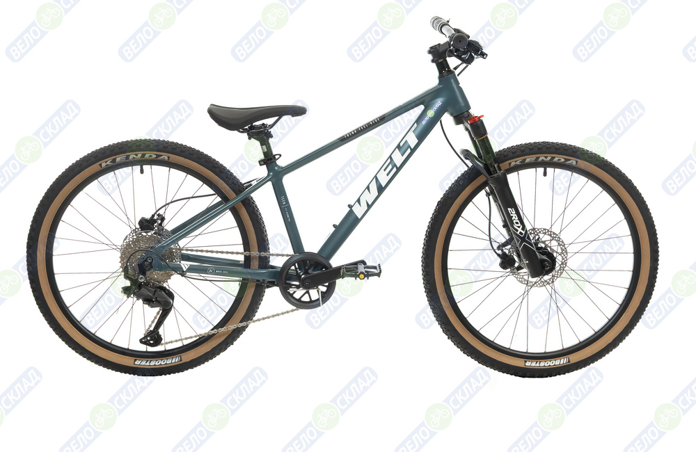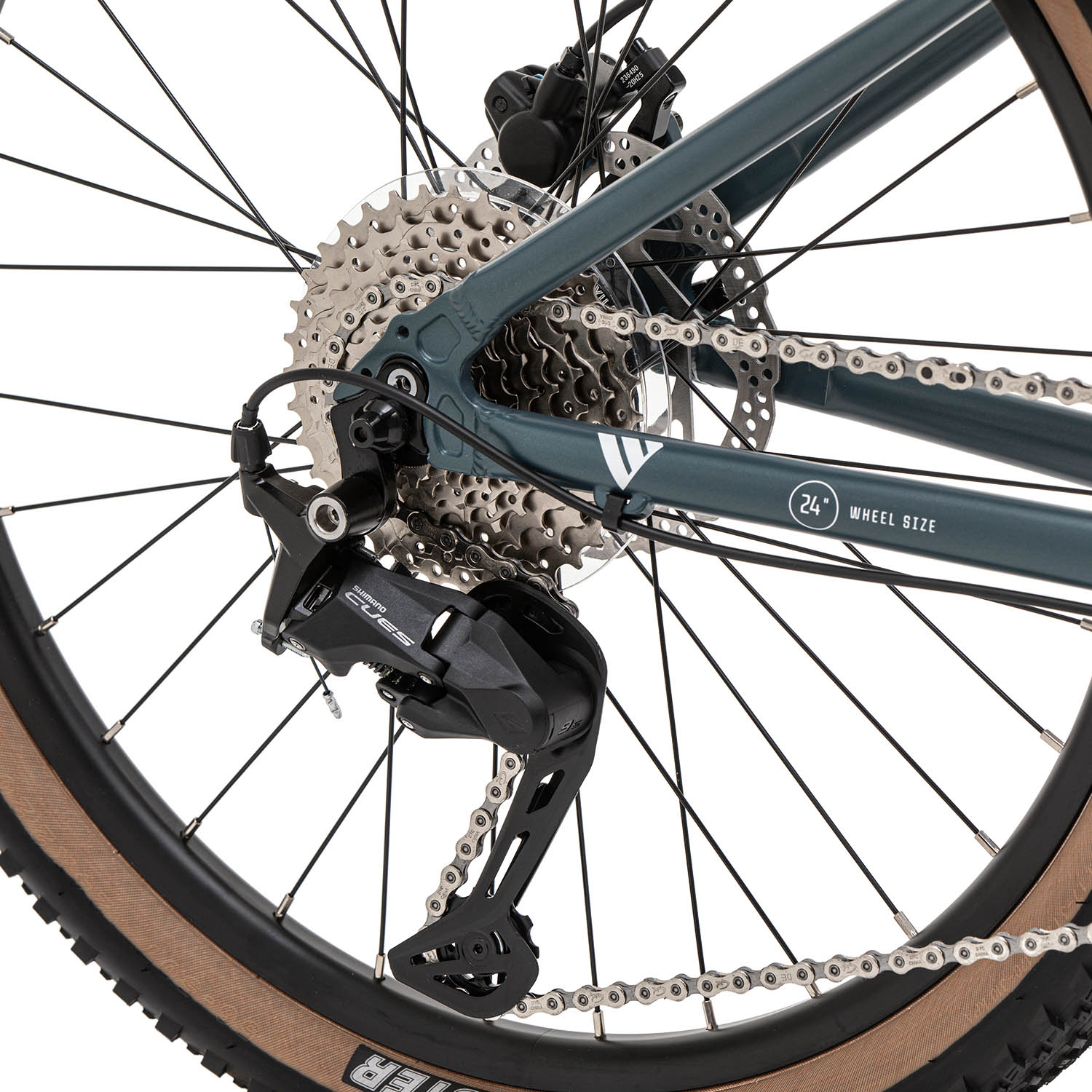 Велосипед, предназначенный для детей в возрасте от восьми до тринадцати лет, с навесным оборудованием Shimano, 9 скоростей. Технические особенности: легкая алюминиевая рама (сплав 6061, частично скрытая проводка, компенсация швов, конический рулевой стакан, кареточный стакан BSA, съемный петух, крепление калипера IS), амортизационная вилка 2ROXX FS-028 Air (воздушно-масляная, ход 80 мм, блокировка хода, регулировка жесткости пружины), двойные алюминиевые обода Alloy Double wall (под AV ниппель), дисковые гидравлические тормоза Tektro TKD176 (роторы 160/160 мм). Подходит для прогулочного катания в городских условиях и по несложным маршрутам в лесу. Диаметр колес - 24 дюйма. Вес - 12,6 кг.