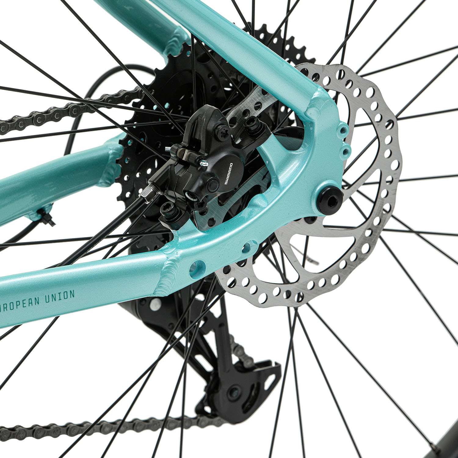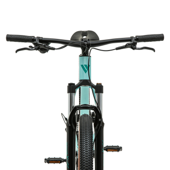 Женский горный велосипед с оборудованием начального любительского класса Shimano, 8 скоростей. Технические особенности: легкая алюминиевая рама (сплав 6061, частично скрытая проводка, компенсация швов, прямой рулевой стакан, кареточный стакан BSA, UDH дропауты, крепление калипера PM, дропауты под сквозную ось), амортизационная вилка 2ROXX 999-ST Alloy (пружинно-эластомерная, ход 120 мм, диаметр ног 32 мм, гидравлическая блокировка хода, регулировка преднагрузки, крепление калипера PM), двойные алюминиевые обода R30-2C (под ниппель Presta), дисковые гидравлические тормоза Shimano MT-200 (роторы 180/160 мм). Подходит для активной езды по различным дорогам и пересеченной местности. Диаметр колес - 27,5 дюймов. Вес - 14,2 кг.