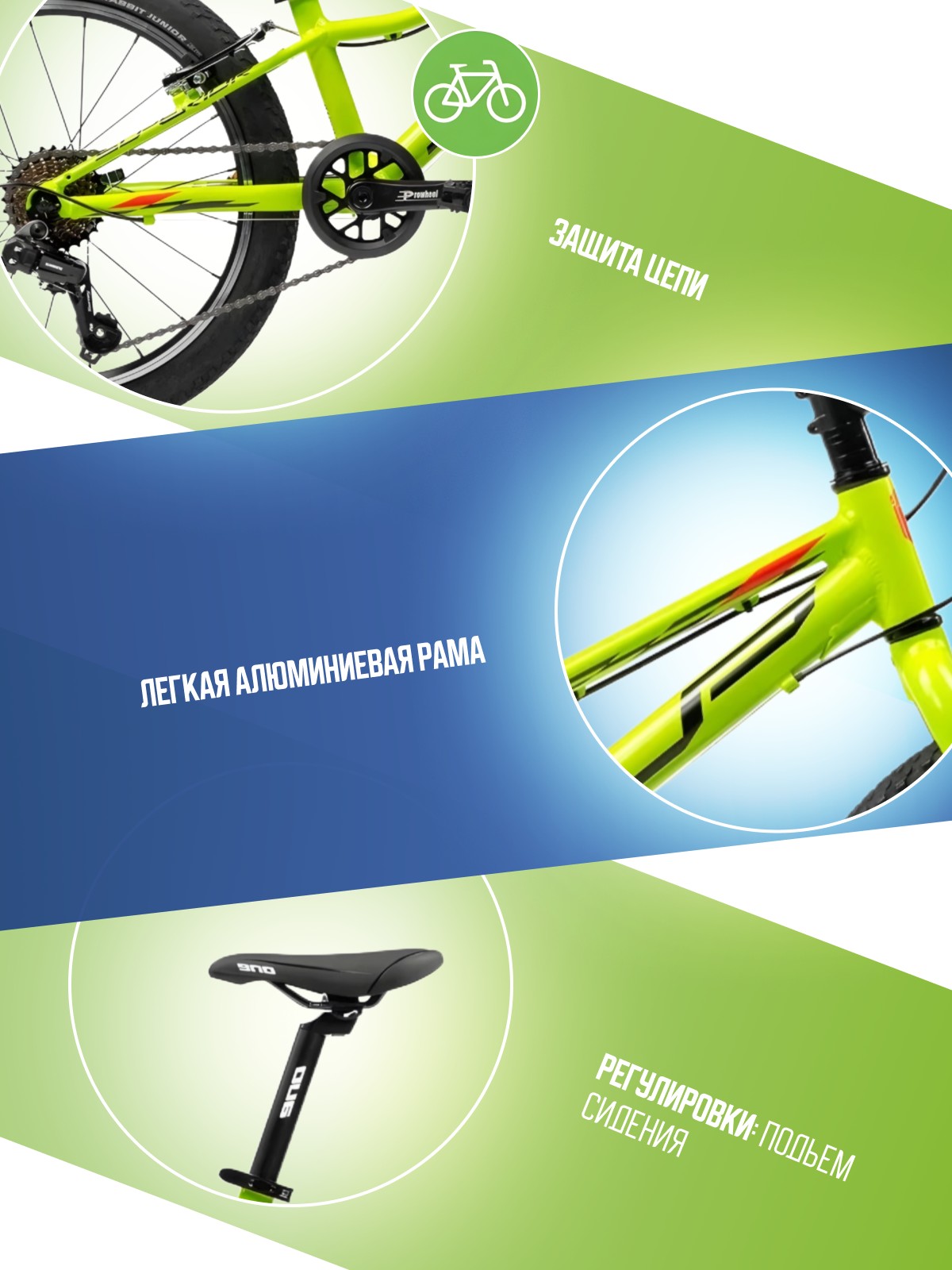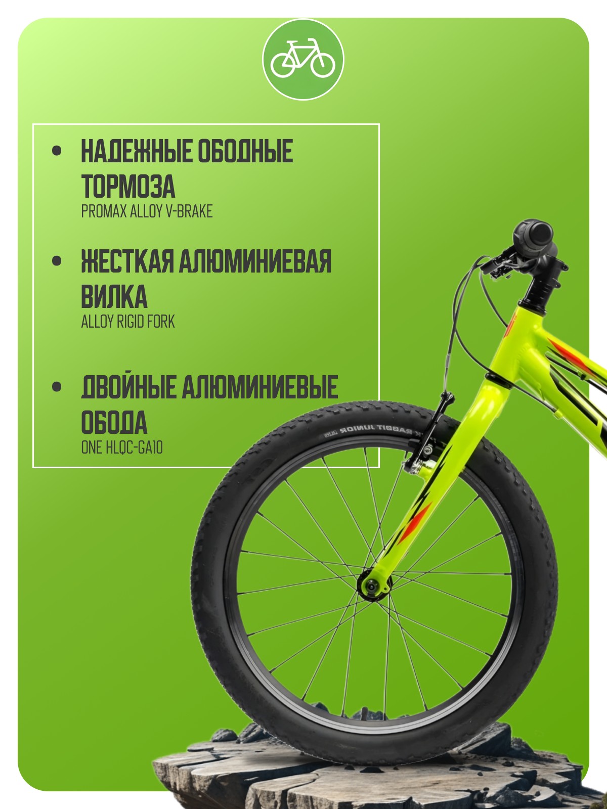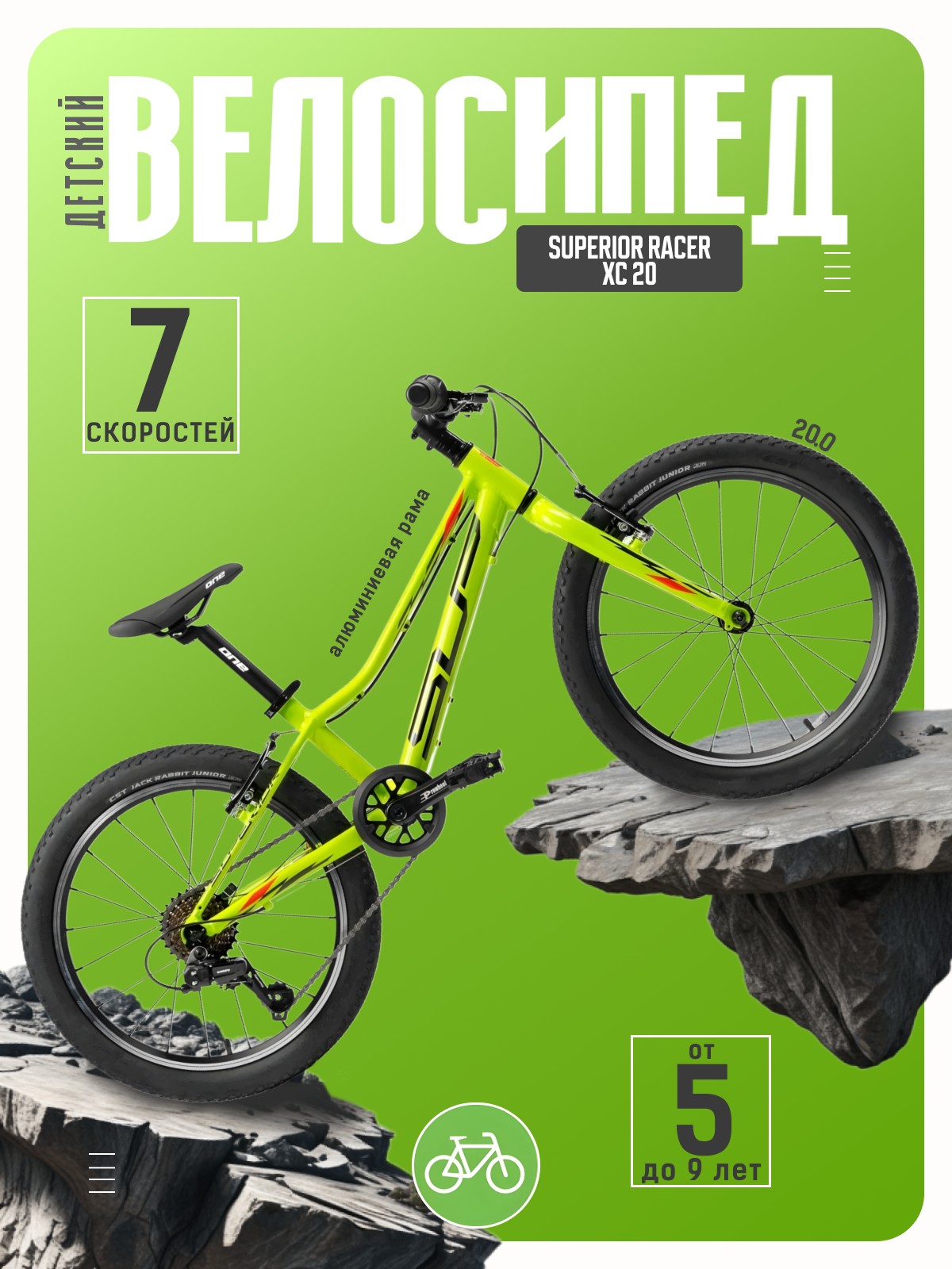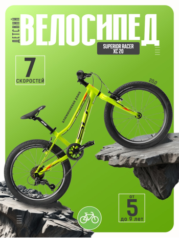 Велосипед, предназначенный для детей в возрасте от пяти до девяти лет, с оборудованием начального класса Shimano, 7 скоростей. Технические особенности: легкая алюминиевая рама (сплав 6061, двойной баттинг, гидроформинг, открытая проводка, кареточный стакан BSA, съемный петух, прямой рулевой стакан), жесткая алюминиевая вилка Alloy Rigid Fork, двойные алюминиевые обода ONE HLQC-GA10 (под ниппель AV), надежные ободные тормоза Promax Alloy V-brake. Подходит для прогулочной езды по ровным дорогам и по несложной пересеченной местности. Диаметр колес - 20 дюймов. Вес - 12,5 кг.