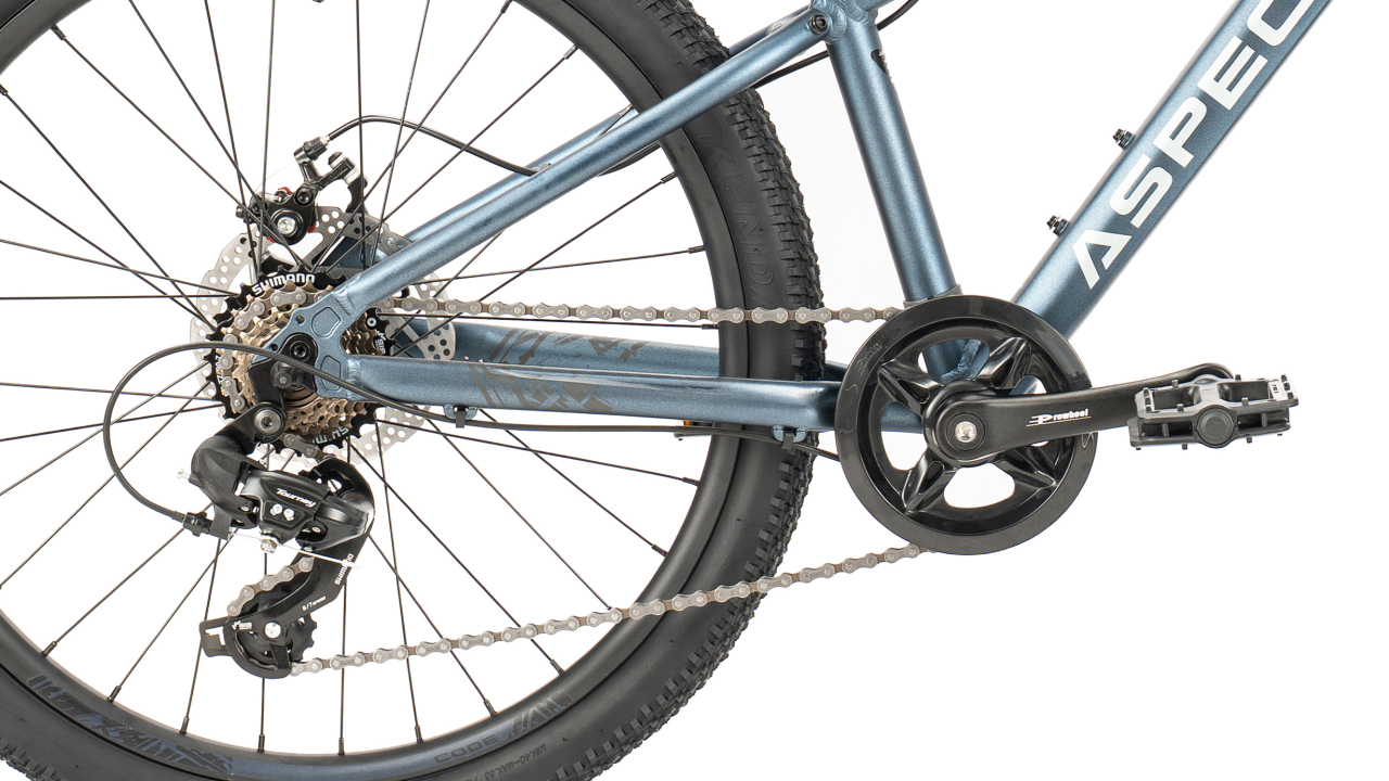Велосипед, предназначенный для детей в возрасте от восьми до тринадцати лет, с оборудованием начального класса Shimano/LTWOO, 7 скоростей. Технические особенности: легкая алюминиевая рама (сплав 6061, частично скрытая проводка, прямой рулевой стакан, кареточный стакан BSA, съемный петух, крепление калипера IS), амортизационная вилка Zoom 565D (пружинно-эластомерная, ход 80 мм, крепление калипера PM), двойные алюминиевые обода (под ниппель AV), дисковые механические тормоза Repute DSC310 (роторы 160/160 мм). Подходит для прогулочной езды по ровным дорогам и по несложной пересеченной местности. Диаметр колес - 24 дюйма. Вес - 13,5 кг.