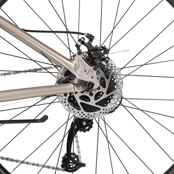 Женский горный велосипед с оборудованием начального класса Microshift, 8 скоростей. Технические особенности: легкая алюминиевая рама (сплав 6061-T6, частично скрытая проводка, прямой рулевой стакан, кареточный стакан BSA, съемный петух, крепление калипера IS), амортизационная вилка Foxxshox (пружинно-эластомерная, ход 50 мм), двойные алюминиевые обода Felgebeiter VB-18 (под AV ниппель), дисковые механические тормоза STG (роторы 160/160 мм), подножка. Подходит для прогулочной езды по различным дорогам и пересеченной местности. Диаметр колес - 27,5 дюймов. Вес - 14,8 кг.