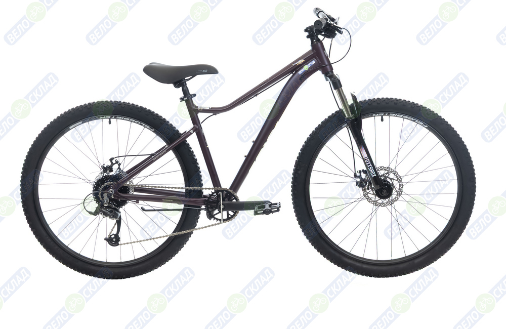 Женский горный велосипед с оборудованием начального класса Microshift, 8 скоростей. Технические особенности: легкая алюминиевая рама (сплав 6061-T6, частично скрытая проводка, прямой рулевой стакан, кареточный стакан BSA, съемный петух, крепление калипера IS), амортизационная вилка Foxxshox (пружинно-эластомерная, ход 50 мм), двойные алюминиевые обода Felgebeiter VB-18 (под AV ниппель), дисковые механические тормоза STG (роторы 160/160 мм), подножка. Подходит для прогулочной езды по различным дорогам и пересеченной местности. Диаметр колес - 27,5 дюймов. Вес - 14,8 кг.