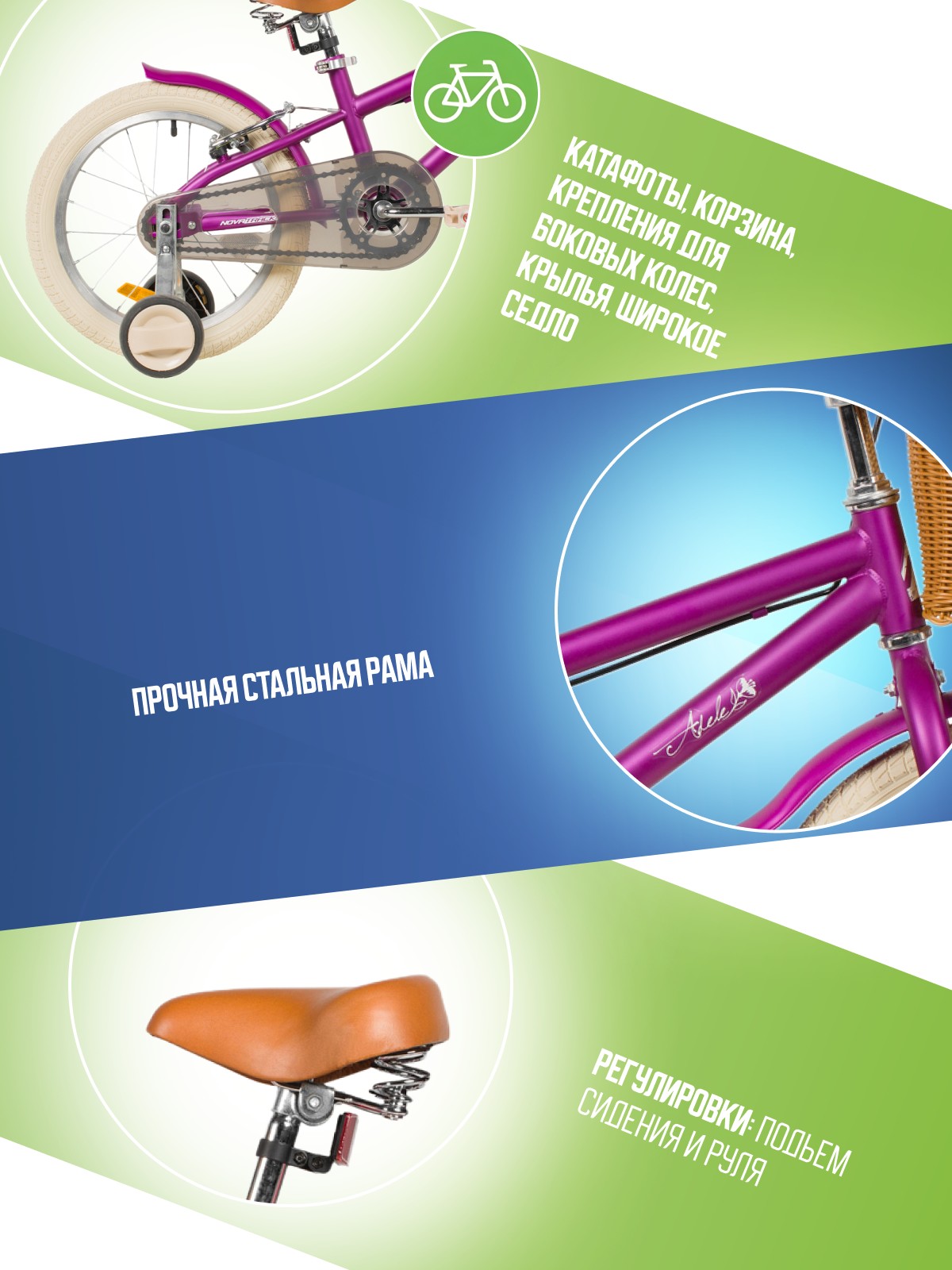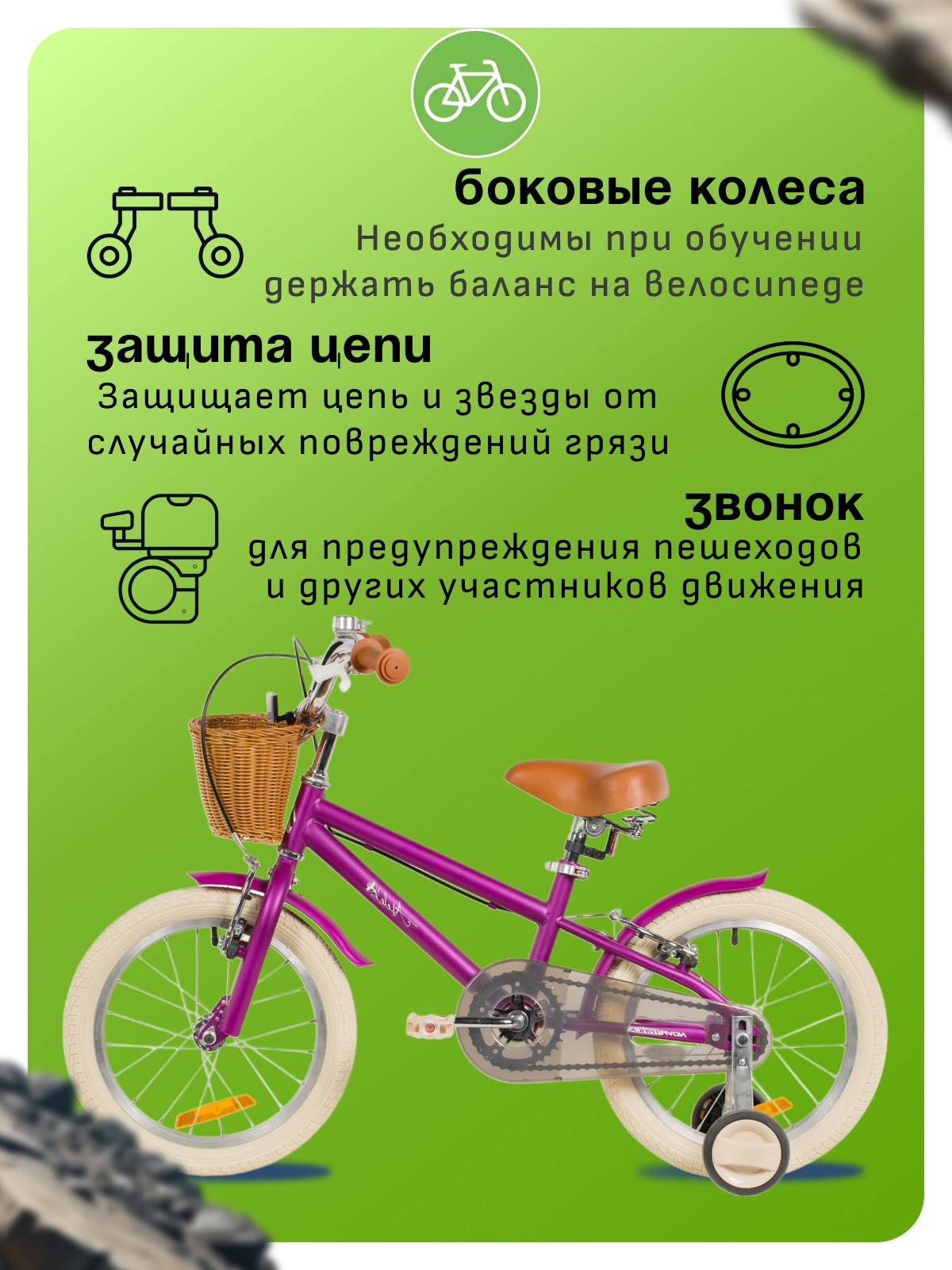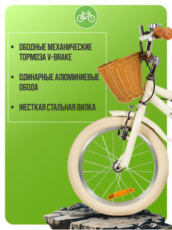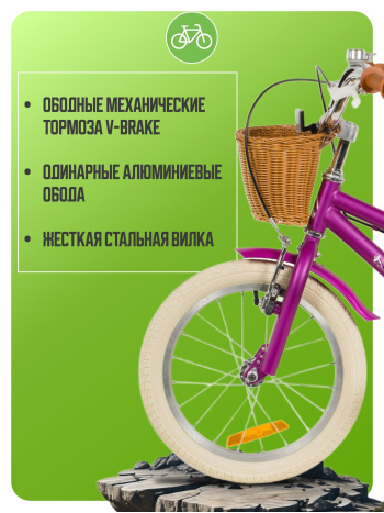 Велосипед, предназначенный для девочек в возрасте от трех до шести лет, без переключения передач. Технические особенности: прочная стальная рама, жесткая стальная вилка, одинарные алюминиевые обода (ниппель AV), ободные механические тормоза V-brake, полная защита цепи, съемные боковые колеса, крылья, передняя корзинка, звонок, катафоты. Подходит для обучения и прогулочного катания в городских условиях. Диаметр колес - 16 дюймов. Вес - 10,3 кг.