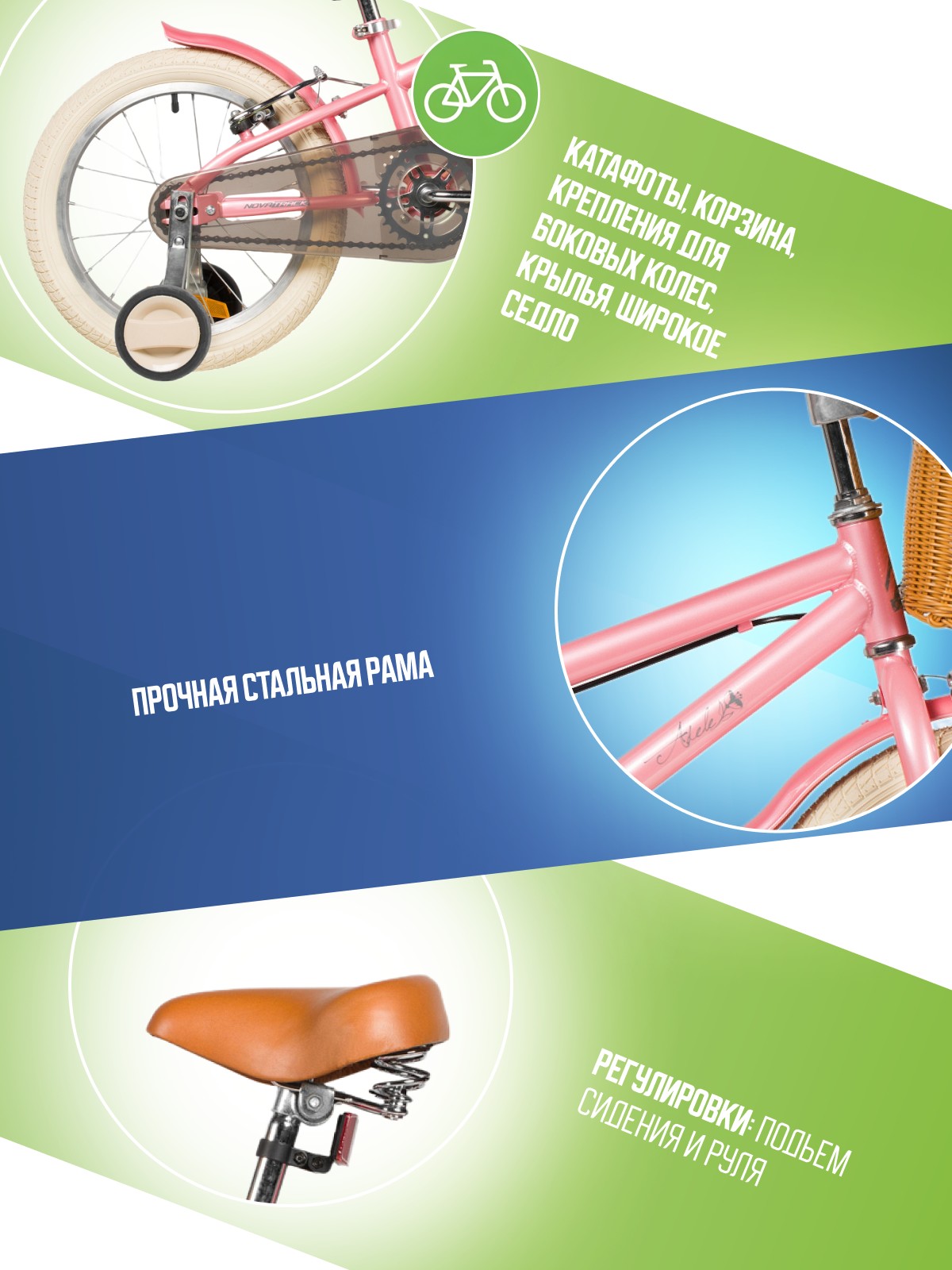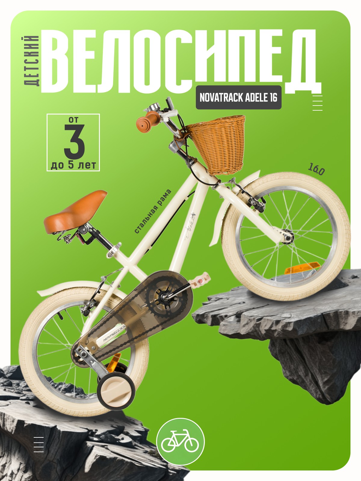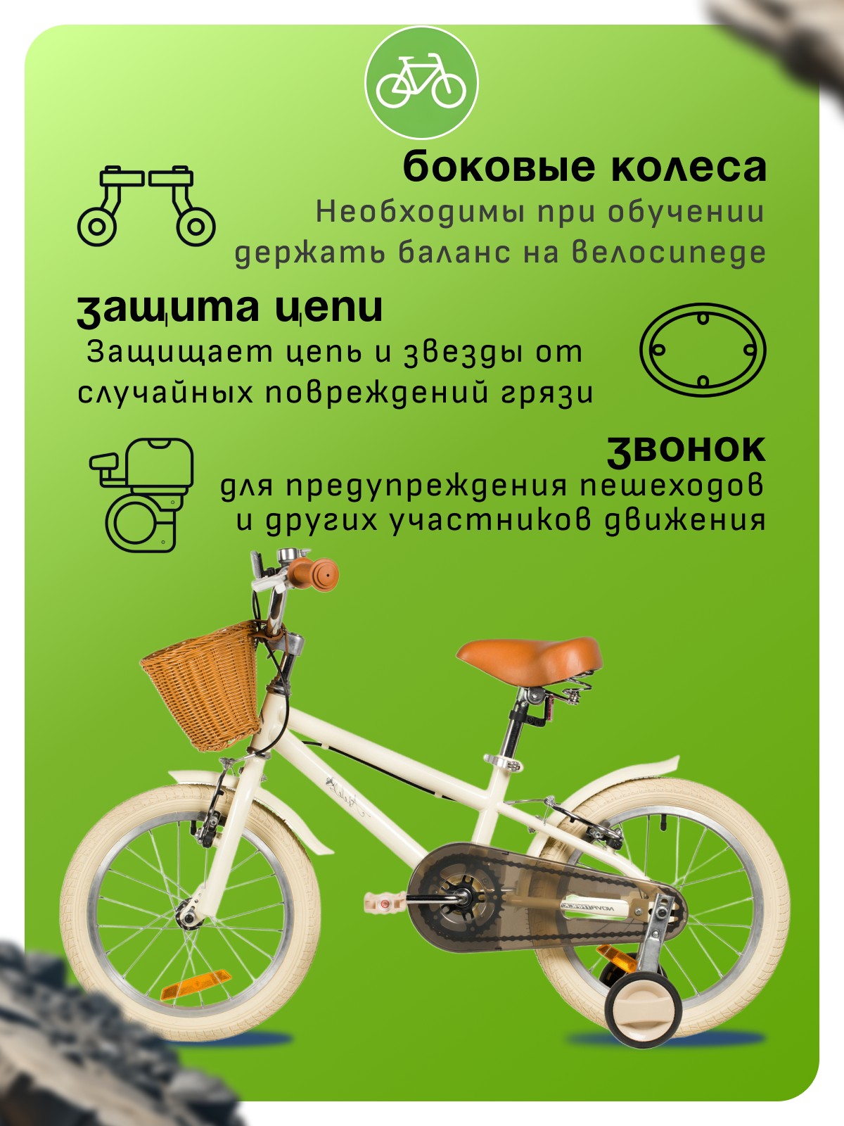 Велосипед, предназначенный для девочек в возрасте от трех до шести лет, без переключения передач. Технические особенности: прочная стальная рама, жесткая стальная вилка, одинарные алюминиевые обода (ниппель AV), ободные механические тормоза V-brake, полная защита цепи, съемные боковые колеса, крылья, передняя корзинка, звонок, катафоты. Подходит для обучения и прогулочного катания в городских условиях. Диаметр колес - 16 дюймов. Вес - 10,3 кг.