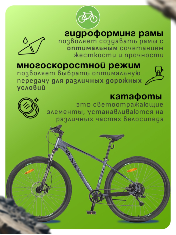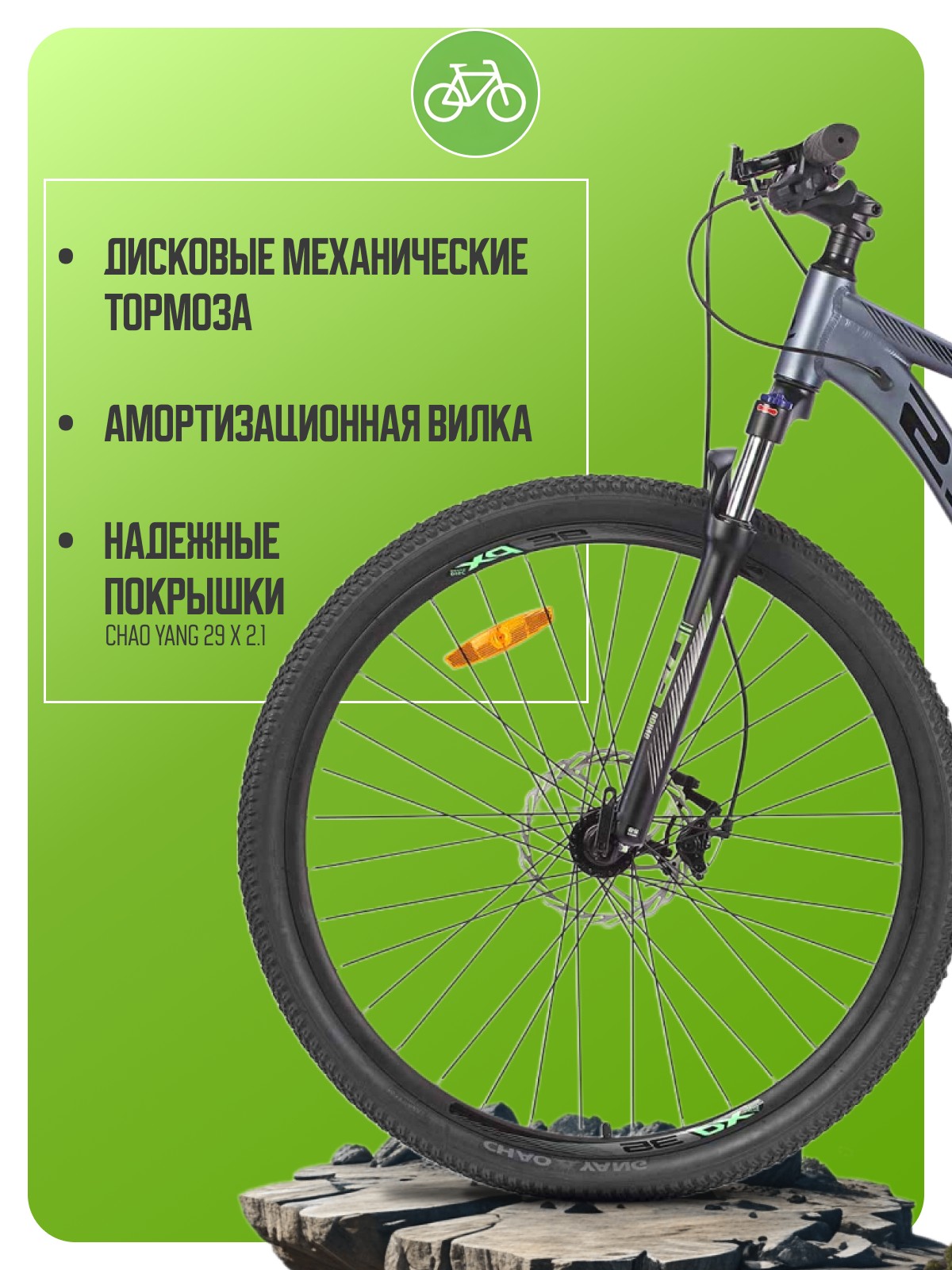 Хардтейл для езды в стиле кросс-кантри с оборудованием любительского класса LTWOO, 9 скоростей. Технические особенности: легкая алюминиевая рама (гидроформинг, скрытая проводка, кареточный стакан BSA, прямой рулевой стакан, крепление калипера IS, съемный петух), амортизационная вилка Uding (пружинно-эластомерная, алюминиевая корона, магниевые штаны, ход 80 мм, блокировка, регулировка преднагрузки), двойные алюминиевые обода (ниппель AV), дисковые механические тормоза (роторы 180/160 мм), катафоты, подножка. Подходит для активной езды по различным дорогам и пересеченной местности. Диаметр колес - 29 дюймов. Вес - 15,9 кг.