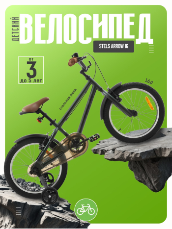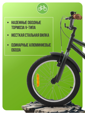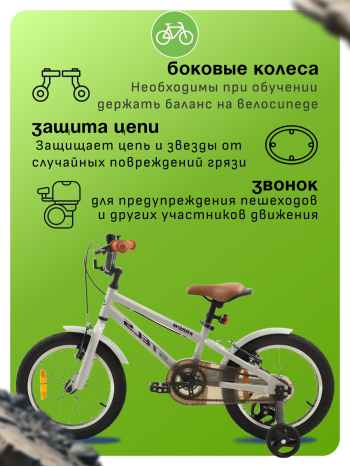 Велосипед, предназначенный для детей в возрасте от трех до шести лет, без переключения передач. Технические особенности: прочная стальная рама (открытая проводка, прямой рулевой стакан), жесткая стальная вилка, одинарные алюминиевые обода (под ниппель AV), надежные ободные тормоза V-типа, полная защита цепи, крылья, съемные боковые колес, катафоты, звонок. Подходит для обучения и прогулочного катания в городских условиях. Диаметр колес - 16 дюймов. Вес - 10,1 кг.