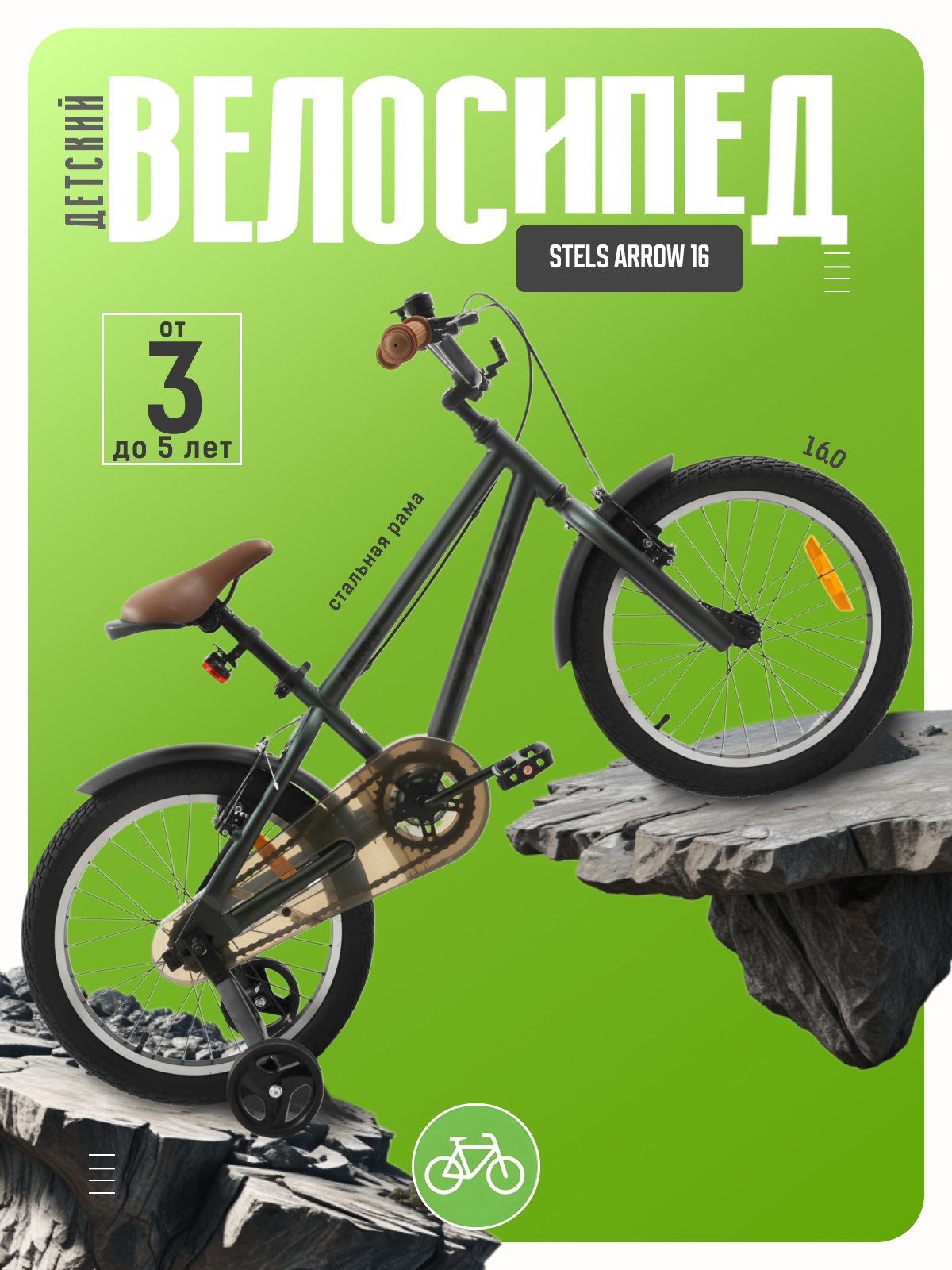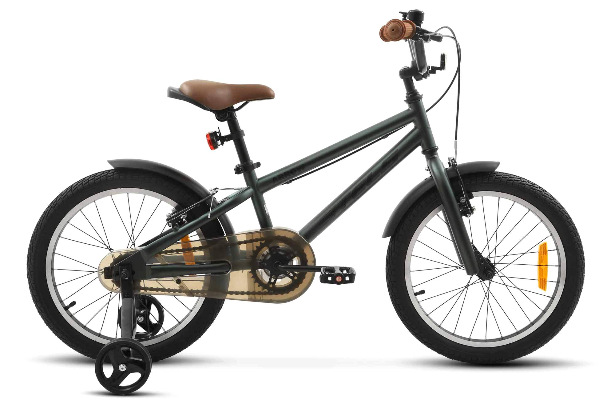 Велосипед, предназначенный для детей в возрасте от трех до шести лет, без переключения передач. Технические особенности: прочная стальная рама (открытая проводка, прямой рулевой стакан), жесткая стальная вилка, одинарные алюминиевые обода (под ниппель AV), надежные ободные тормоза V-типа, полная защита цепи, крылья, съемные боковые колес, катафоты, звонок. Подходит для обучения и прогулочного катания в городских условиях. Диаметр колес - 16 дюймов. Вес - 10,1 кг.
