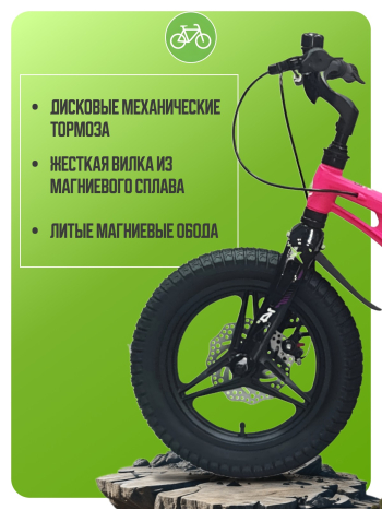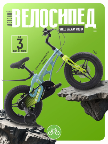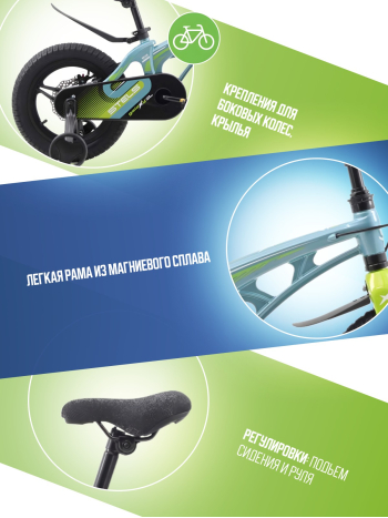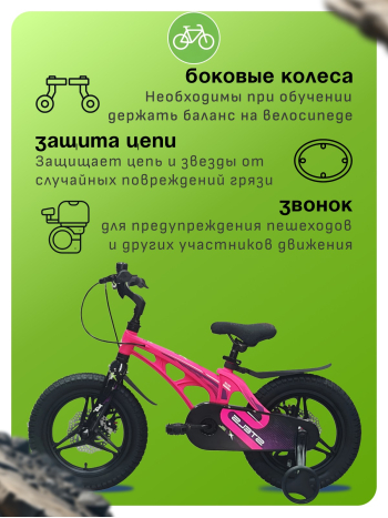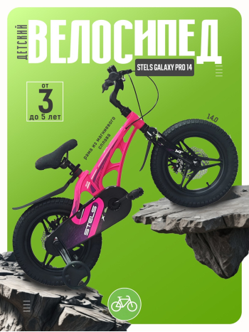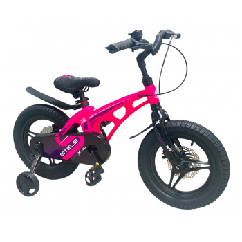 Велосипед, предназначенный для детей в возрасте от двух до четырех лет, без переключения передач. Технические особенности: легкая рама из магниевого сплава, жесткая вилка из магниевого сплава, литые магниевые обода (под AV ниппель), дисковые механические тормоза (роторы 140/140 мм), защита цепи, съемные боковые колеса, пластиковые крылья, звонок. Подходит для обучения и прогулочного катания в городских условиях. Диаметр колес - 14 дюймов. Вес - 7,9 кг.
