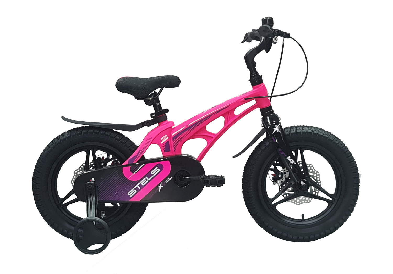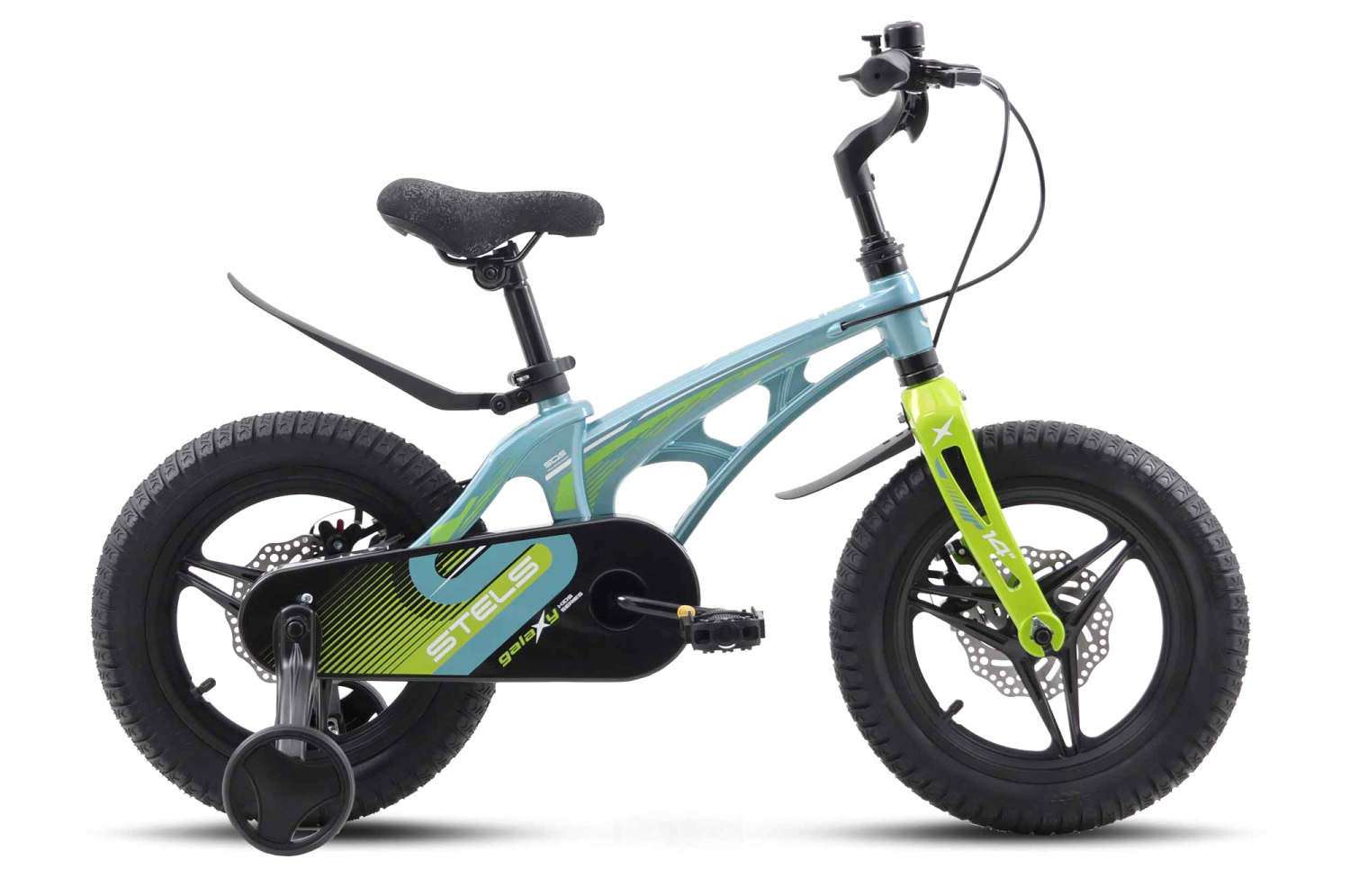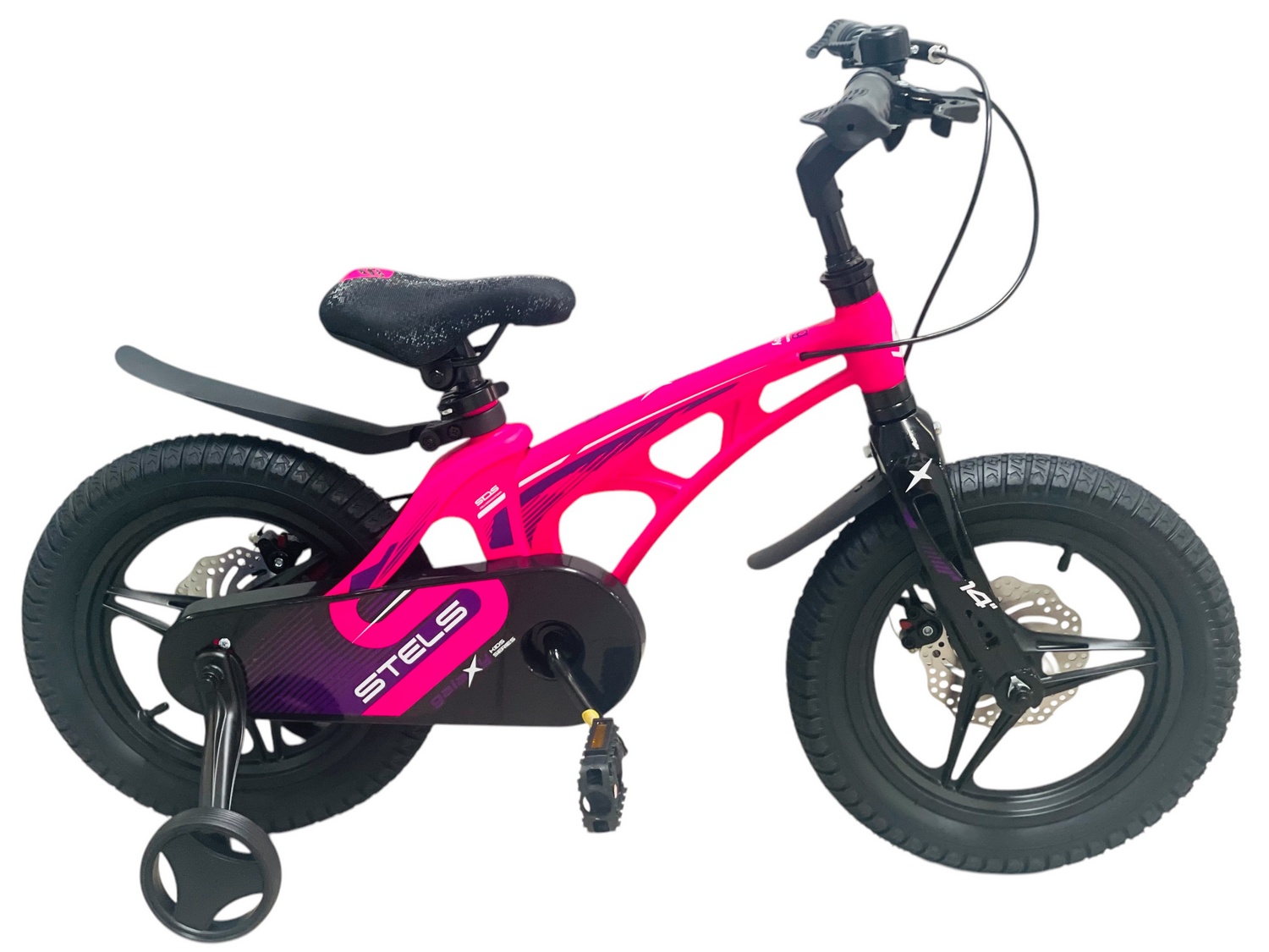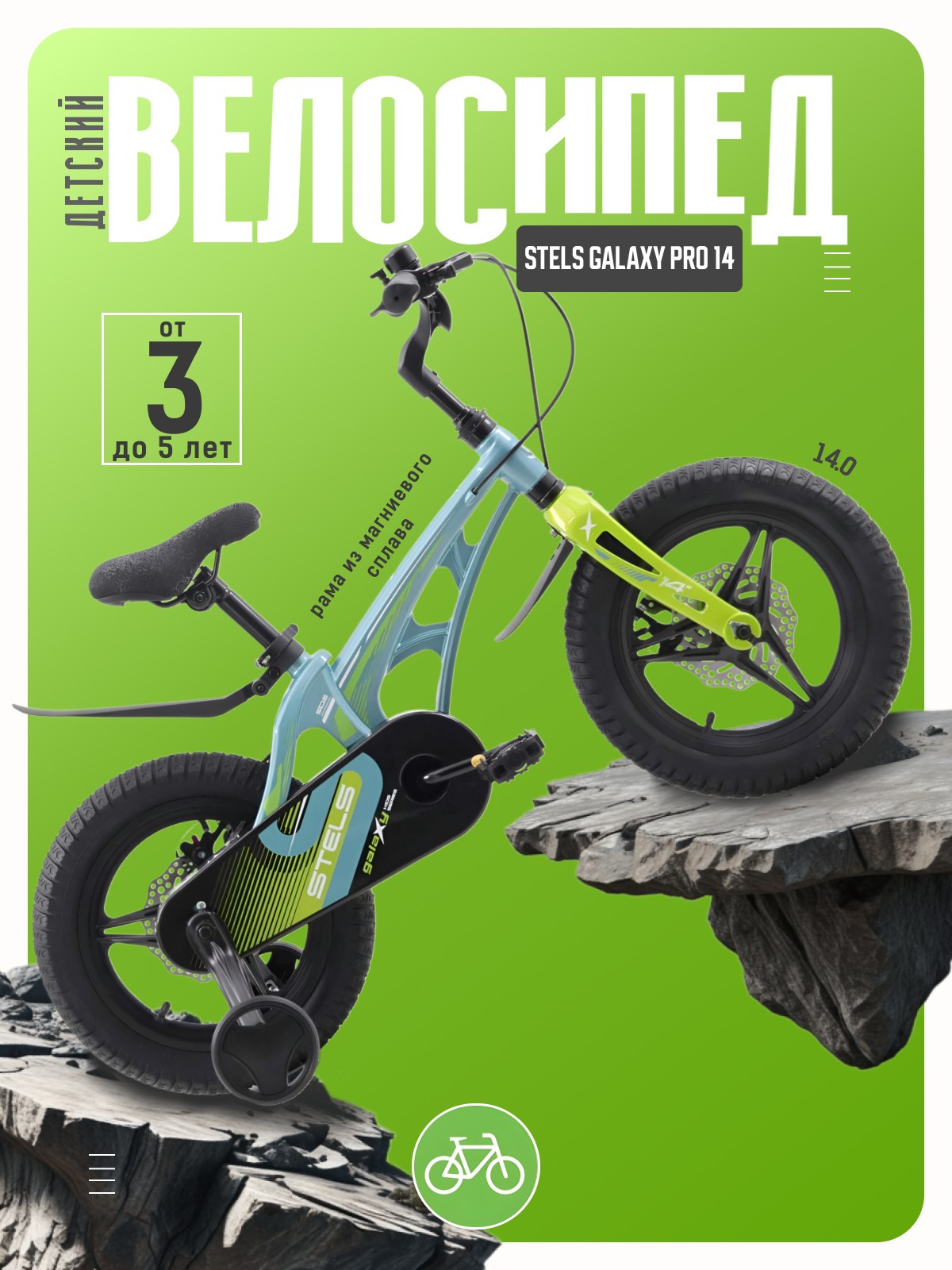 Велосипед, предназначенный для детей в возрасте от двух до четырех лет, без переключения передач. Технические особенности: легкая рама из магниевого сплава, жесткая вилка из магниевого сплава, литые магниевые обода (под AV ниппель), дисковые механические тормоза (роторы 140/140 мм), защита цепи, съемные боковые колеса, пластиковые крылья, звонок. Подходит для обучения и прогулочного катания в городских условиях. Диаметр колес - 14 дюймов. Вес - 7,9 кг.