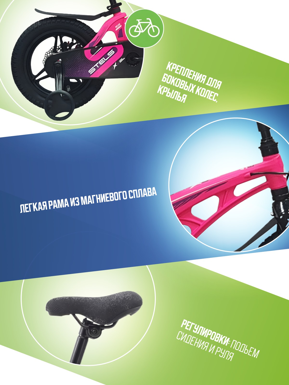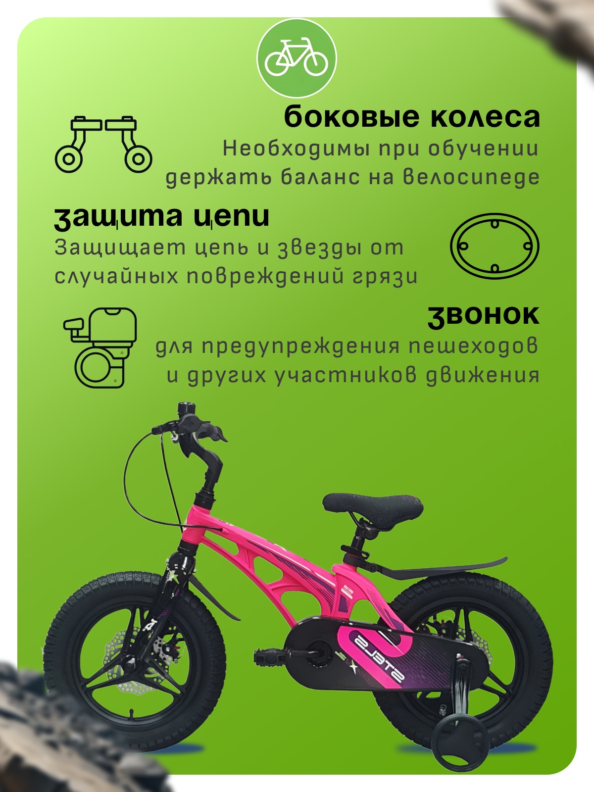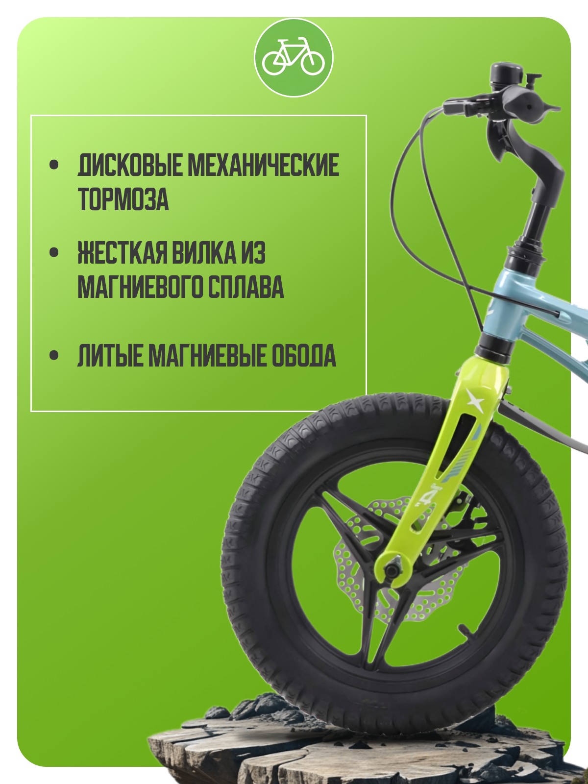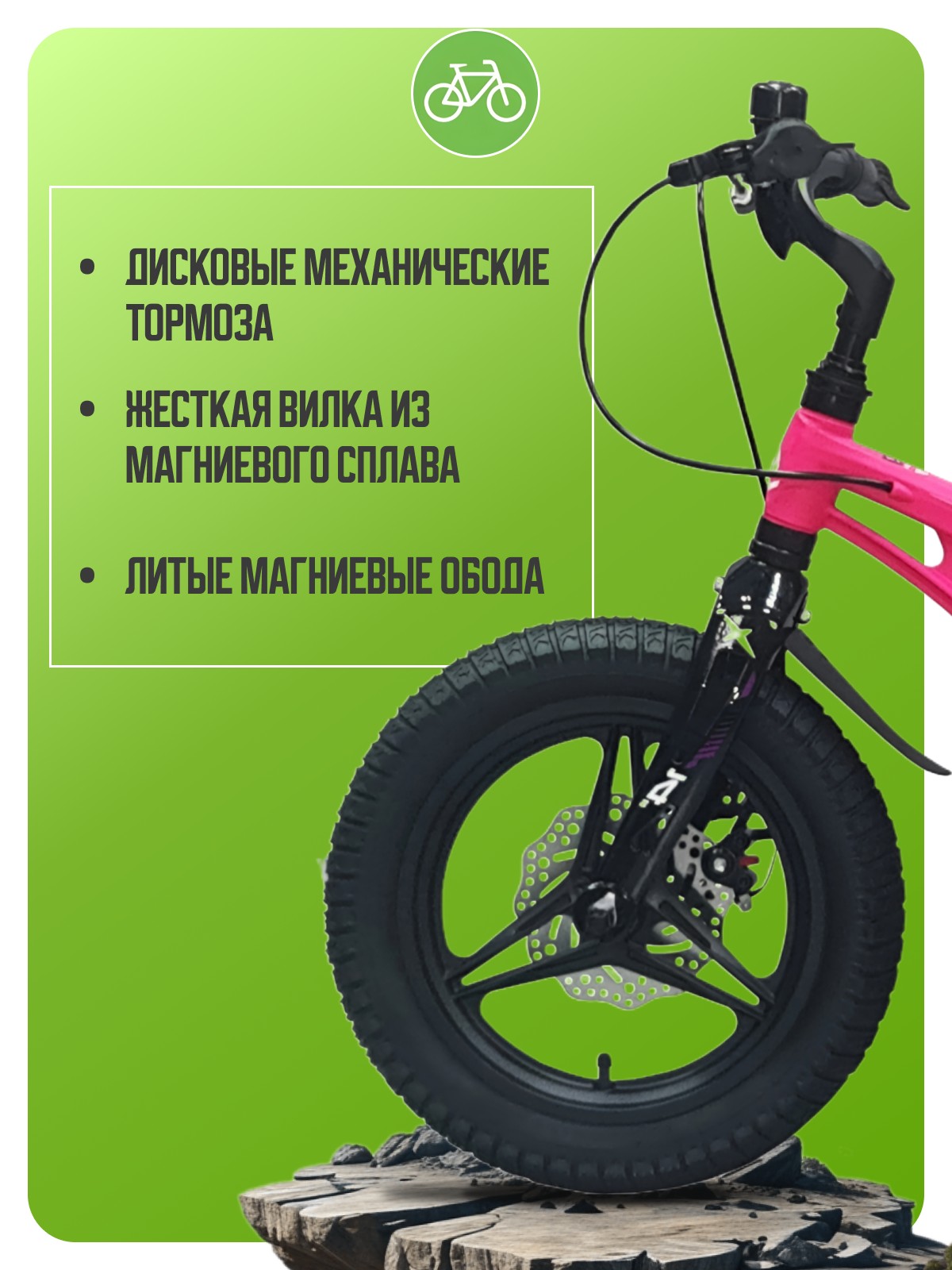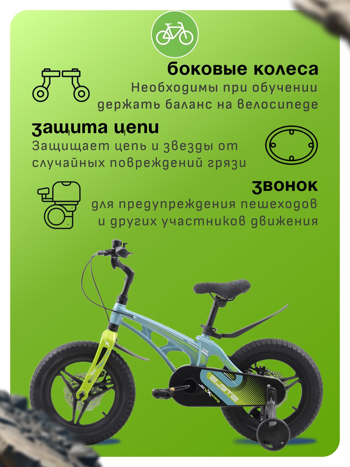 Велосипед, предназначенный для детей в возрасте от двух до четырех лет, без переключения передач. Технические особенности: легкая рама из магниевого сплава, жесткая вилка из магниевого сплава, литые магниевые обода (под AV ниппель), дисковые механические тормоза (роторы 140/140 мм), защита цепи, съемные боковые колеса, пластиковые крылья, звонок. Подходит для обучения и прогулочного катания в городских условиях. Диаметр колес - 14 дюймов. Вес - 7,9 кг.
