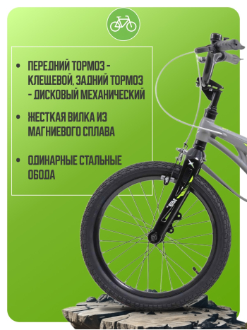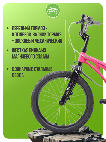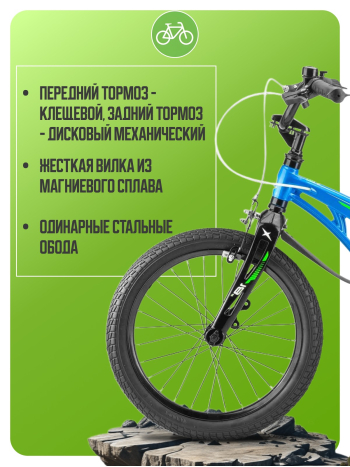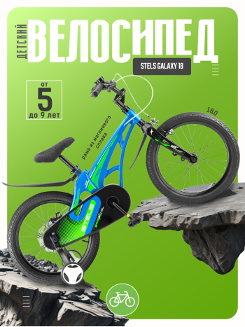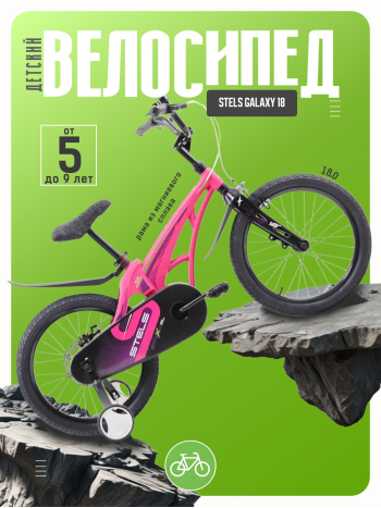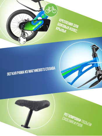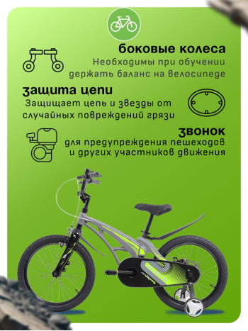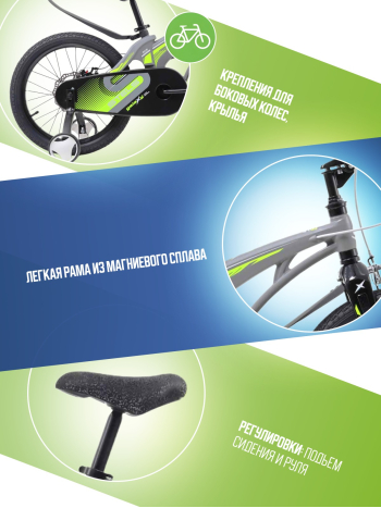 Велосипед, предназначенный для детей в возрасте от четырех до восьми лет, без переключения передач. Технические особенности: легкая рама из магниевого сплава, жесткая вилка из магниевого сплава, одинарные стальные обода (под AV ниппель), передний тормоз - клещевой, задний тормоз - дисковый механический (ротор 140 мм), защита цепи, съемные боковые колеса, пластиковые крылья, звонок. Подходит для обучения и прогулочного катания в городских условиях. Диаметр колес - 18 дюймов. Вес - 10,4 кг.