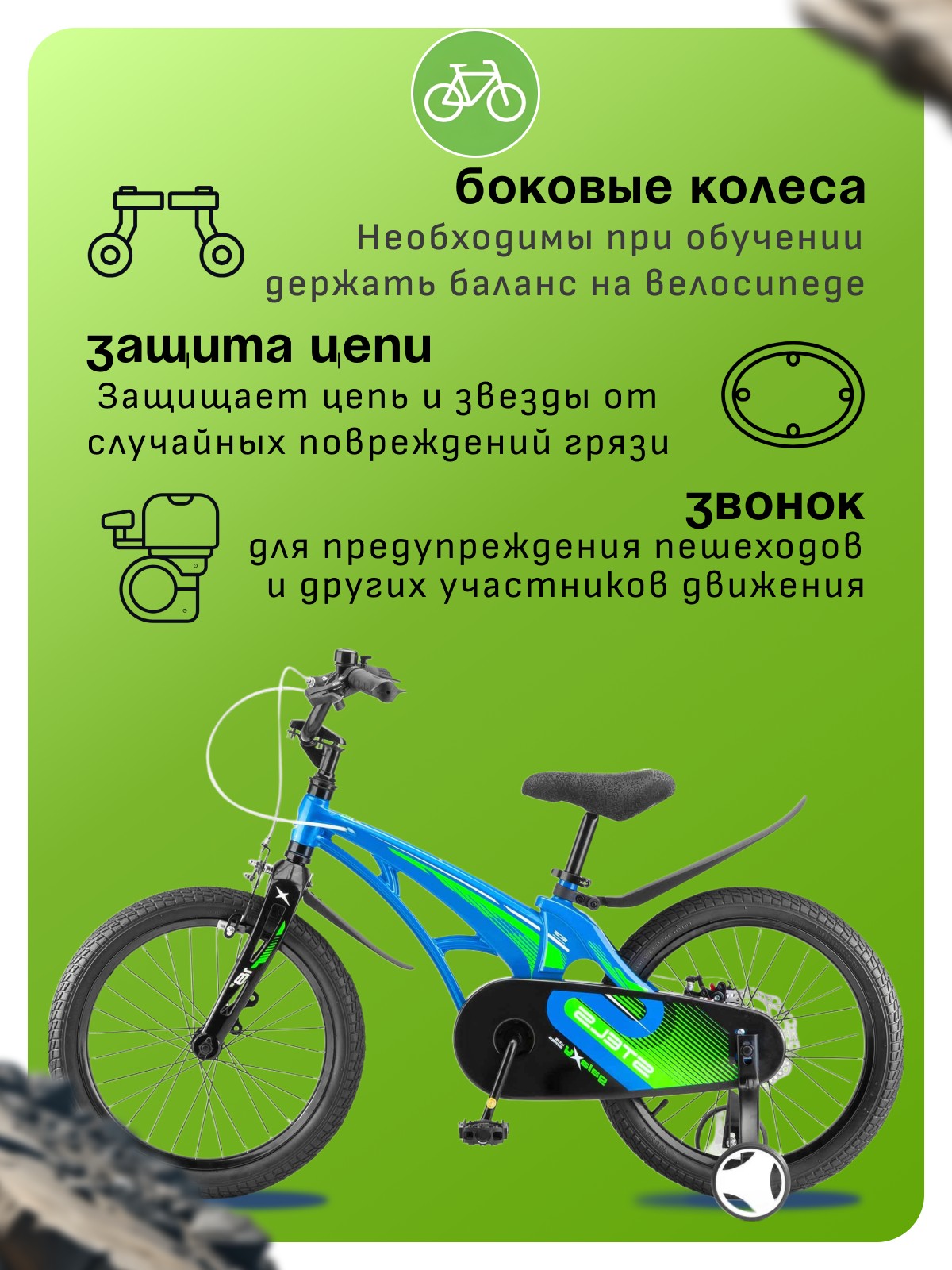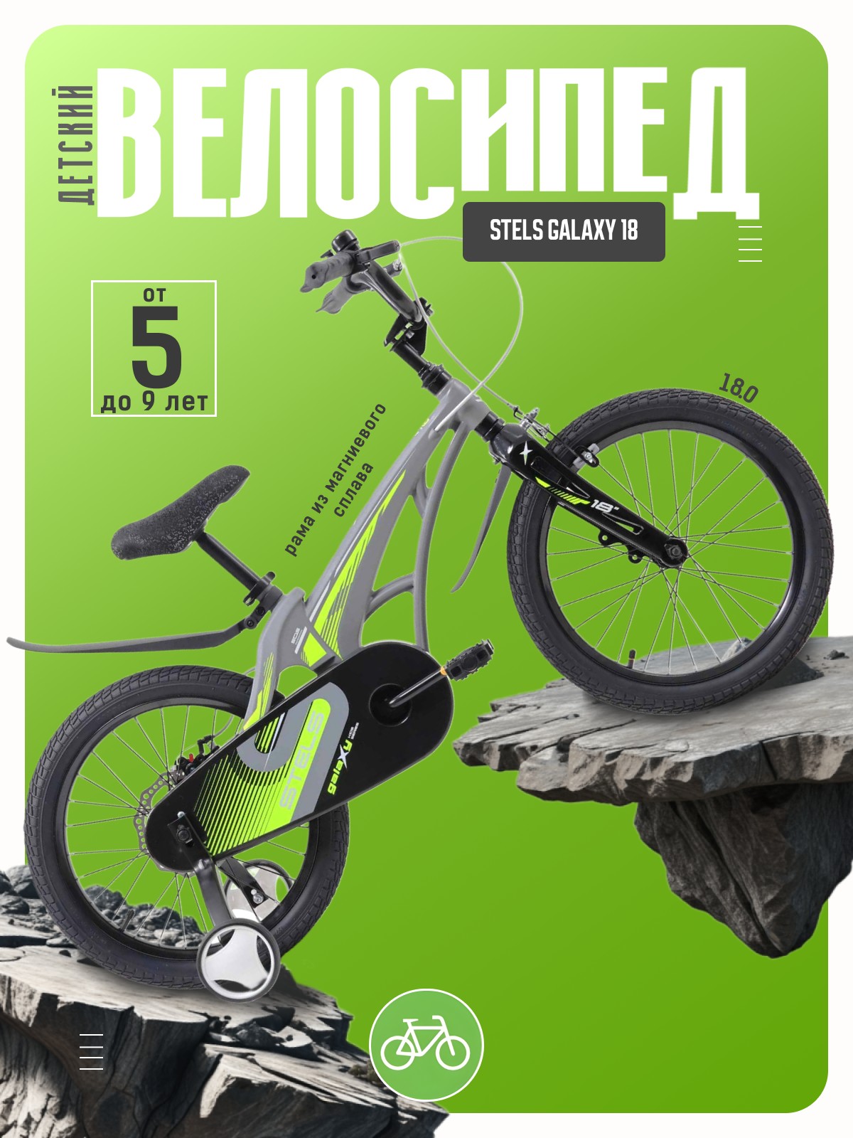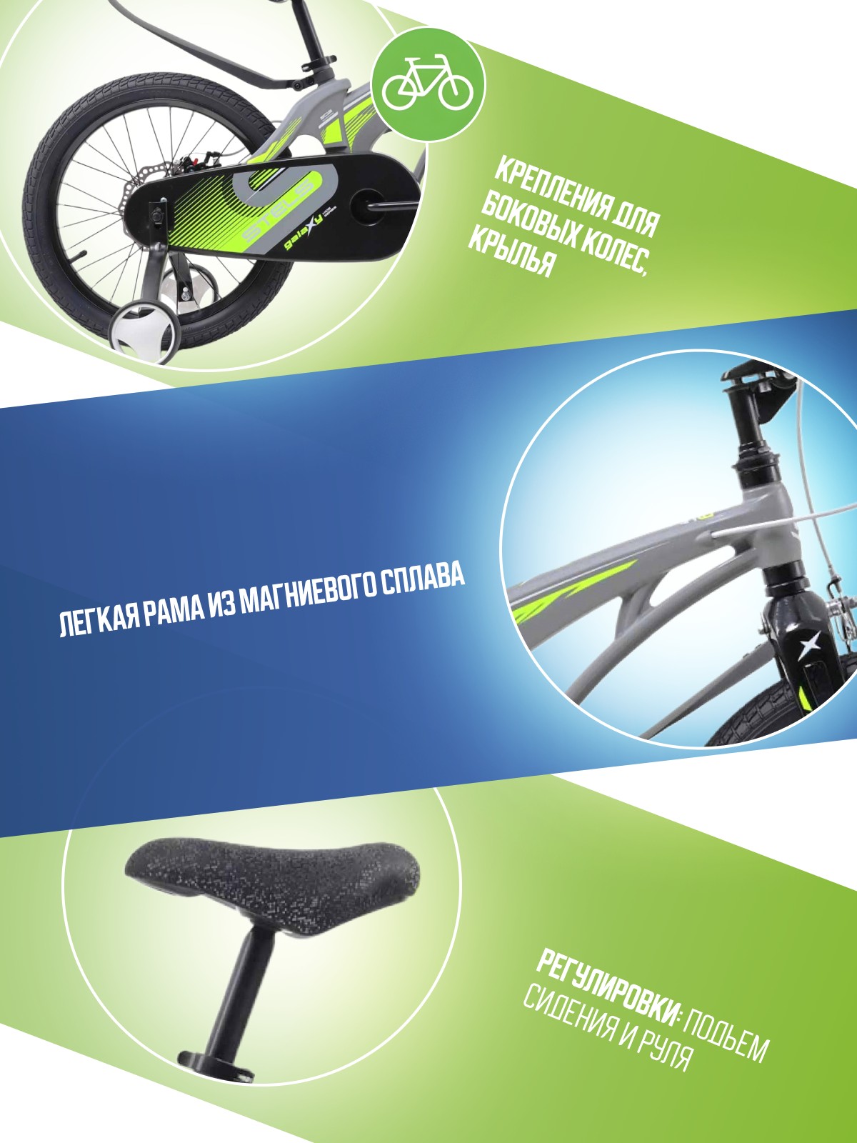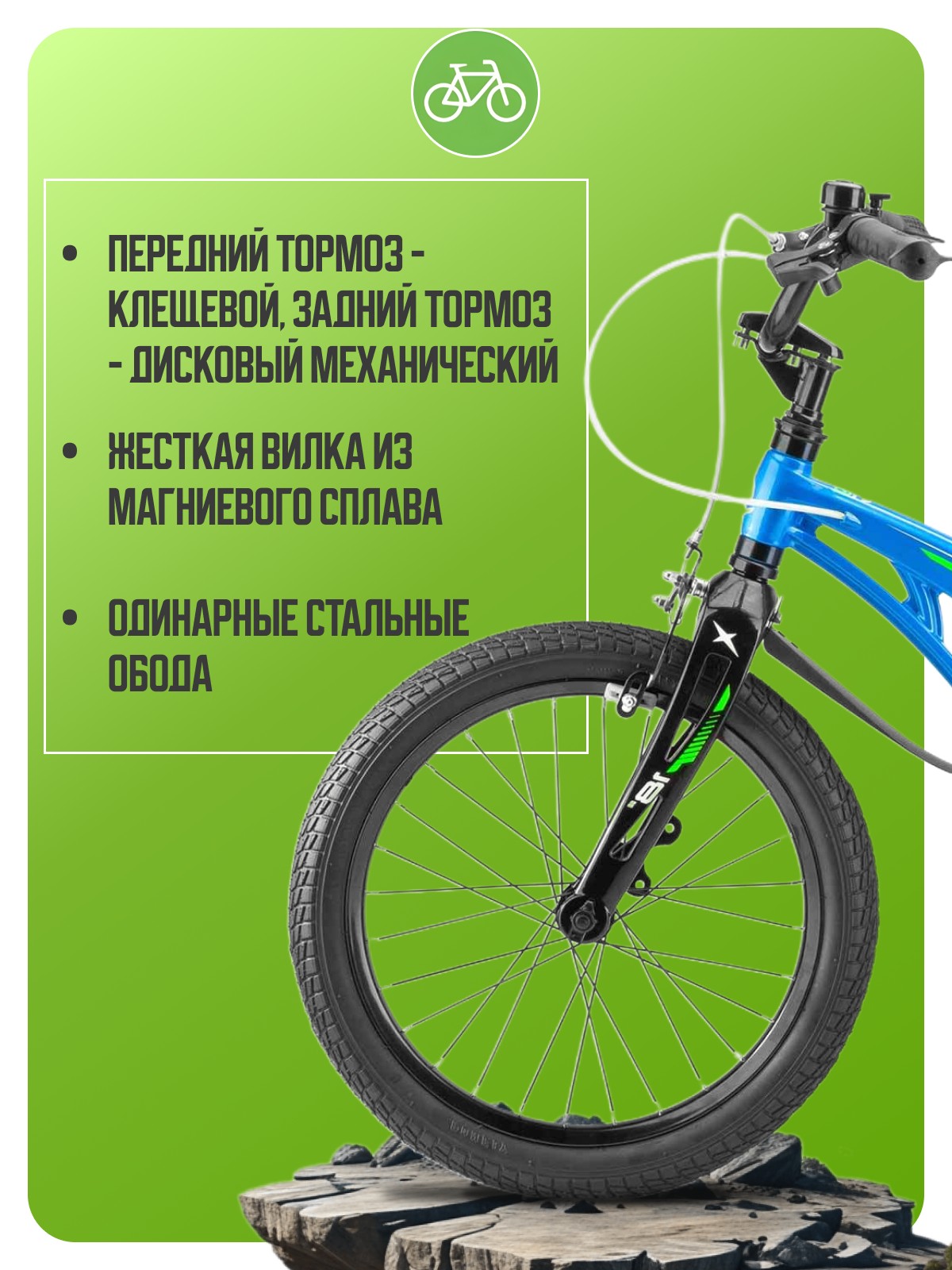 Велосипед, предназначенный для детей в возрасте от четырех до восьми лет, без переключения передач. Технические особенности: легкая рама из магниевого сплава, жесткая вилка из магниевого сплава, одинарные стальные обода (под AV ниппель), передний тормоз - клещевой, задний тормоз - дисковый механический (ротор 140 мм), защита цепи, съемные боковые колеса, пластиковые крылья, звонок. Подходит для обучения и прогулочного катания в городских условиях. Диаметр колес - 18 дюймов. Вес - 10,4 кг.