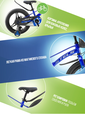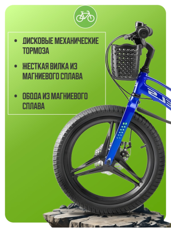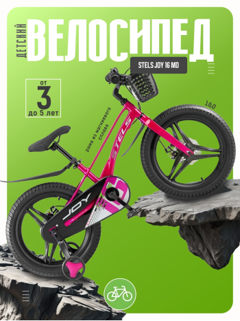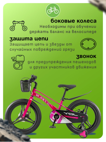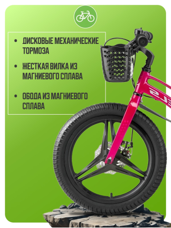 Велосипед, предназначенный для детей в возрасте от трех до шести лет, без переключения передач. Технические особенности: легкая рама из магниевого сплава, жесткая вилка из магниевого сплава, дисковые механические тормоза (роторы 140/140 мм), полная защита цепи, съемные боковые колеса, крылья, передняя корзина, звонок. Подходит для обучения и легких прогулок. Диаметр колес - 16 дюймов. Вес - 9,1 кг.
