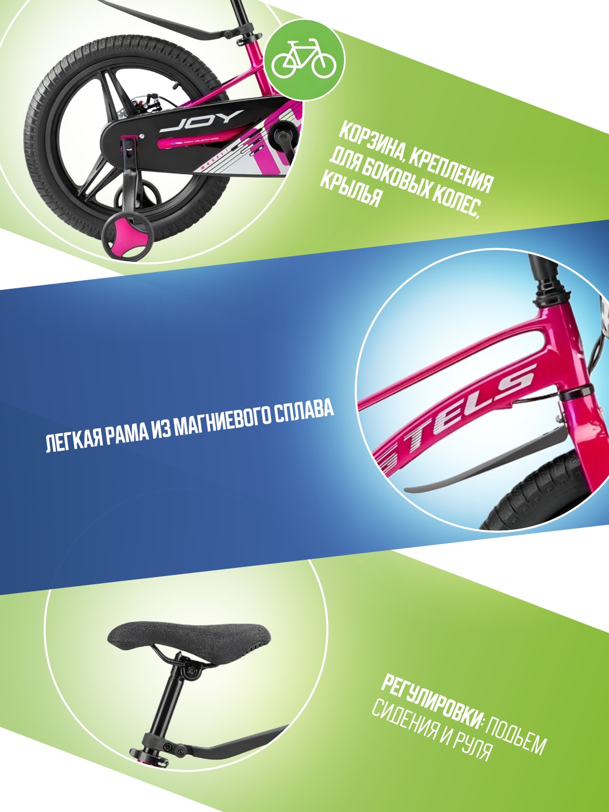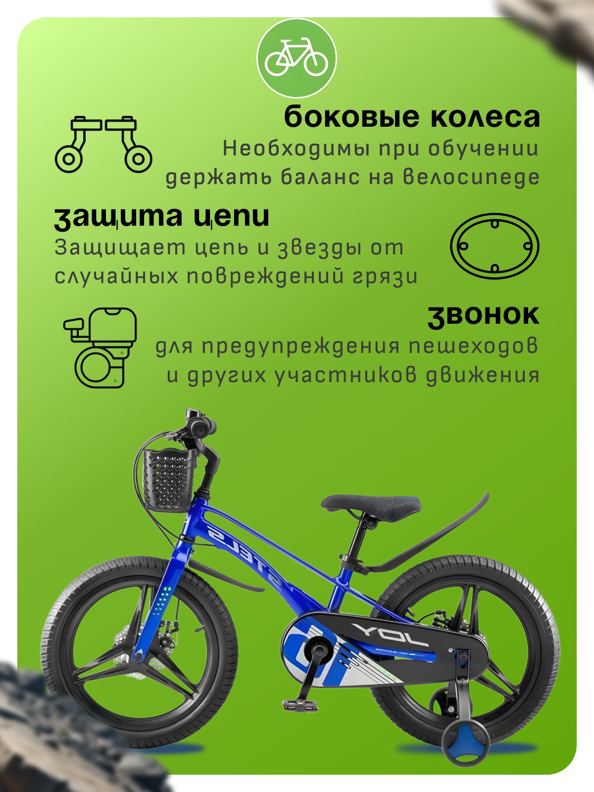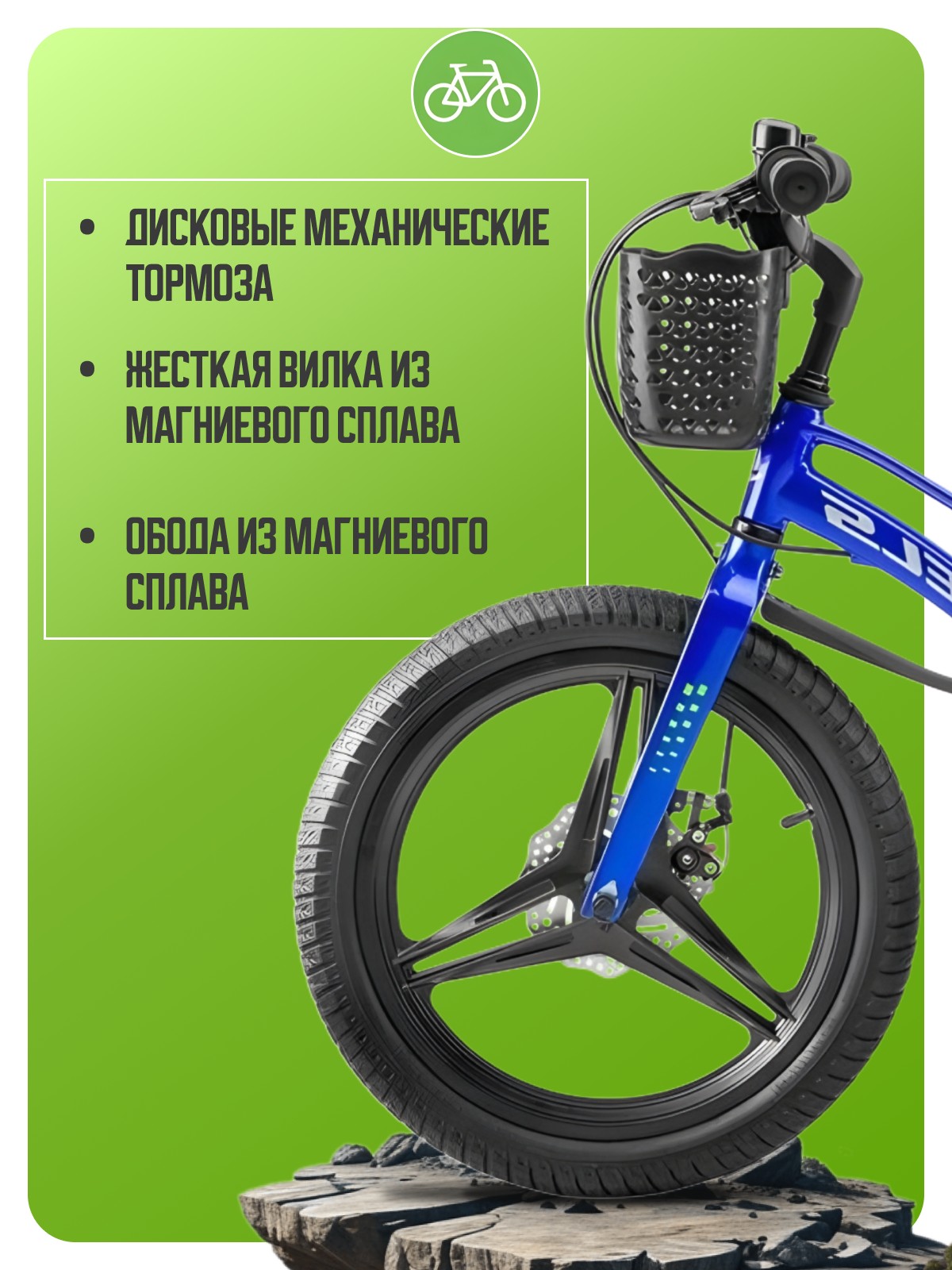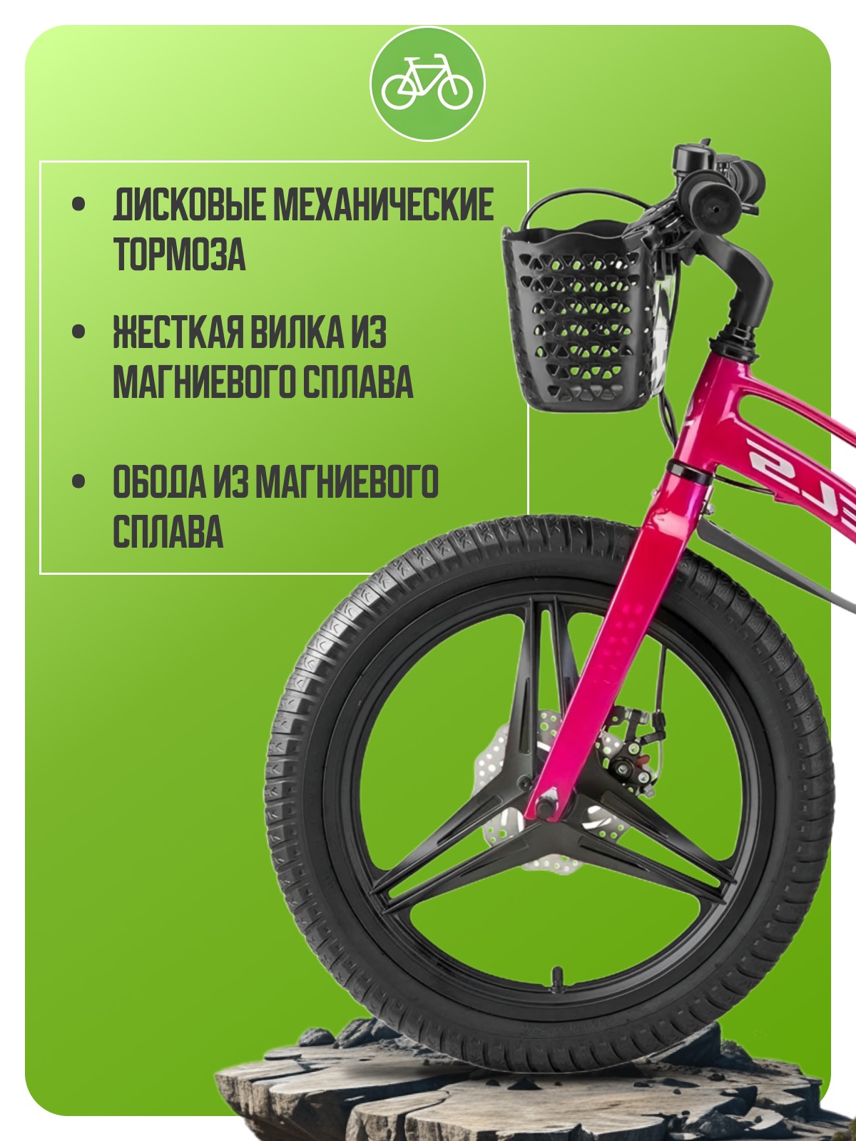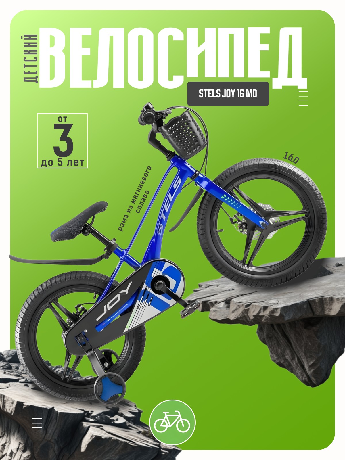 Велосипед, предназначенный для детей в возрасте от трех до шести лет, без переключения передач. Технические особенности: легкая рама из магниевого сплава, жесткая вилка из магниевого сплава, дисковые механические тормоза (роторы 140/140 мм), полная защита цепи, съемные боковые колеса, крылья, передняя корзина, звонок. Подходит для обучения и легких прогулок. Диаметр колес - 16 дюймов. Вес - 9,1 кг.