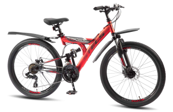 Двухподвес, предназначенный для детей в возрасте от восьми до тринадцати лет, с оборудованием начального класса Shimano, 21 скорость. Технические особенности: прочная стальная рама (полноподвесная, открытая проводка, прямой рулевой стакан, кареточный стакан BSA), амортизационная вилка Zoom (пружинно-эластомерная, ход 50 мм, крепление калипера IS), задний амортизатор, двойные алюминиевые обода (под AV ниппель), дисковые механические тормоза (роторы 140/140 мм), защита передней звезды, подножка, катафоты, звонок, крылья. Подходит для прогулочного катания в городских условиях и по несложным маршрутам в лесу. Диаметр колес - 24 дюйма. Вес - 17,7 кг.