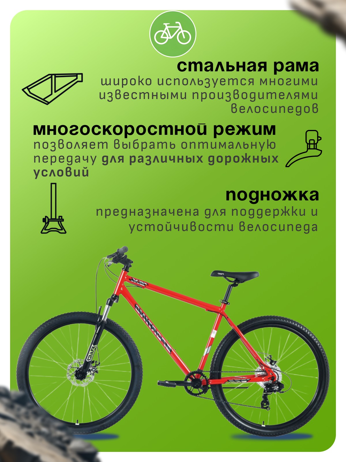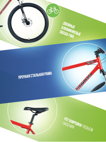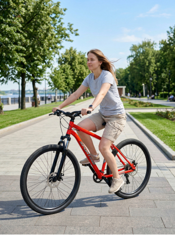 Горный велосипед для начинающих с оборудованием начального класса Shimano, 8 скоростей. Технические особенности: прочная стальная рама (открытая проводка, кареточный стакан BSA, интегрированный петух, прямой рулевой стакан, крепление калипера IS), жесткая стальная вилка (крепление калипера IS), двойные алюминиевые обода (под AV ниппель), дисковые механические тормоза (роторы 160/160 мм), полноразмерные крылья, задний багажник, катафоты. Подходит для прогулочного катания в городских условиях и по несложным маршрутам в лесу. Диаметр колес - 27,5 дюймов. Вес - 18,6 кг.