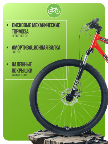 Горный велосипед для начинающих с навесным оборудованием Shimano/Microshift, 8 скоростей. Технические особенности: прочная стальная рама (открытая прокладка тросов, прямой рулевой стакан, кареточный стакан BSA, крепление калипера IS, интегрированный петух, бонки для багажника и флягодержателя), амортизационная вилка FWD 286 (пружинно-эластомерная, стальная с алюминиевой короной, ход 80 мм, крепление калипера IS), двойные алюминиевые обода FWD (под AV ниппель), дисковые механические тормоза Repute DSC-310 (роторы 160/160 мм с креплением на 6 болтов), подножка. Подходит для прогулочной езды по различным дорогам и пересеченной местности. Диаметр колес - 29 дюймов. Вес - 17,3 кг.