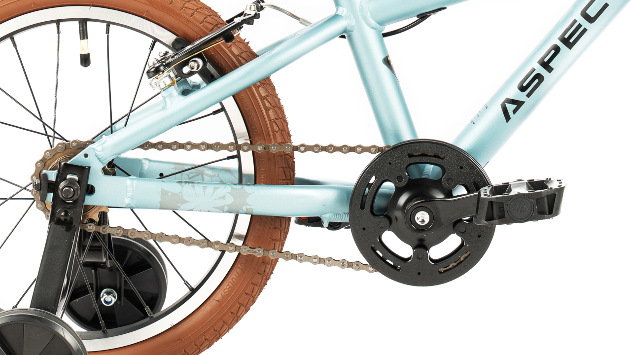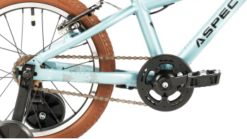 Велосипед, предназначенный для детей в возрасте от трех до шести лет, без переключения передач. Технические особенности: легкая алюминиевая рама (сплав 6061, частично скрытая проводка, кареточный стакан BSA, прямой рулевой стакан ZS, прямые дропауты), жесткая алюминиевая вилка, одинарные алюминиевые обода (под AV ниппель, 20Н), надежный ободной тормоз V-Brake (задний), защита цепи, съемные боковые колеса. Подходит для обучения и прогулочного катания в городских условиях. Диаметр колес - 16 дюймов. Вес - 9,5 кг.