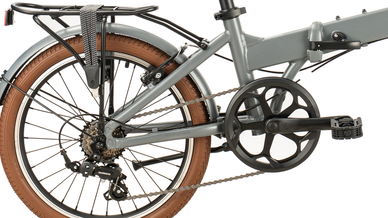 Складной прогулочный велосипед с оборудованием начального класса Shimano, 7 скоростей. Технические особенности: алюминиевая рама (складной механизм, открытая проводка, прямой рулевой стакан, каретоный стакан BSA), жесткая стальная вилка, двойные алюминиевые обода (под AV ниппель), надежные ободные тормоза Tektro V-brake, защита цепи, задний багажник, полноразмерные крылья, звонок, подножка, катафоты, складные педали. Подходит для прогулочного катания в городских условиях. Диаметр колес - 20 дюймов. Вес - 12,5 кг.