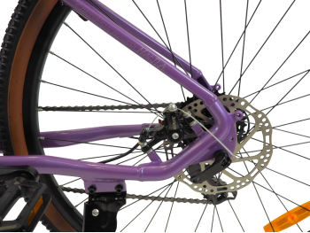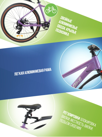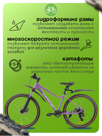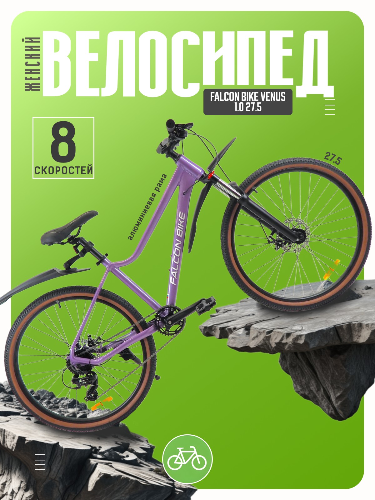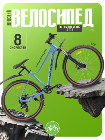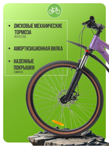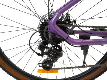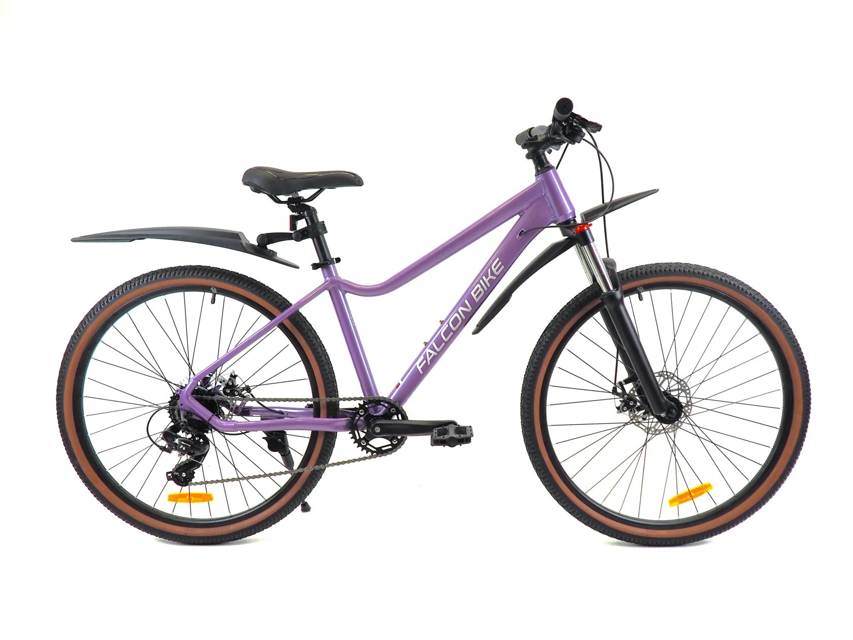 Женский горный велосипед с оборудованием начального класса Shimano/Microshift, 8 скоростей. Технические особенности: легкая алюминиевая рама (скрытая проводка, прямой рулевой стакан, кареточный стакан BSA, съемный петух, крепление калипера PM), амортизационная вилка (пружинно-эластомерная, ход 100 мм, механическая блокировка, регулировка преднагрузки, крепление калипера PM), двойные алюминиевые обода (под AV ниппель), дисковые механические тормоза Repute DSC (роторы 160/160 мм), пластиковые крылья, катафоты, подножка. Подходит для активной езды по различным дорогам и пересеченной местности. Диаметр колес - 27,5 дюймов. Вес - 14,9 кг.