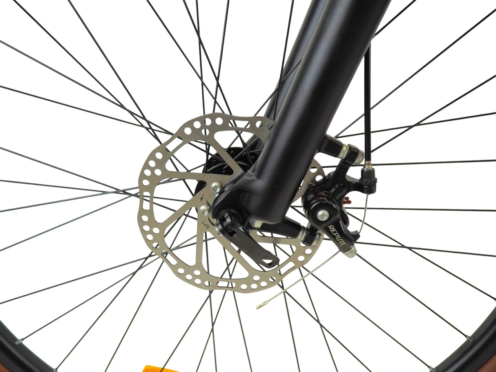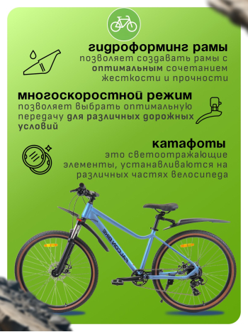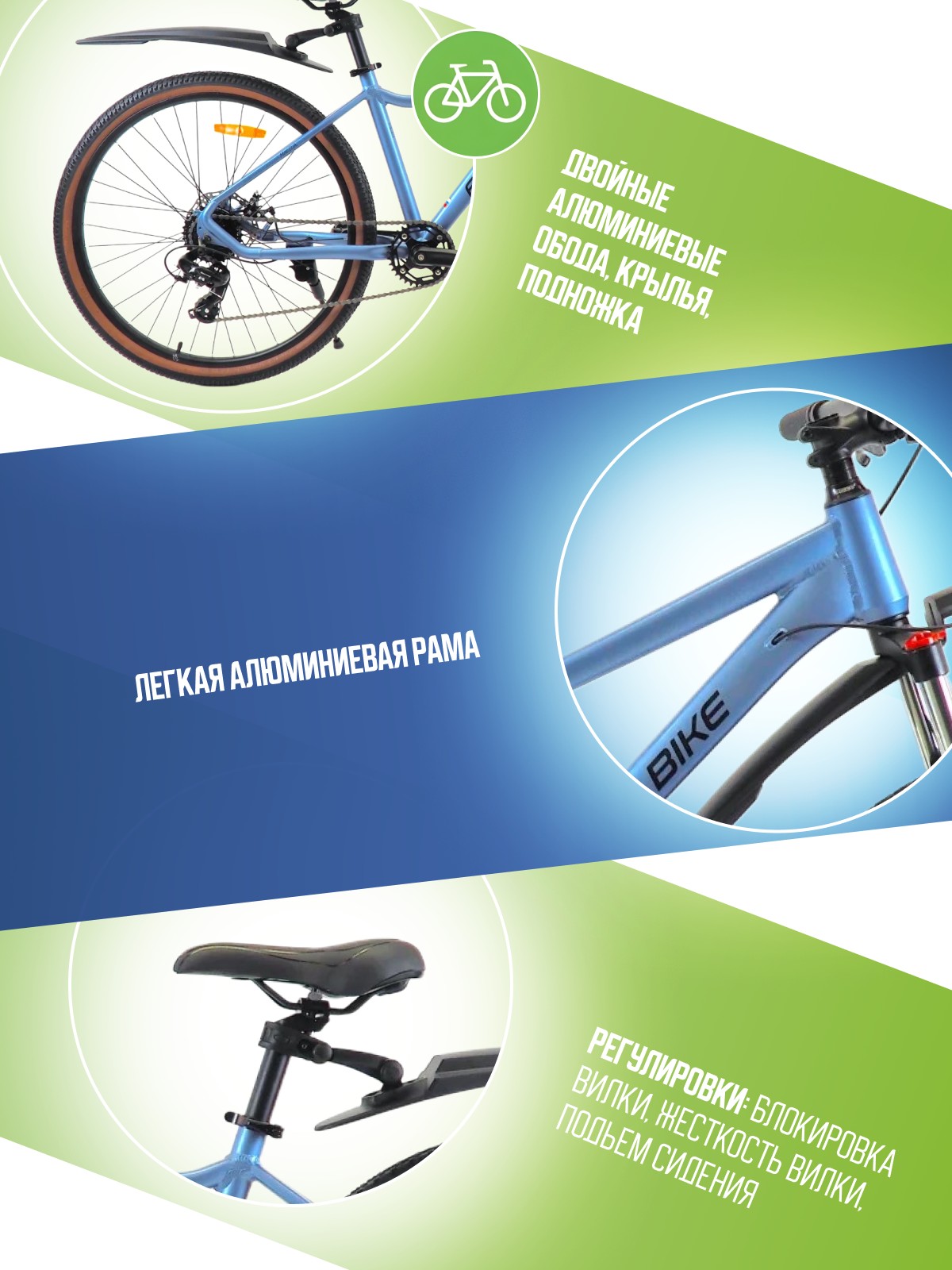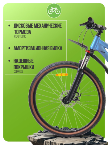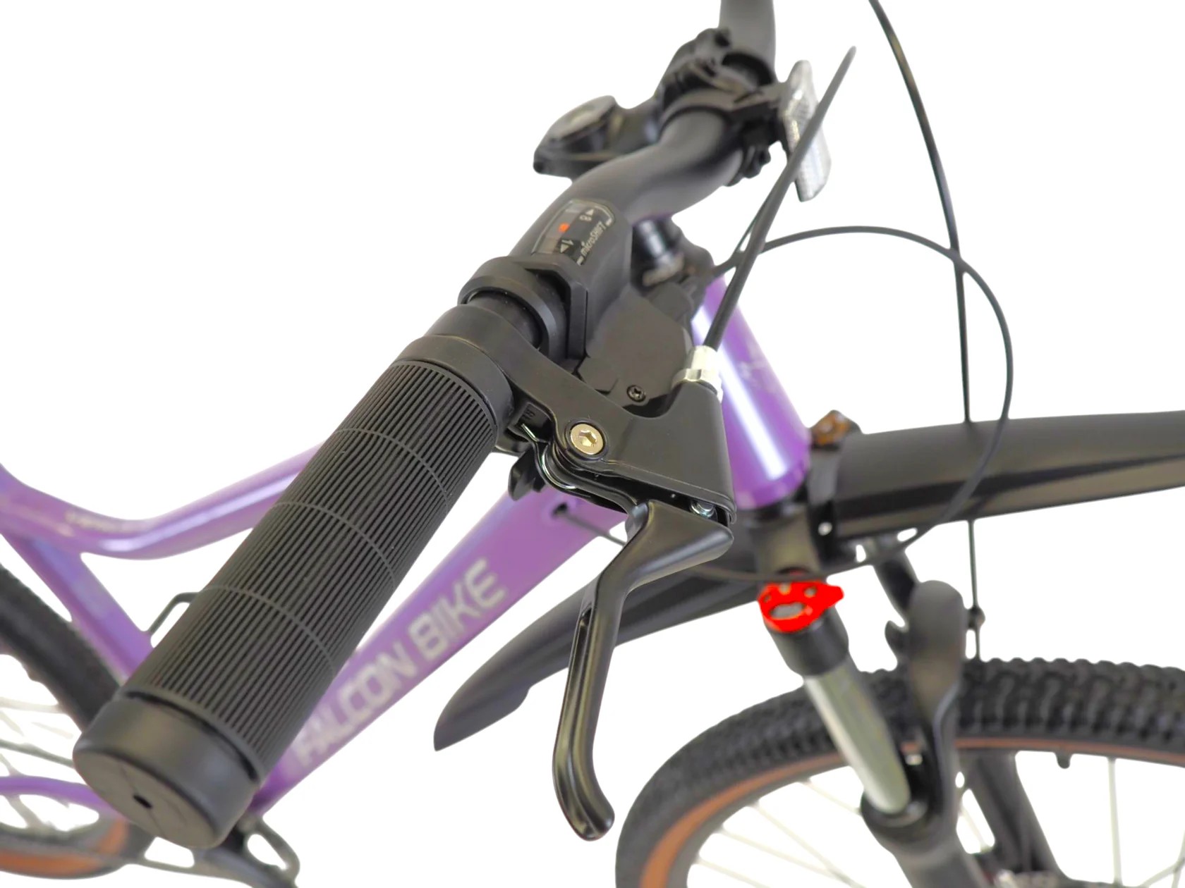 Женский горный велосипед с оборудованием начального класса Shimano/Microshift, 8 скоростей. Технические особенности: легкая алюминиевая рама (скрытая проводка, прямой рулевой стакан, кареточный стакан BSA, съемный петух, крепление калипера PM), амортизационная вилка (пружинно-эластомерная, ход 100 мм, механическая блокировка, регулировка преднагрузки, крепление калипера PM), двойные алюминиевые обода (под AV ниппель), дисковые механические тормоза Repute DSC (роторы 160/160 мм), пластиковые крылья, катафоты, подножка. Подходит для активной езды по различным дорогам и пересеченной местности. Диаметр колес - 27,5 дюймов. Вес - 14,9 кг.