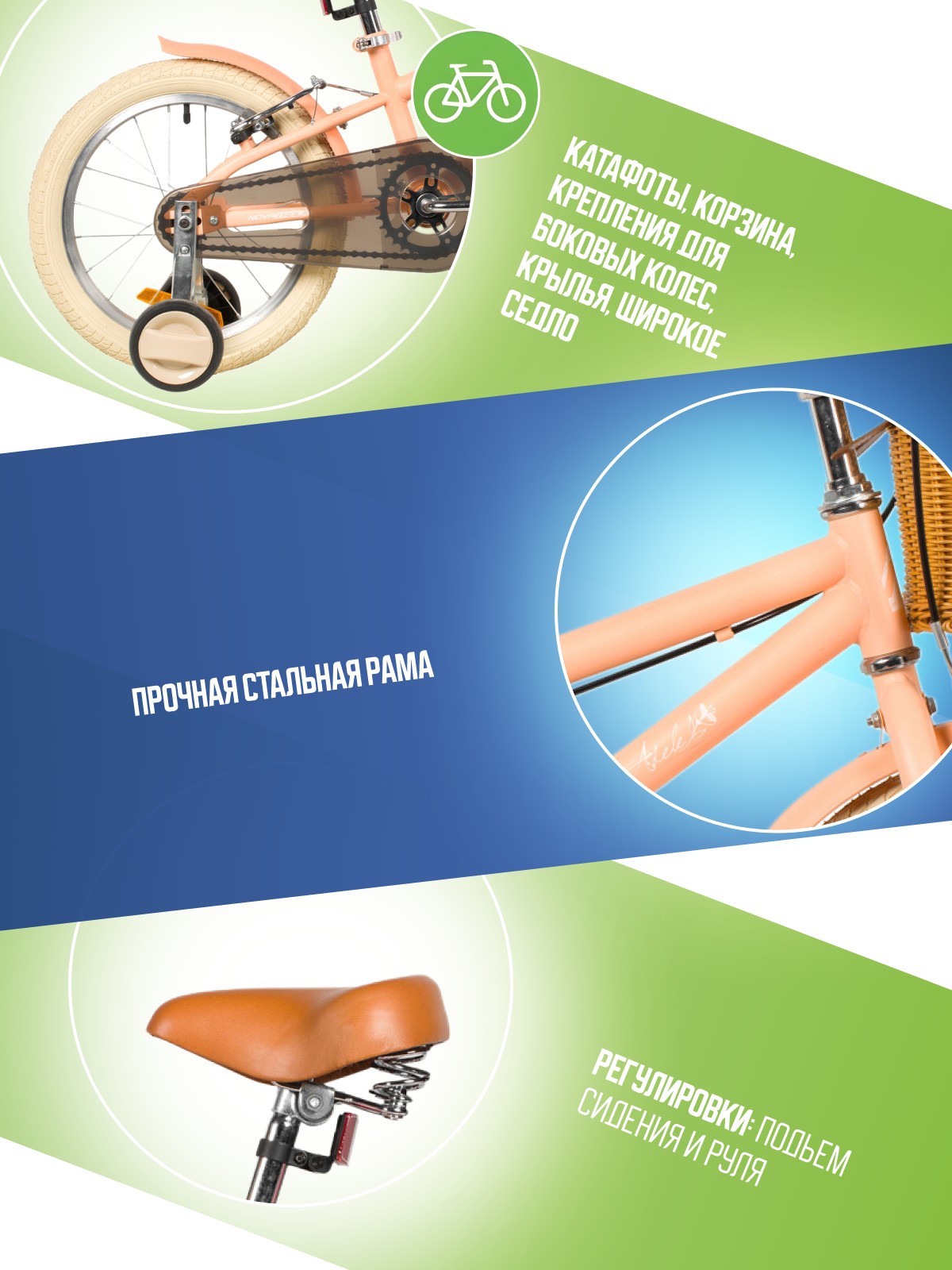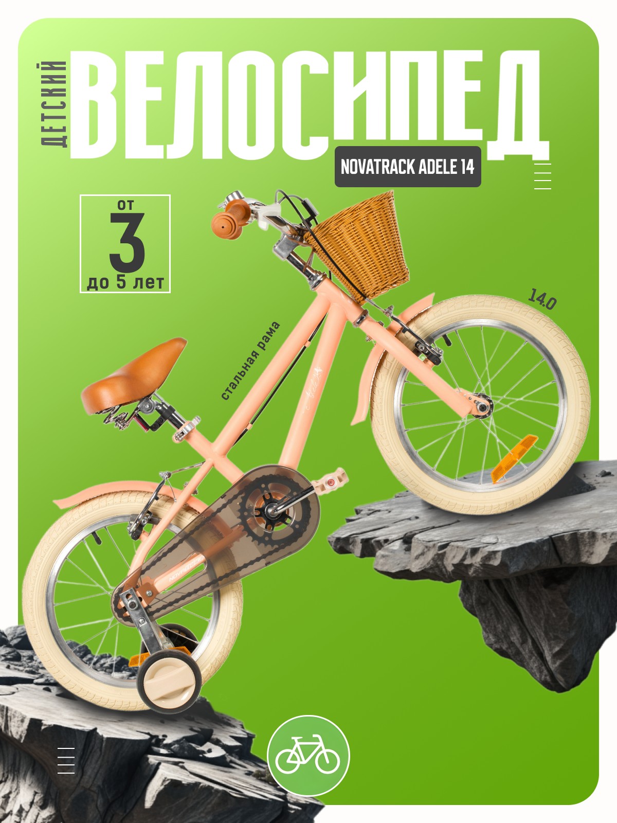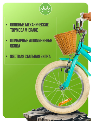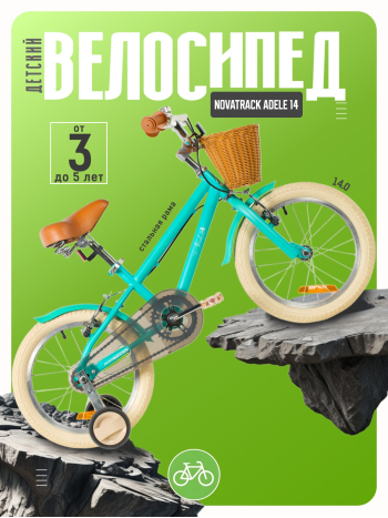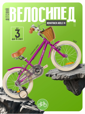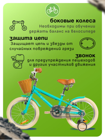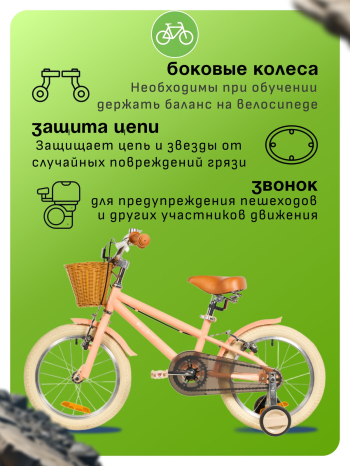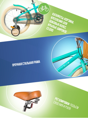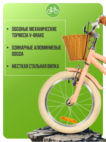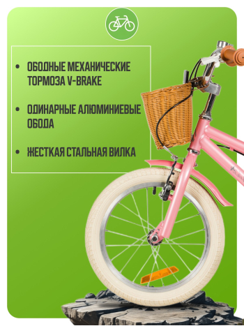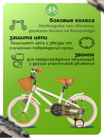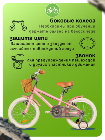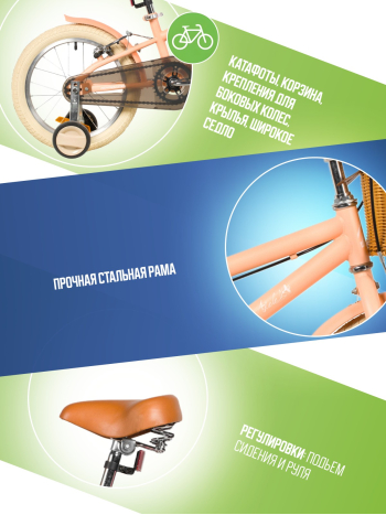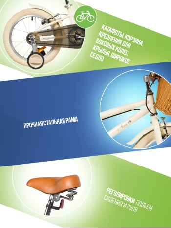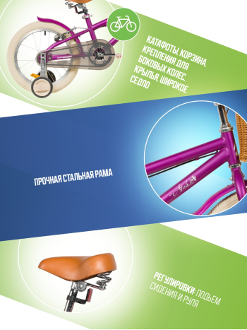 Велосипед, предназначенный для детей в возрасте от двух до четырех лет, без переключения передач. Технические особенности: прочная стальная рама, жесткая стальная вилка, одинарные алюминиевые обода (ниппель AV), ободные механические тормоза V-brake, полная защита цепи, съемные боковые колеса, крылья, передняя корзинка, звонок, катафоты. Подходит для обучения и прогулочного катания в городских условиях. Диаметр колес - 14 дюймов. Вес - 10 кг.